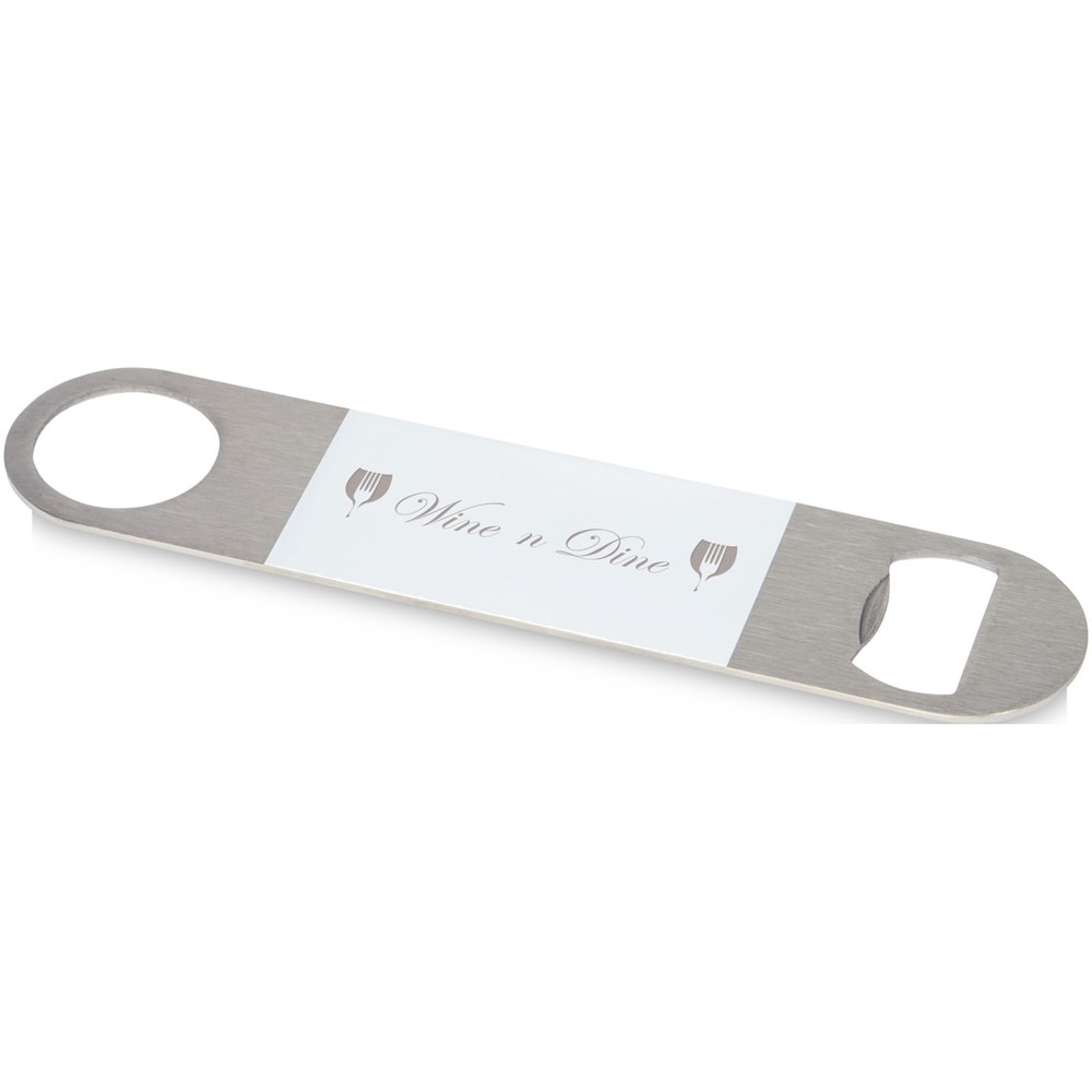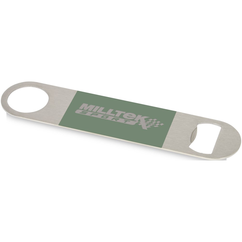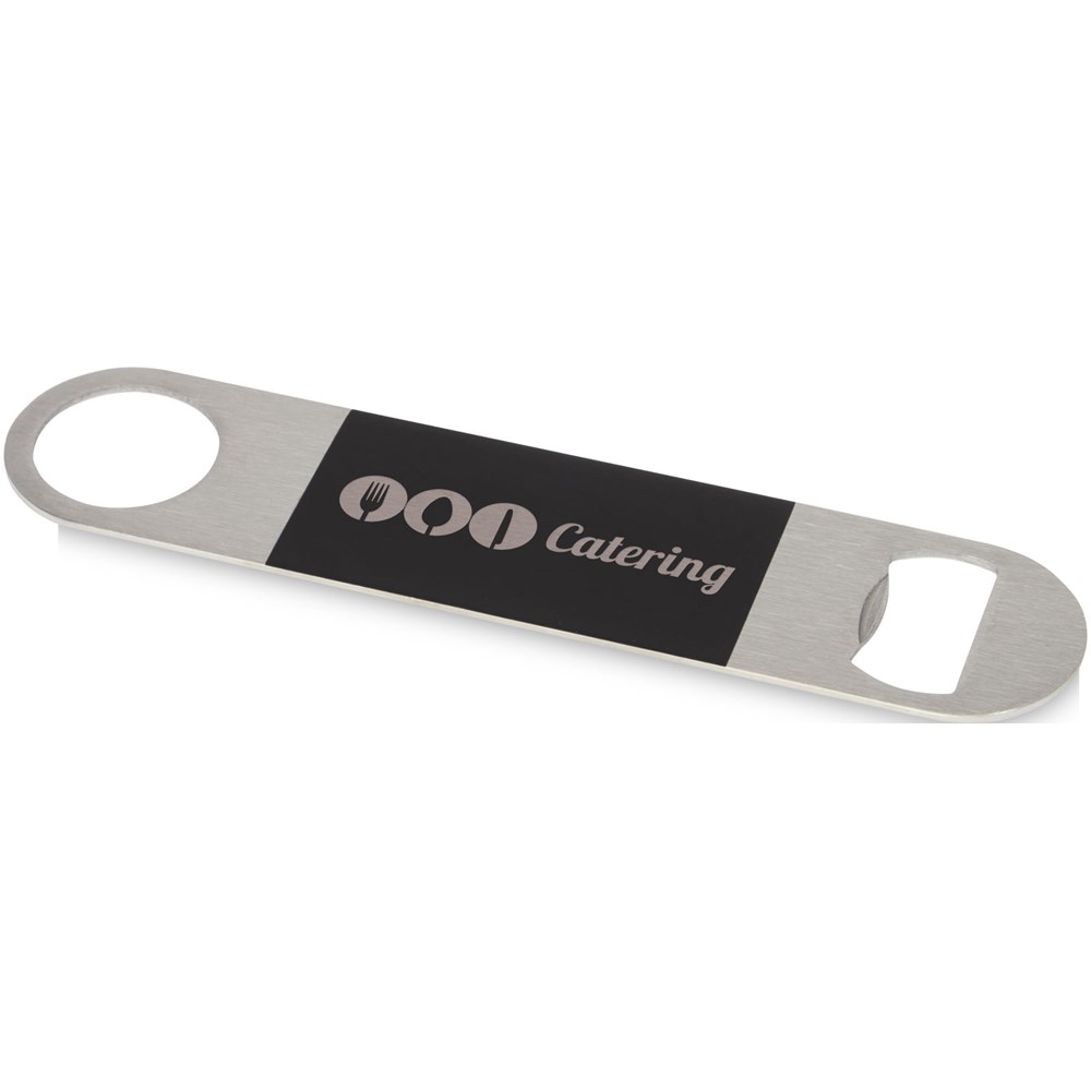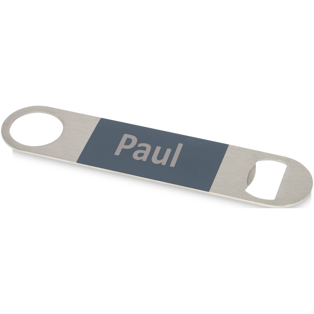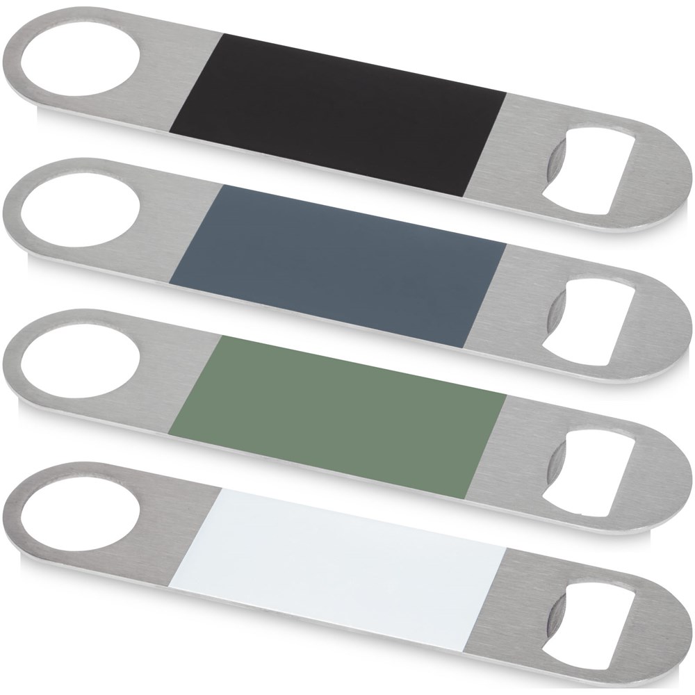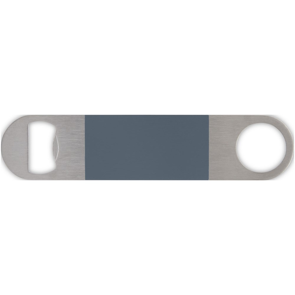 Flesopener van roestvrij staal met een groot gekleurd vlak in het midden.