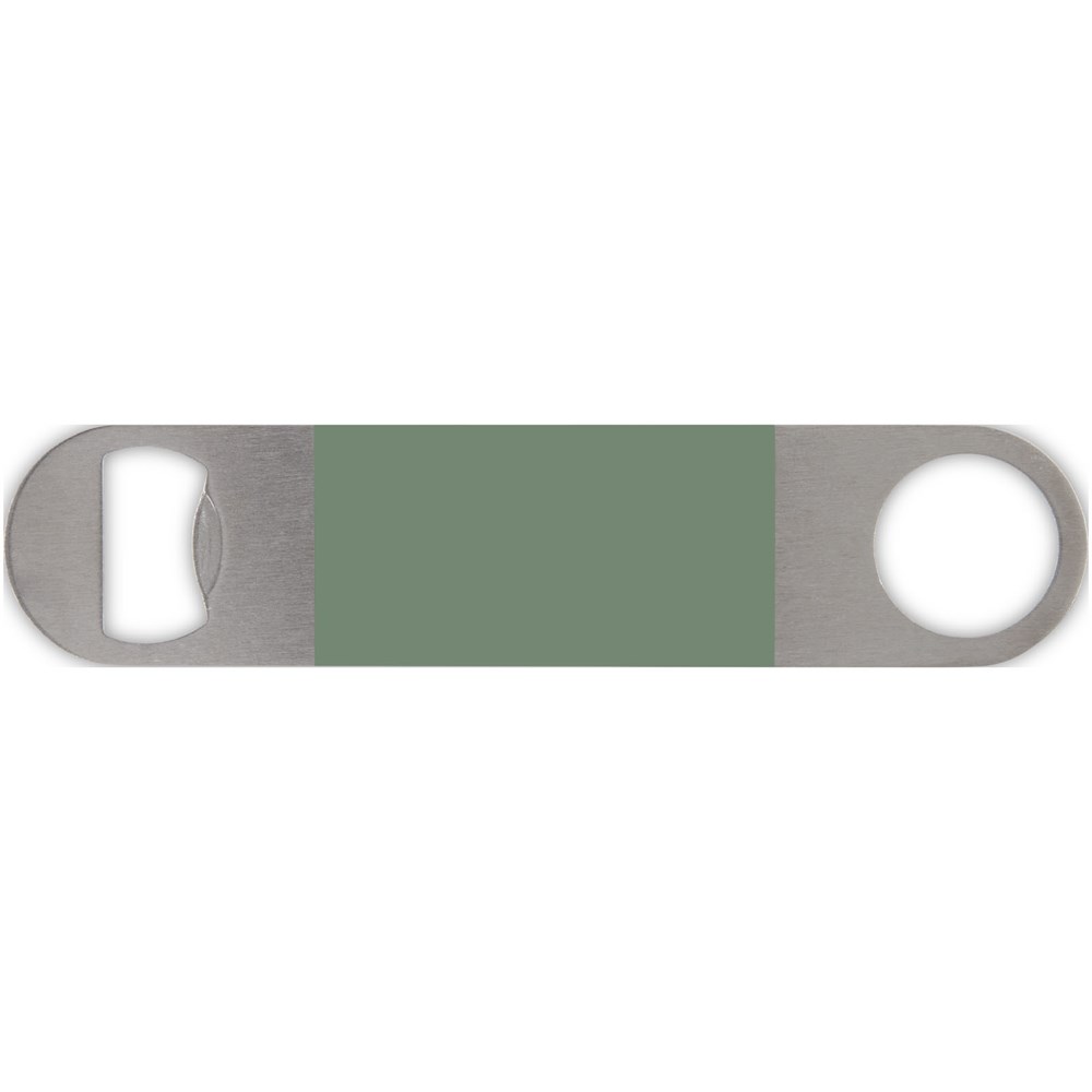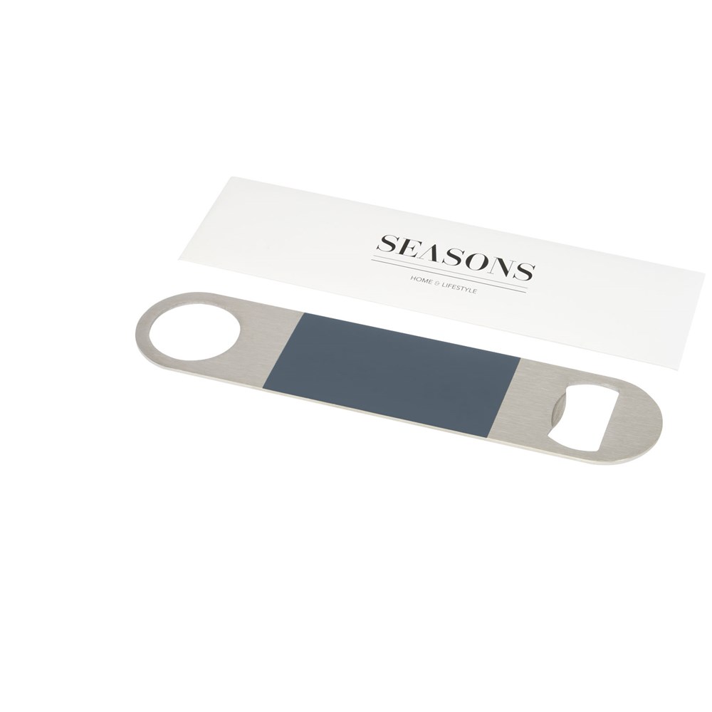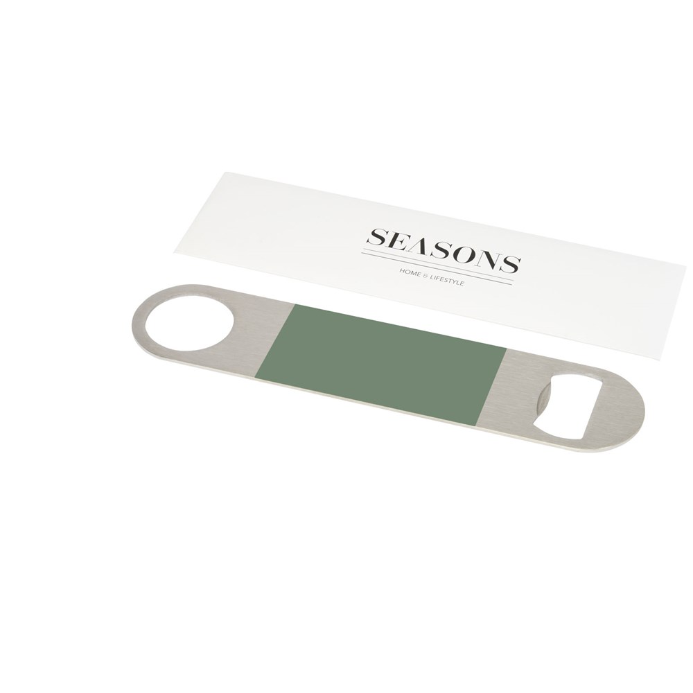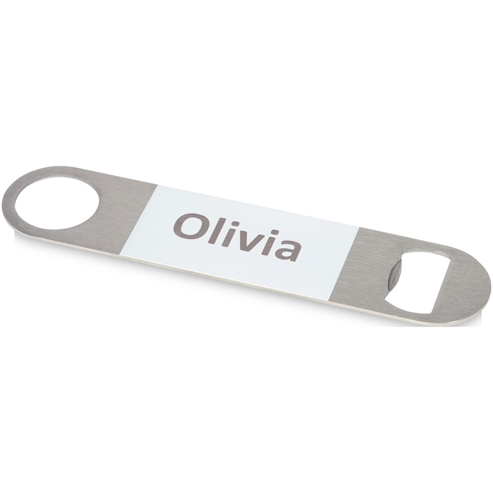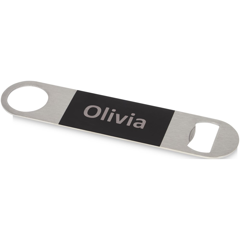 Flesopener van roestvrij staal met een groot gekleurd vlak in het midden.