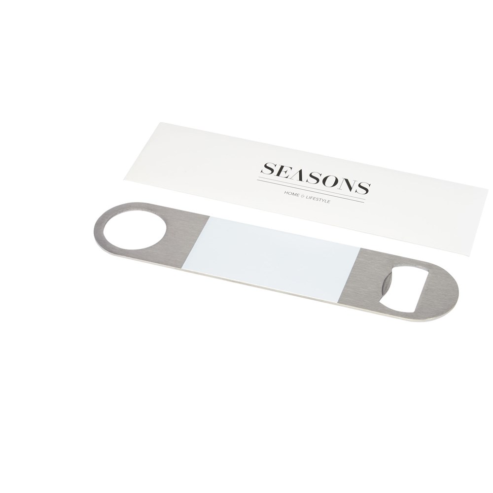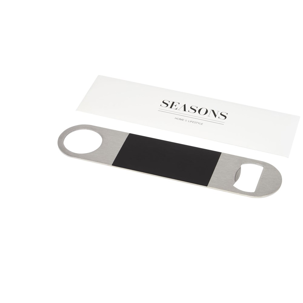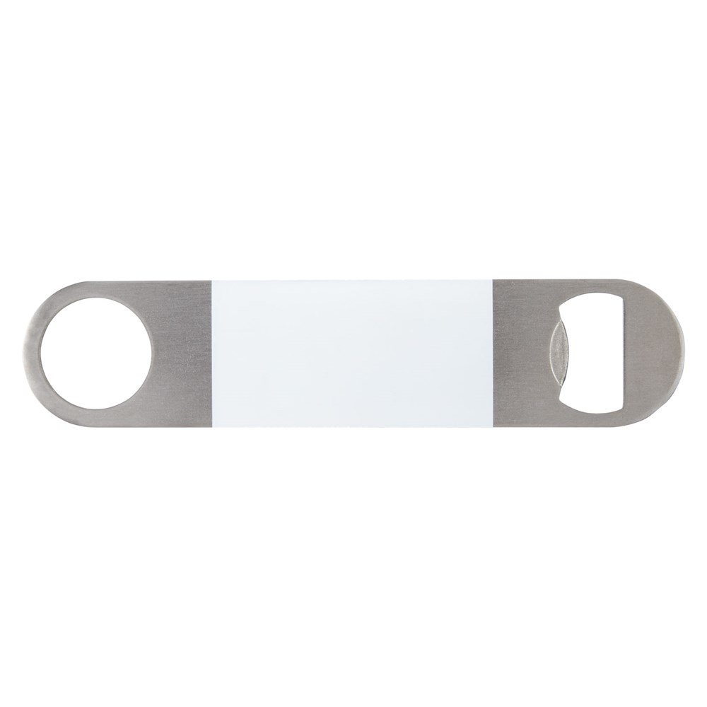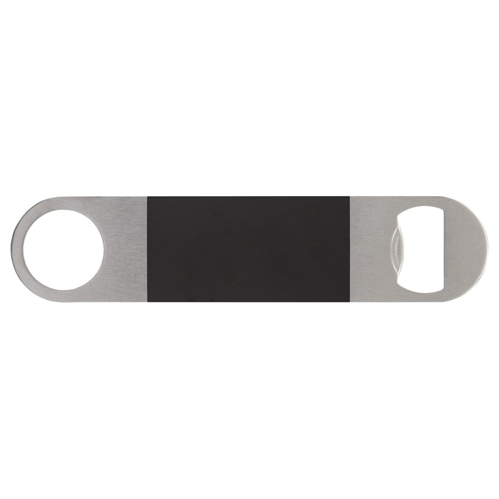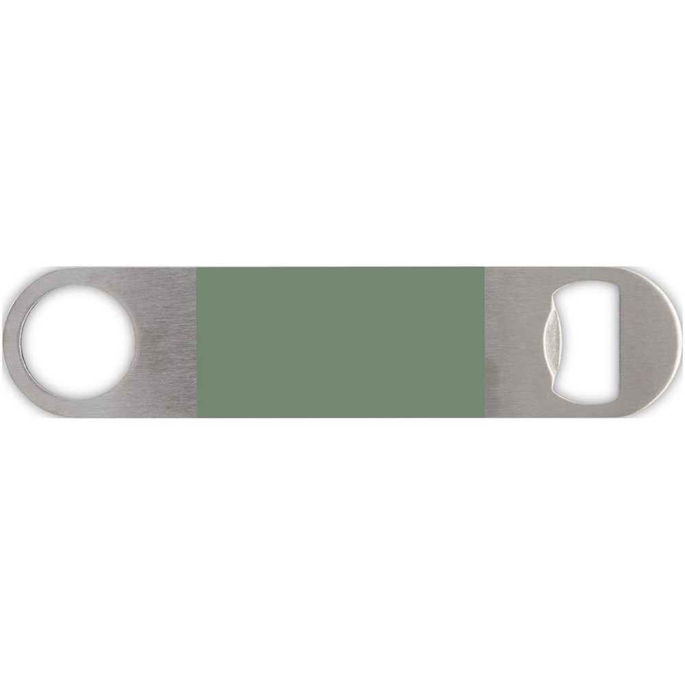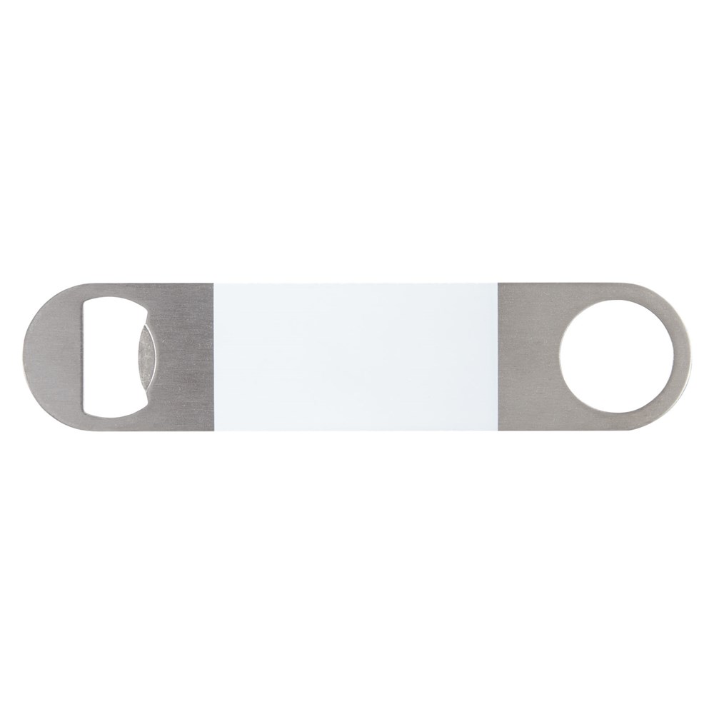 Flesopener van roestvrij staal met een groot gekleurd vlak in het midden.