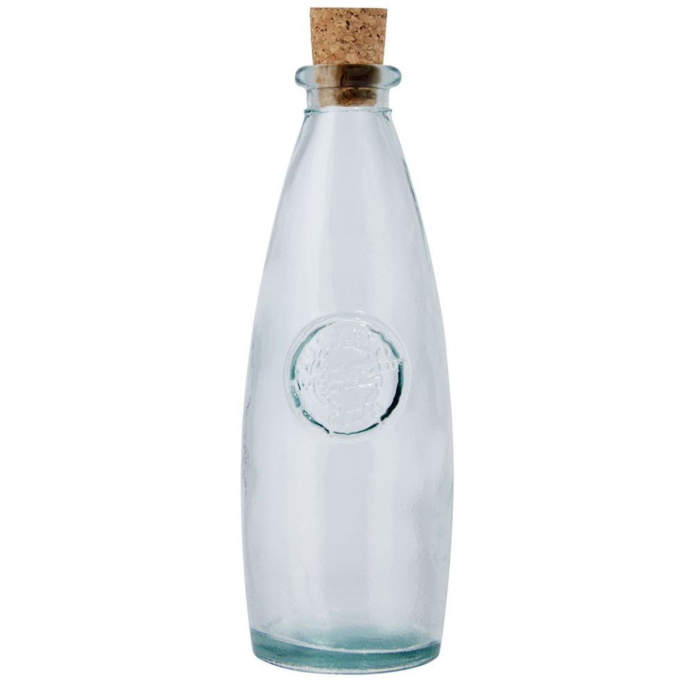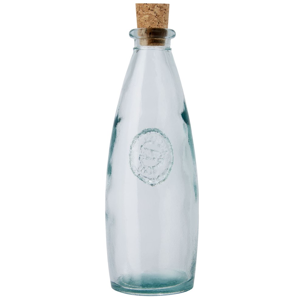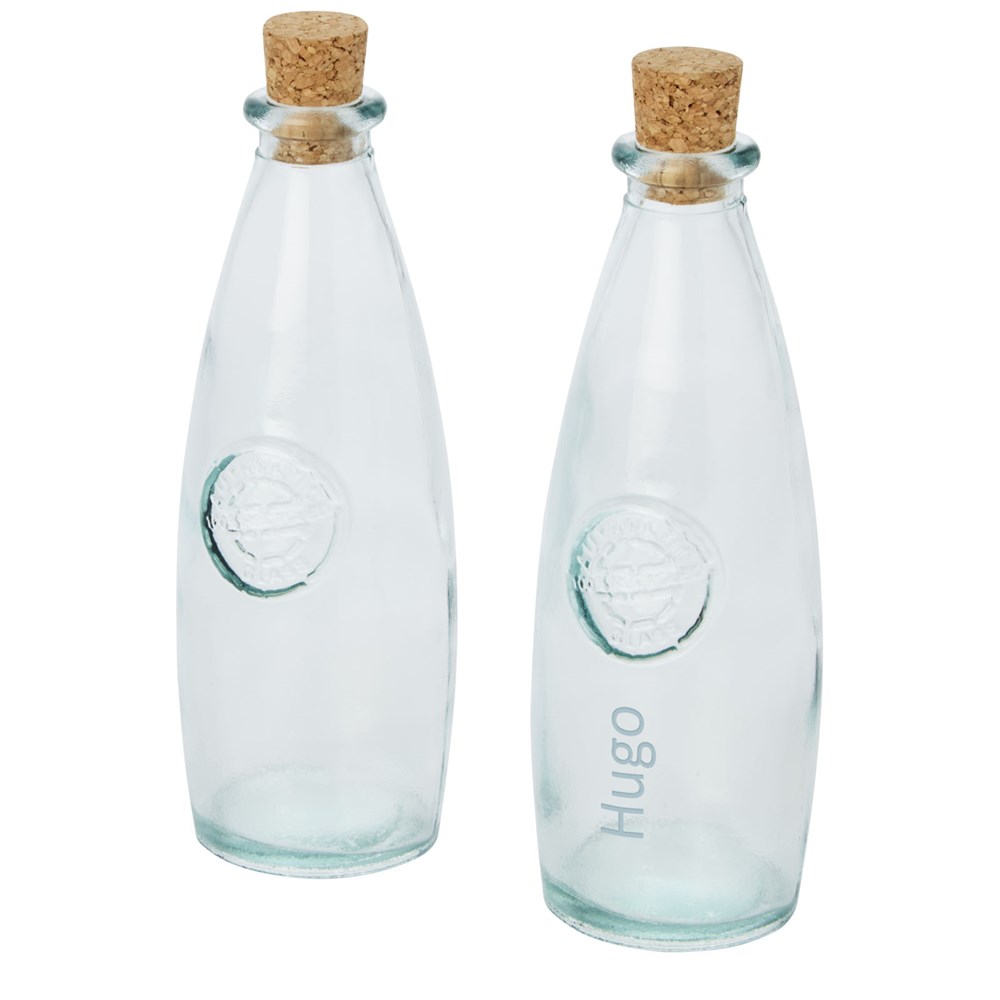 2-delige set van gerecycled glas met twee olie- en azijncontainers van 300 ml met kurken deksel. Gemaakt van 1 glazen fles. Gerecycled glas wordt geproduceerd met minder energie, grondstoffen en toevoegingen, dan wat nodig is voor het maken van traditioneel glas. Afmetingen container: hoogte 18 cm, diameter 6,5 cm.