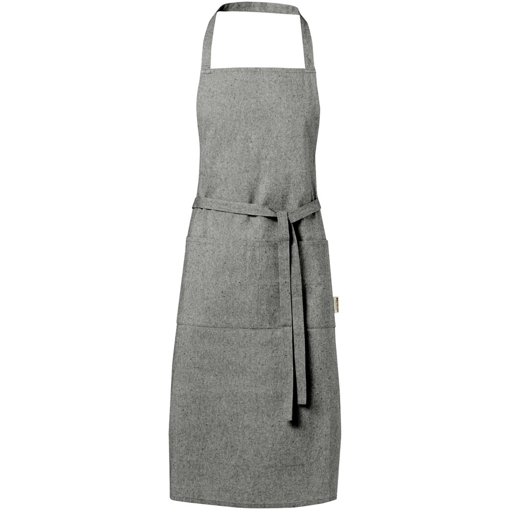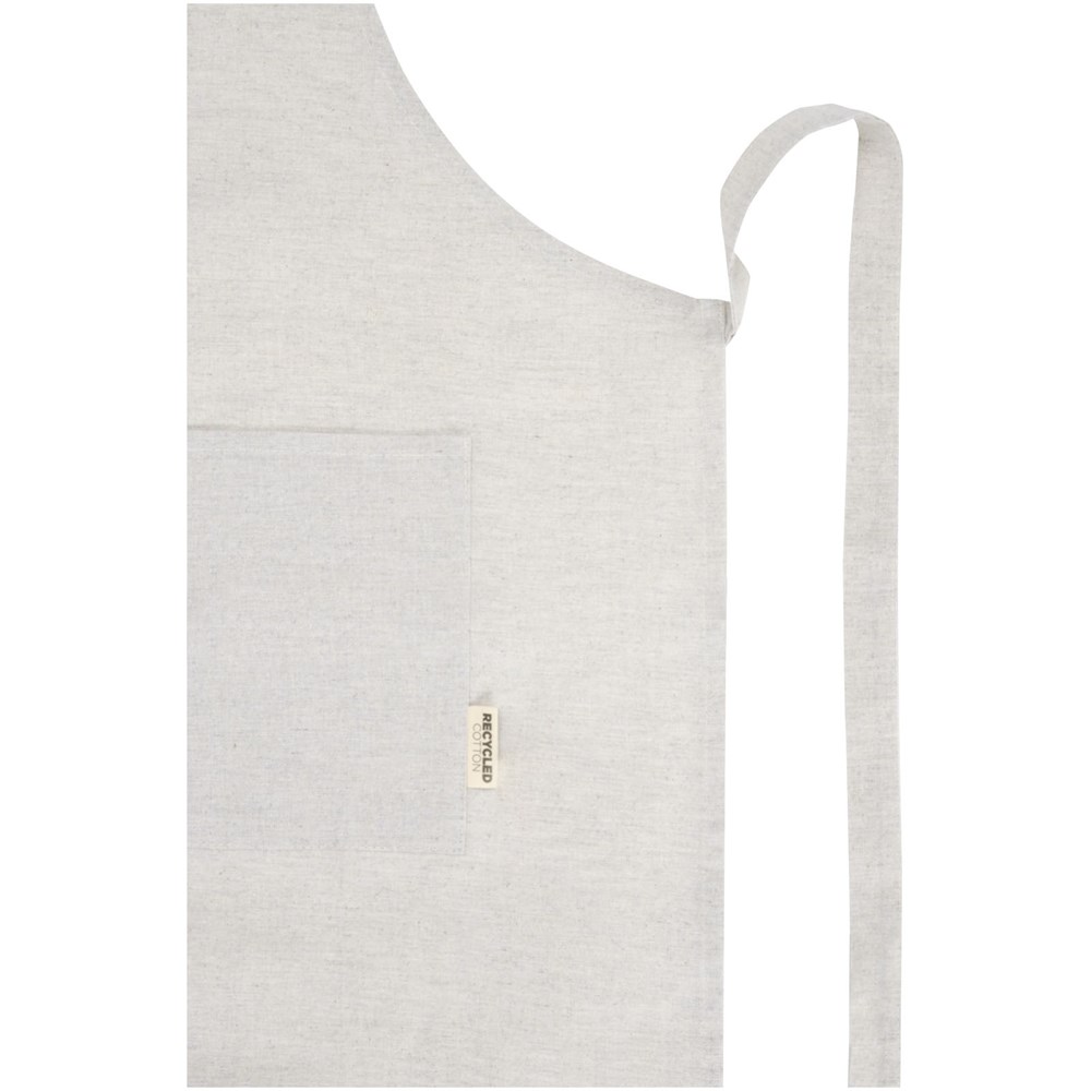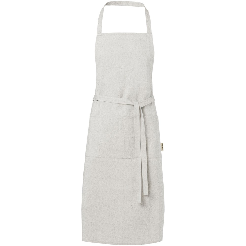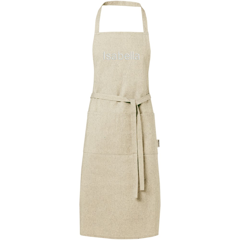 Schort gemaakt van een mix van gerecycled katoen en polyester van 200 g/m². Beschikt over 2 aangrenzende zakken met een gecombineerde afmeting van 45 x 20 cm en een bandsluiting van 1 meter aan de achterkant. Gerecycled katoen wordt vervaardigd uit voor consumenten bestemd afval dat in textielfabrieken tijdens het snijproces wordt geproduceerd. Vanwege de aard van gerecycled katoen, kan er sprake zijn van een zeer lichte kleurvariatie. Dit kenmerkt draagt duidelijk bij aan een authentiekere uitstraling. Lengte van de nekband: 55 cm.