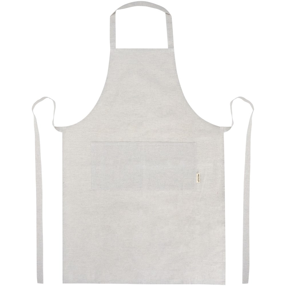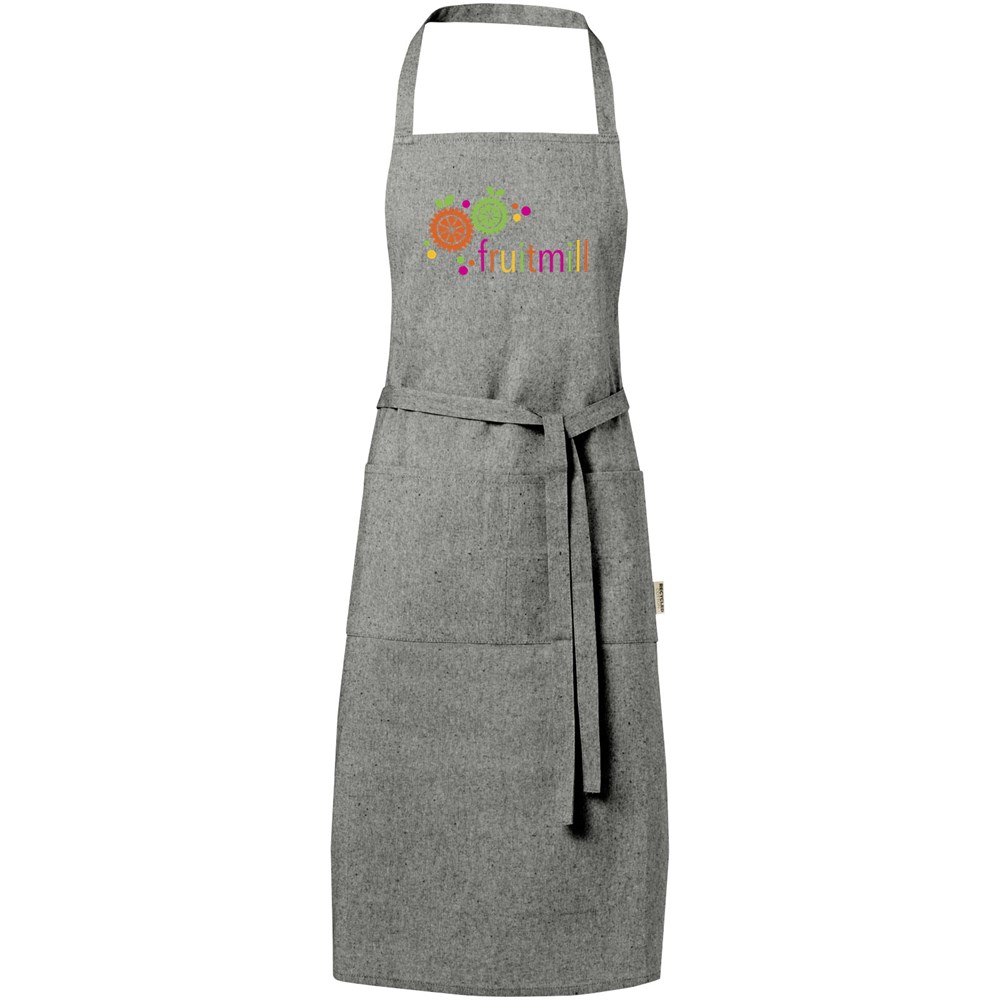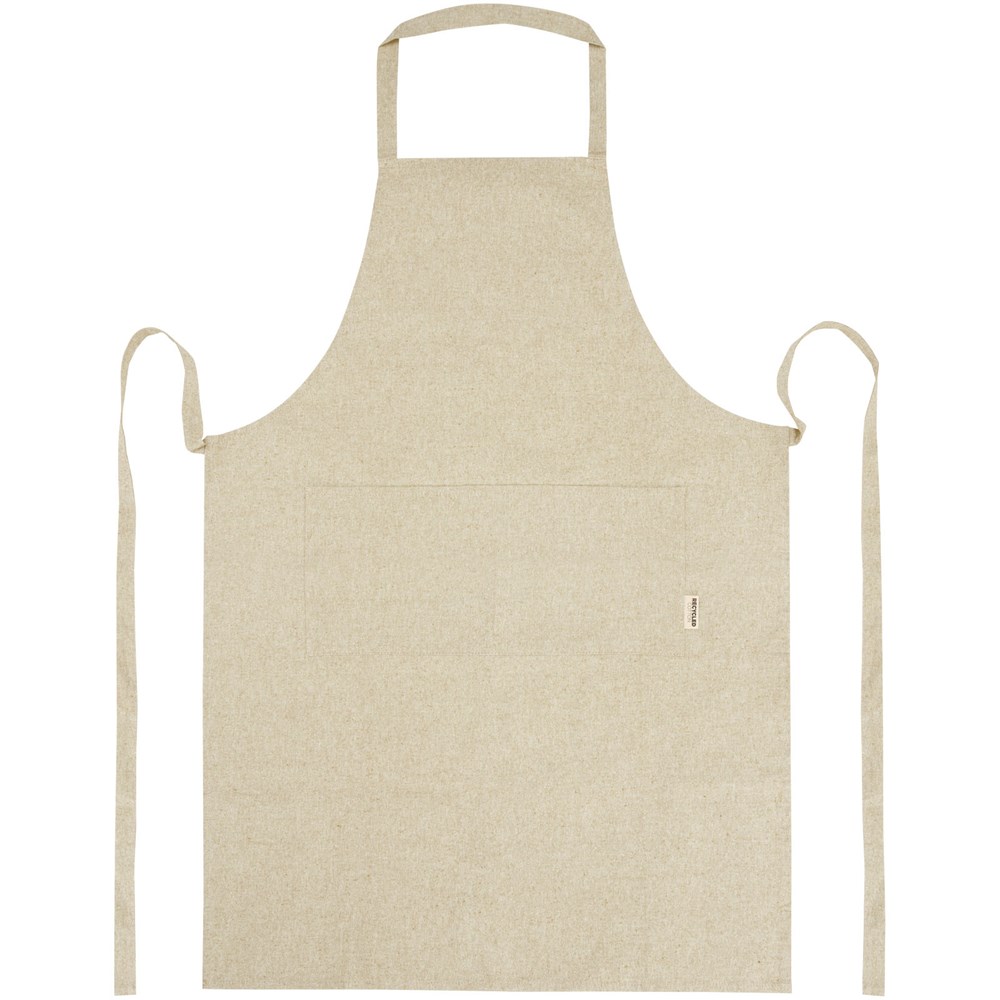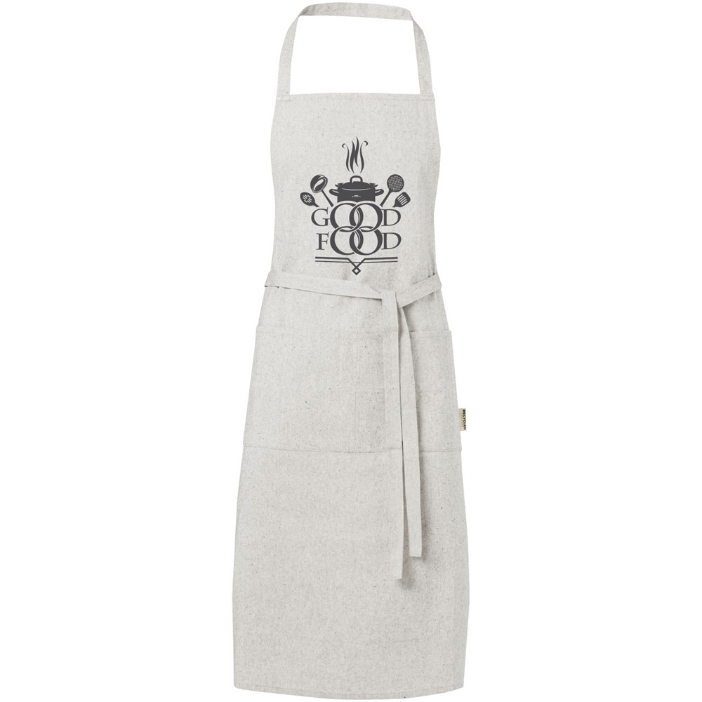 Schort gemaakt van een mix van gerecycled katoen en polyester van 200 g/m². Beschikt over 2 aangrenzende zakken met een gecombineerde afmeting van 45 x 20 cm en een bandsluiting van 1 meter aan de achterkant. Gerecycled katoen wordt vervaardigd uit voor consumenten bestemd afval dat in textielfabrieken tijdens het snijproces wordt geproduceerd. Vanwege de aard van gerecycled katoen, kan er sprake zijn van een zeer lichte kleurvariatie. Dit kenmerkt draagt duidelijk bij aan een authentiekere uitstraling. Lengte van de nekband: 55 cm.