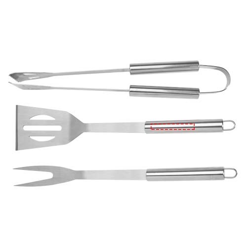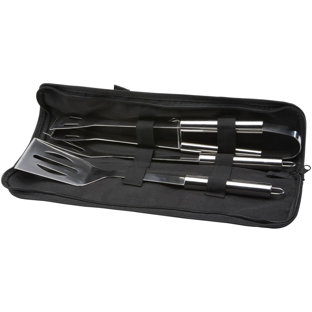 3-delige barbecueset met schep (34,8 x 7,5 cm), vork (35,4 x 3,35 cm) en een tang (35 x 6,8 x 4 cm). Alle accessoires worden geleverd in een lichtgewicht hoesje om ze makkelijk mee te nemen en op te bergen. Het perfecte barbecue-accessoire voor in de tuin of om mee te nemen om buiten te grillen met vrienden en familie.