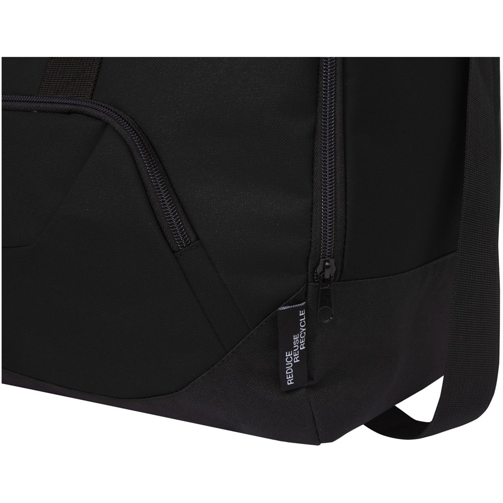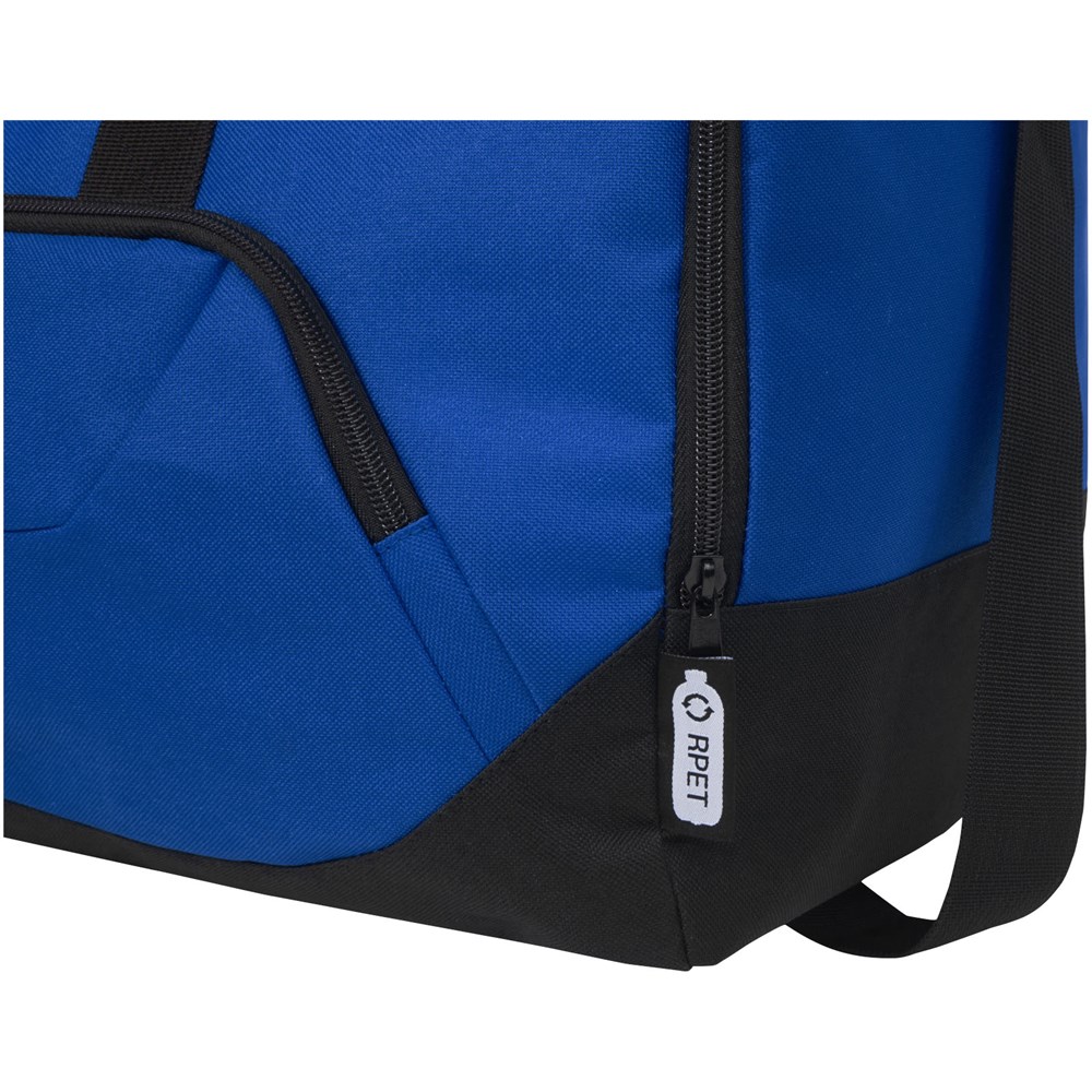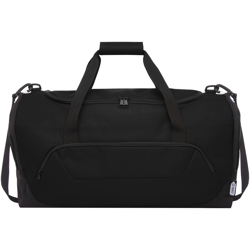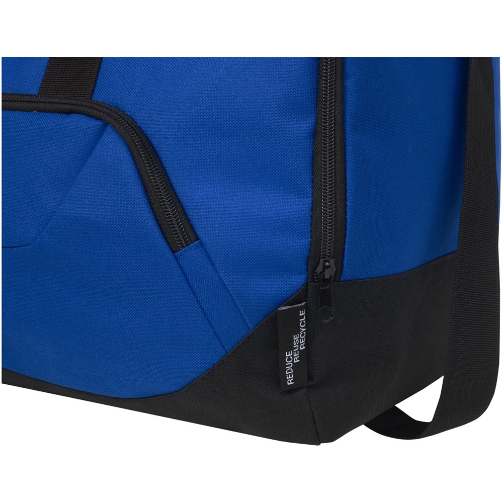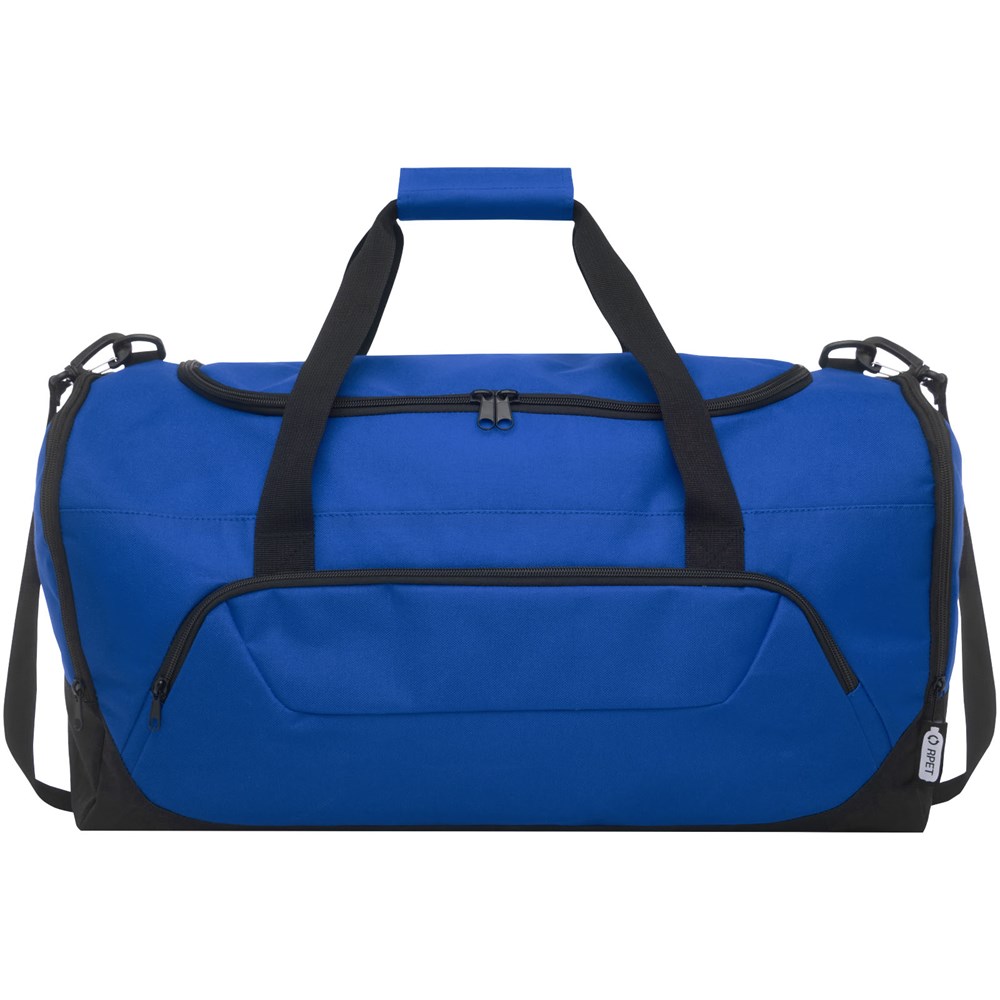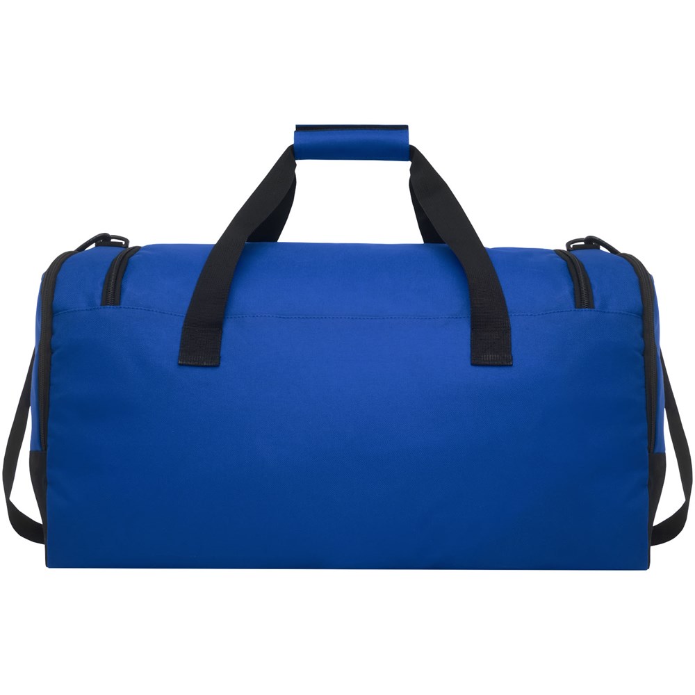 Duurzame duffel bag gemaakt van 100% gerecycled, van consumenten afkomstig plastic dat bijdraagt aan de vermindering van plastic afval. Met groot hoofdvak en voorvak met ritssluiting, gevoerde schouderriem en gevoerde handgrepen. Er worden ongeveer 27 flessen gerecycled om deze tas te maken.