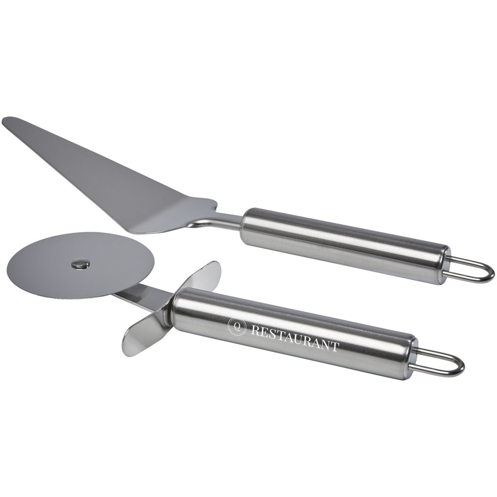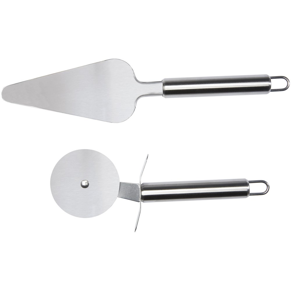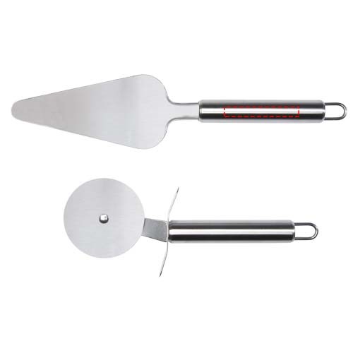 Pizzaset met pizzasnijder en pizzaspatel, ook geschikt voor het snijden en serveren van taarten, wafels en deegkoekjes, waardoor het het perfecte keukenaccessoire is. De spatel heeft een driehoekige kegelvorm met een groot antislipoppervlak. Voor een veilige hantering heeft de snijder een ingebouwde vingerbescherming om de handen te beschermen tegen letsel. Beide gereedschappen zijn voorzien van ergonomische handgrepen voor een comfortabele grip en aan de onderkant van de handgrepen zit een gat waardoor het gereedschap eenvoudig aan de muur kan worden gehangen om ruimte te besparen in de keukenlades.