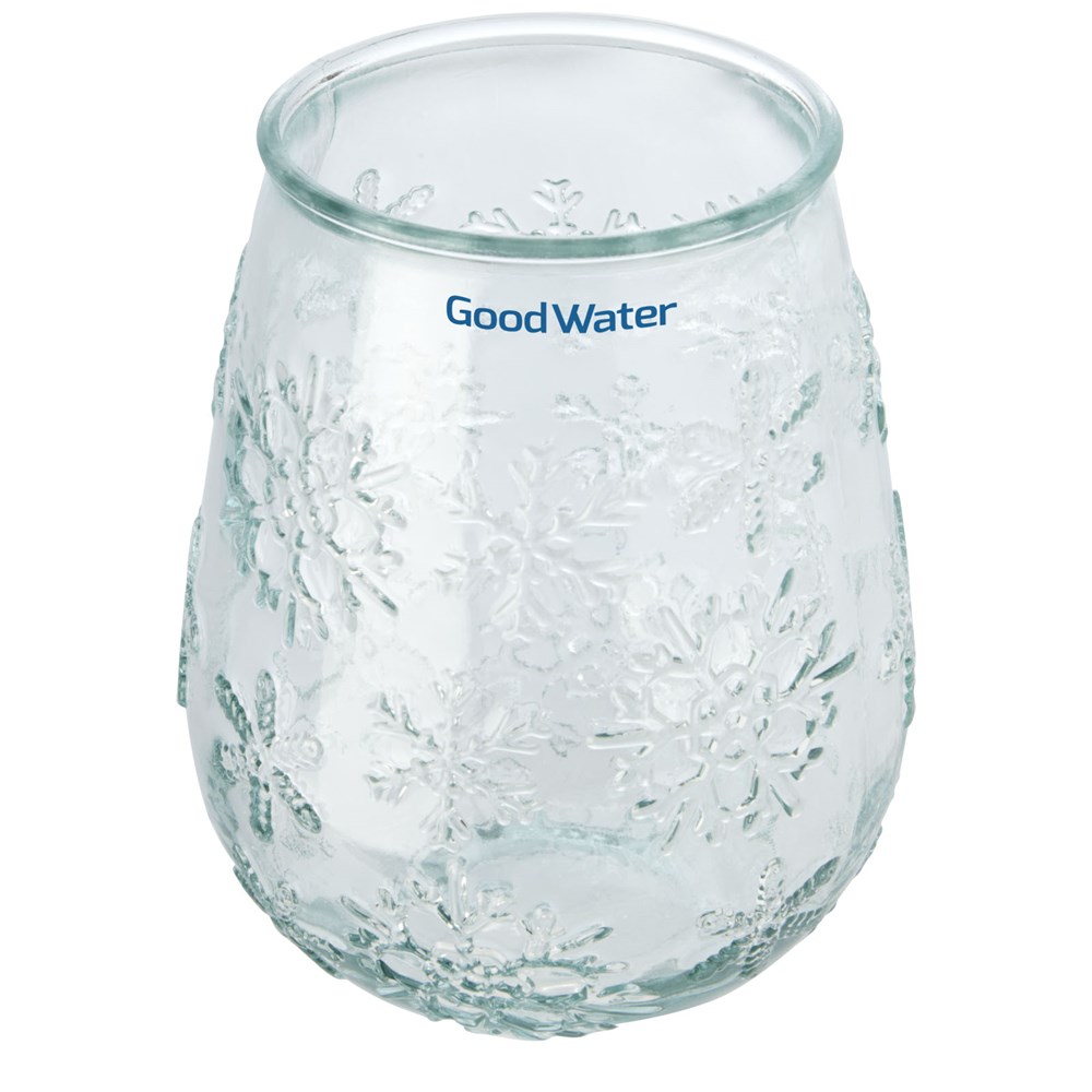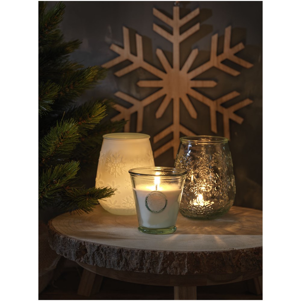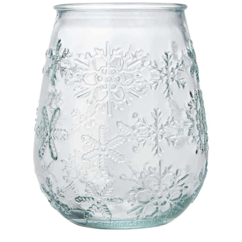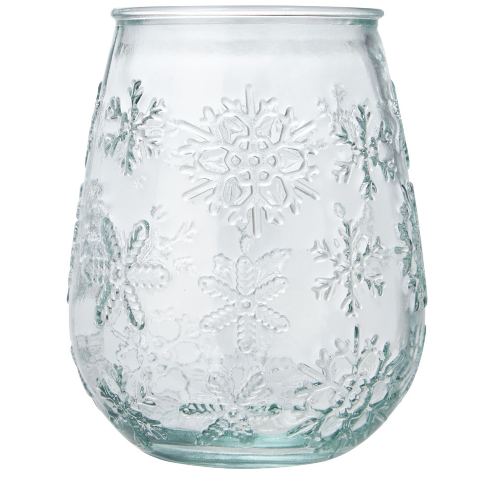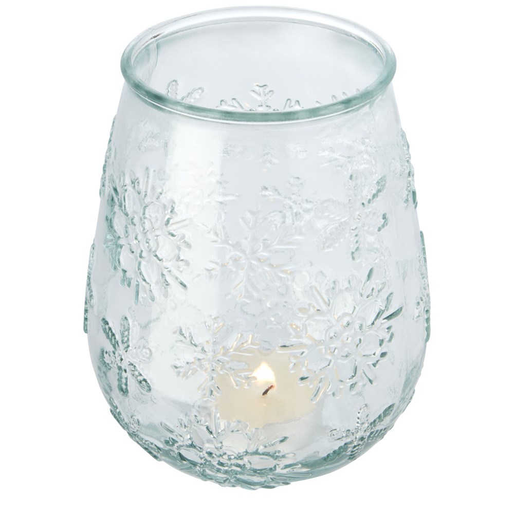Theelichthouder van gerecycled glas met sneeuwvlokeffect. Gemaakt van 1 glazen fles. Gerecycled glas wordt geproduceerd met minder energie, grondstoffen en toevoegingen, dan wat nodig is voor het maken van traditioneel glas. Theelichtje niet inbegrepen.