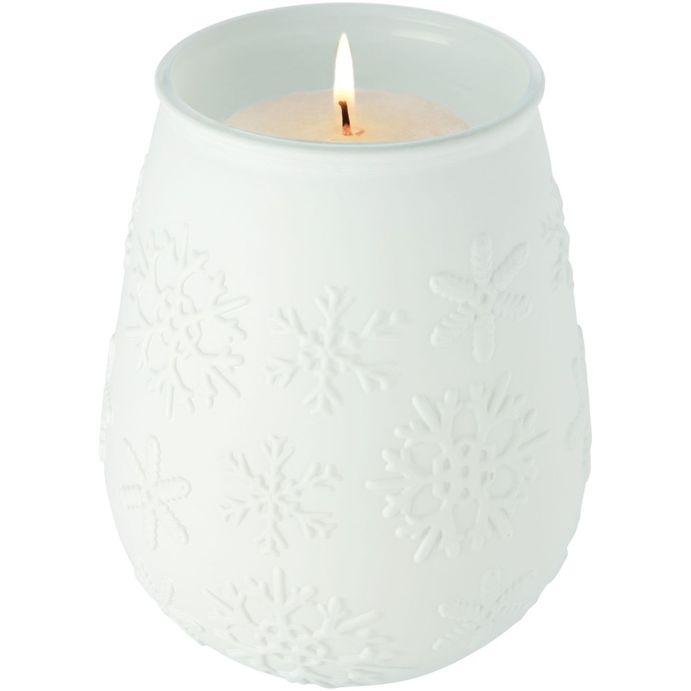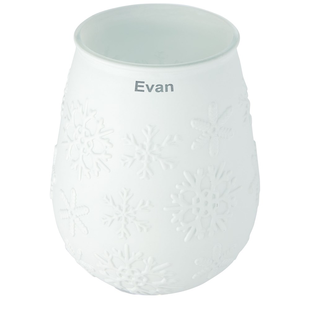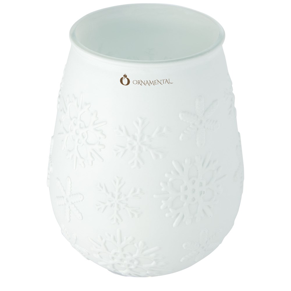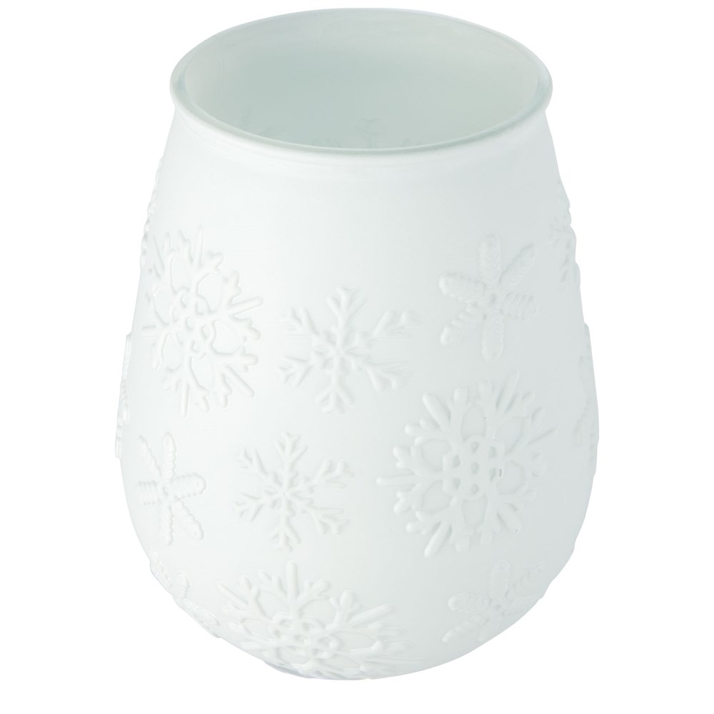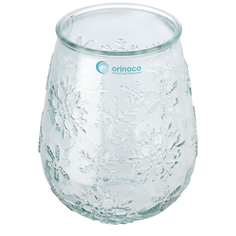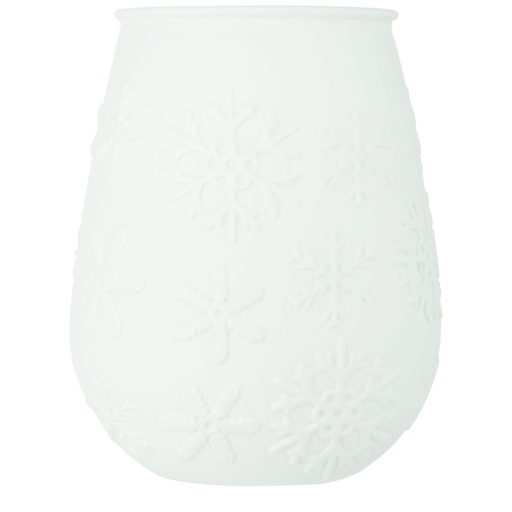 Theelichthouder van gerecycled glas met sneeuwvlokeffect. Gemaakt van 1 glazen fles. Gerecycled glas wordt geproduceerd met minder energie, grondstoffen en toevoegingen, dan wat nodig is voor het maken van traditioneel glas. Theelichtje niet inbegrepen.