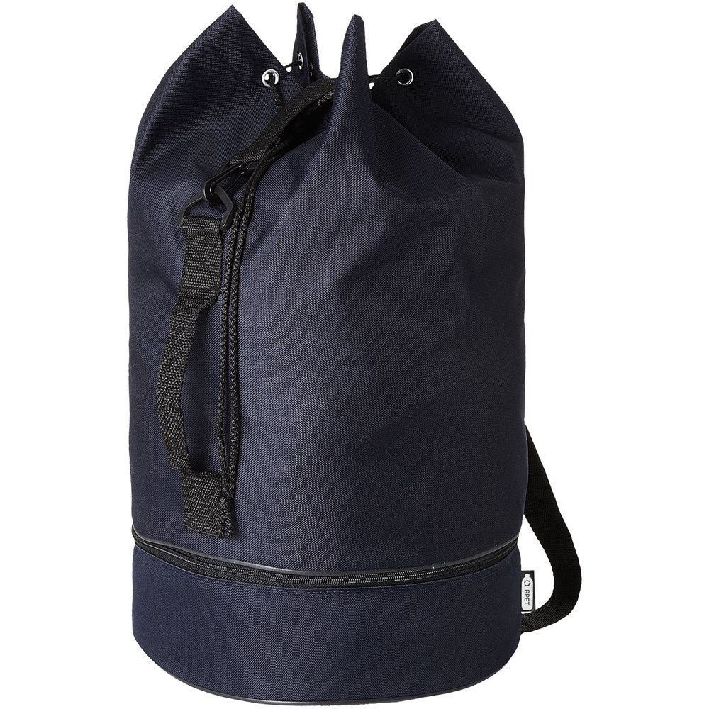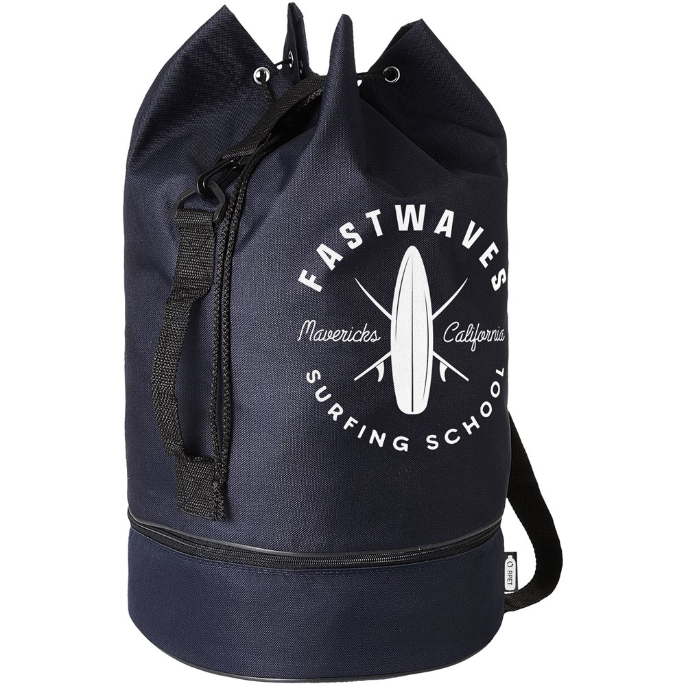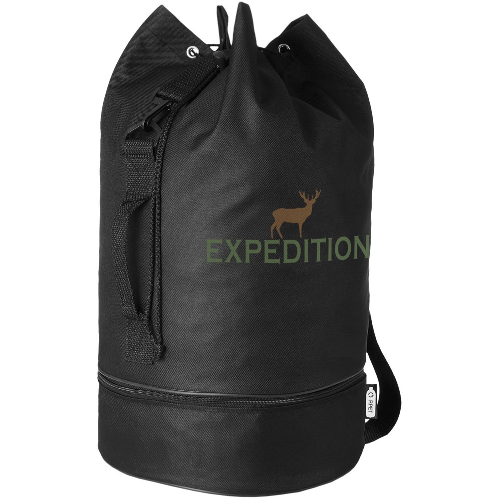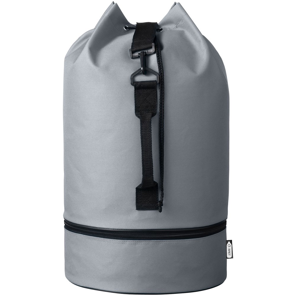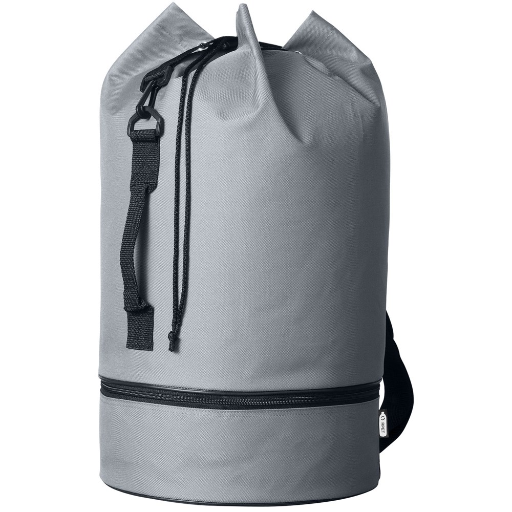 Waterbestendige duffel bag van gerecycled PET plastic met een ruim hoofdvak van 20 liter met trekkoordsluiting, zijgreep en verstelbare schouderband. Ook voorzien van een apart ondervak met ritssluiting voor kleinere spullen.