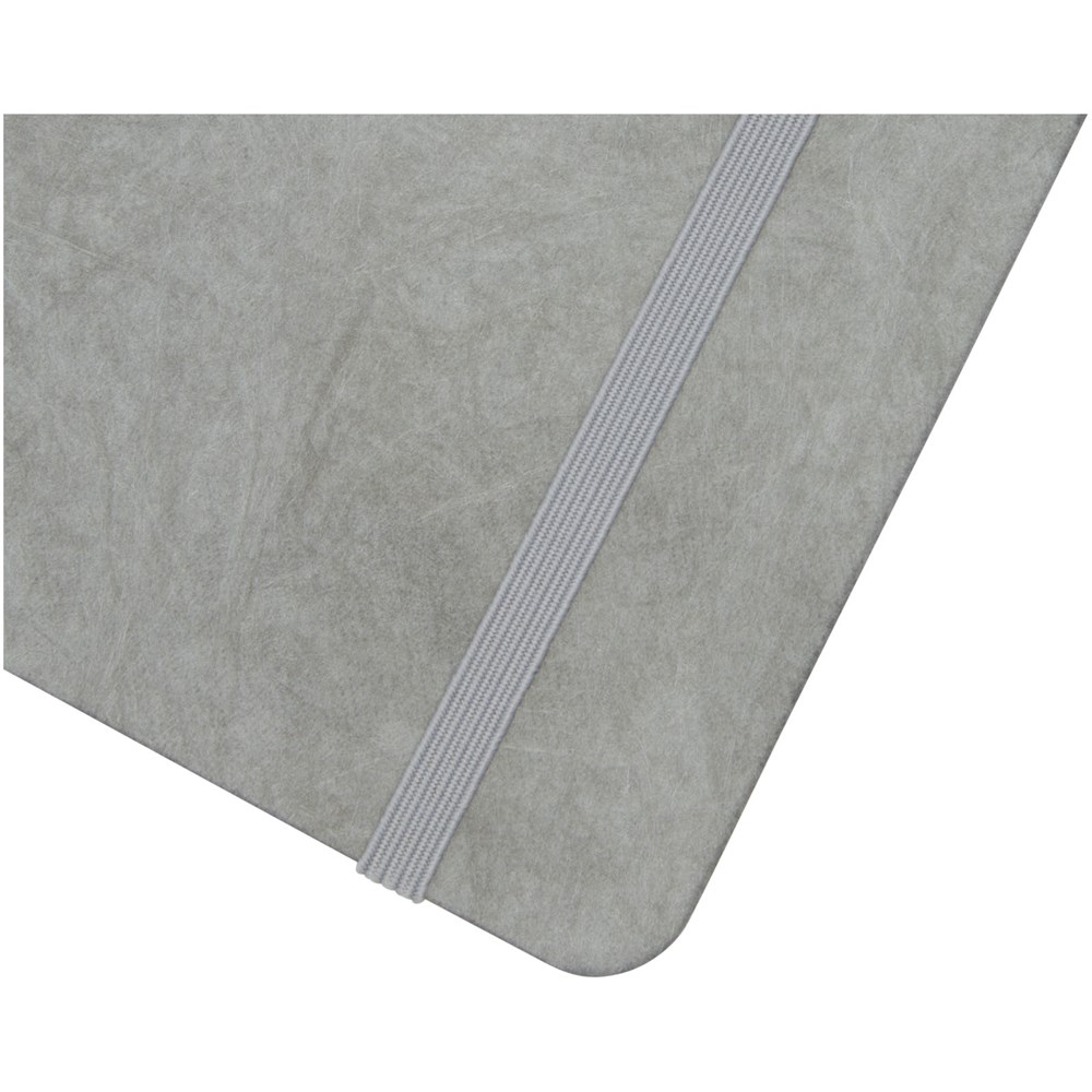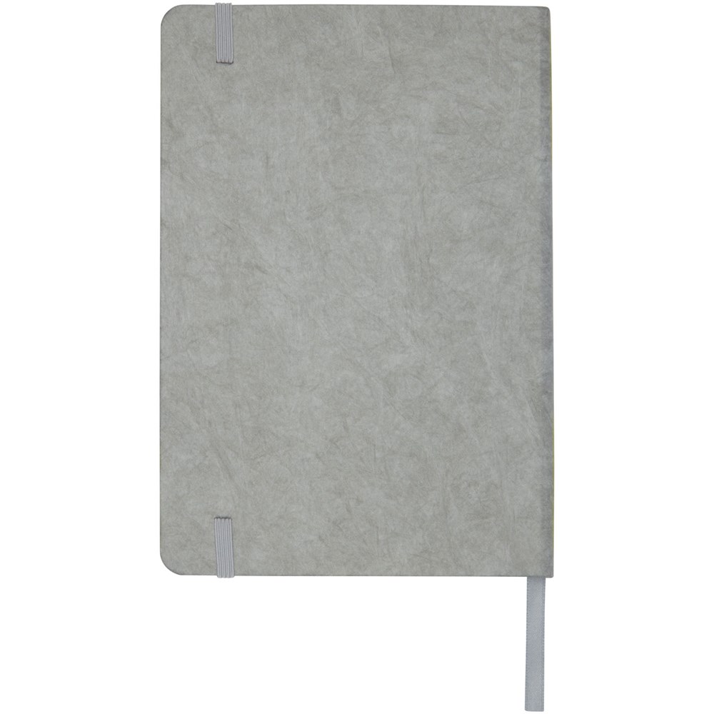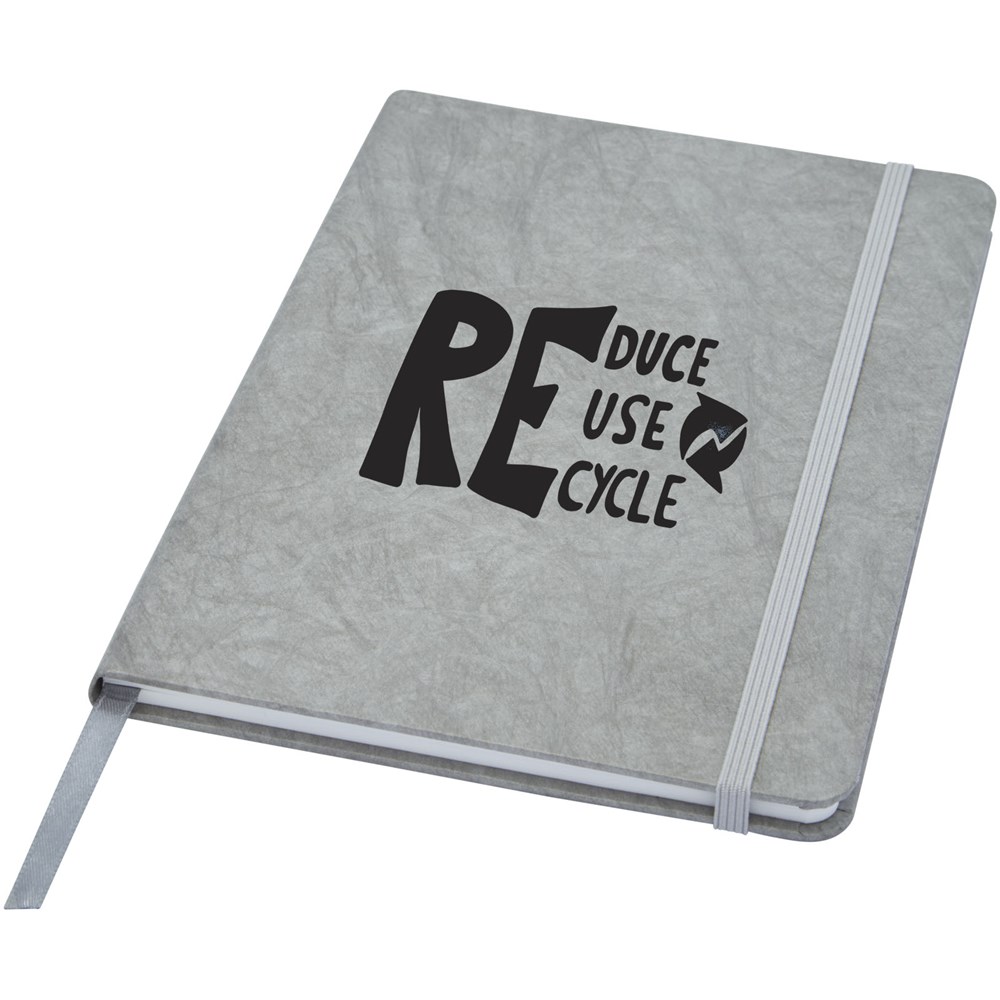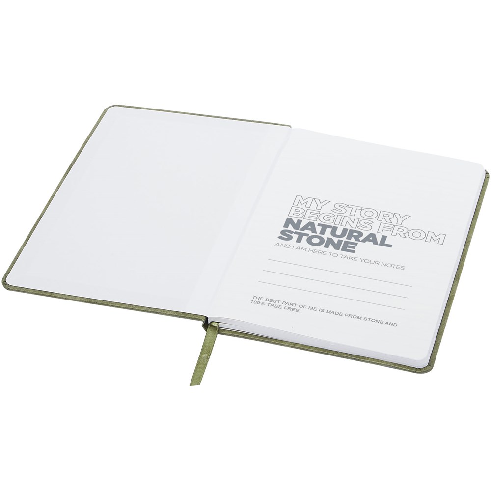 Scheurbestendig notitieboek in A5 formaat met binnenpagina's gemaakt van steen. Steenpapier is 100% boomvrij en het productieproces verbruikt minder energie in vergelijking met gerecycled of nieuw pulppapier. Het is waterbestendig, zodat gemorste vloeistoffen gemakkelijk kunnen worden afgeveegd. Met bijpassend kleurlint en elastische band en 60 vellen 120 g/m² gelijnd steenpapier. Verpakt in een kartonnen hoes.