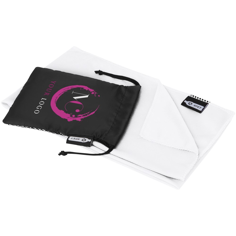 Snel absorberende, sneldrogende en wasbare koelhanddoek gemaakt van gerecycled PET. Wordt geleverd in een klein gerecycled PET pouch met sluiting voor gemakkelijk vervoer. Verkrijgbaar in 5 frisse kleuren. Grote decoratieruimte op het zakje (afmeting 15 x 11,5 cm). Decoratie ook mogelijk op de koelhanddoek zelf (afmeting 80 x 30 cm).