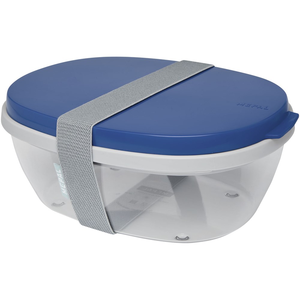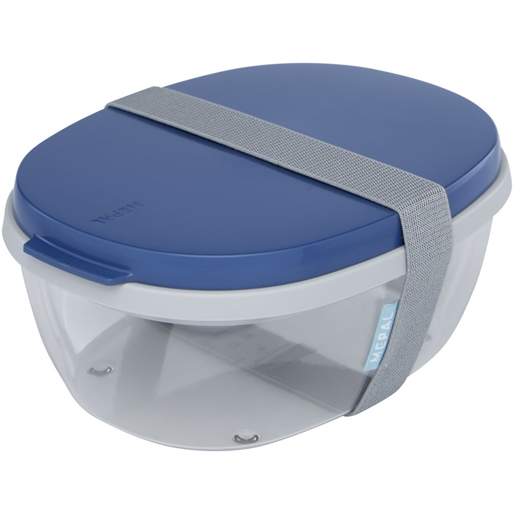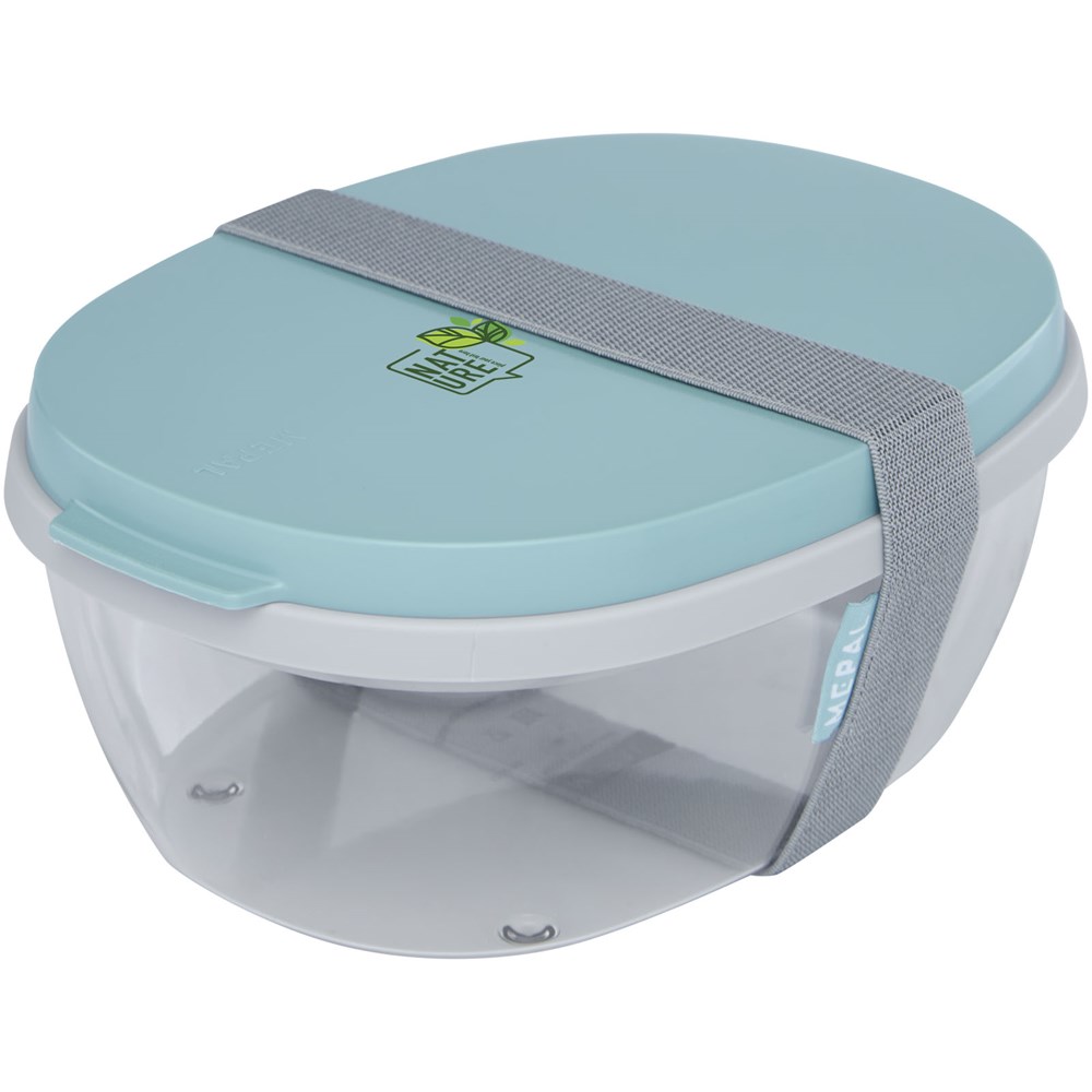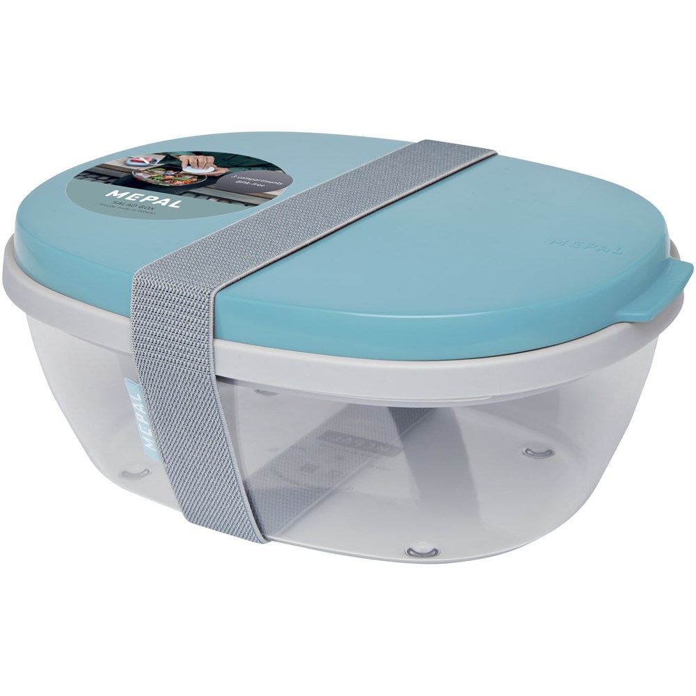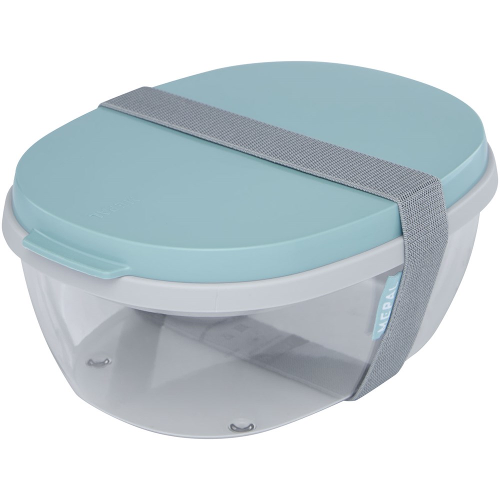 Saladebox met groot doorzichtig compartiment van 1300 ml dat groot genoeg is om de salade te mengen voor het eten. Het bovenste compartiment biedt ruimte voor brood of bestek. Inclusief een klein compartiment voor dressing of noten. Onbreekbaar en kan in de vaatwasser. Wordt geleverd met een elastische bandsluiting. BPA-vrij.