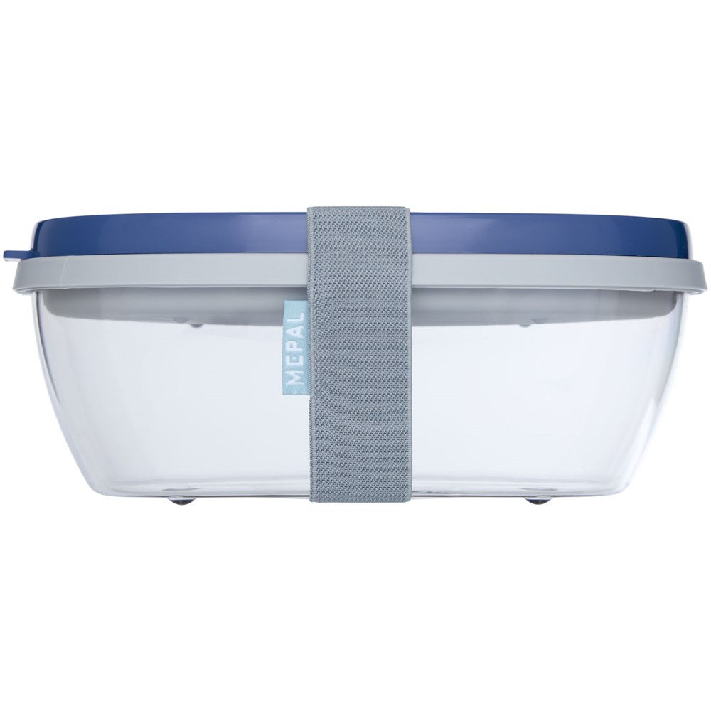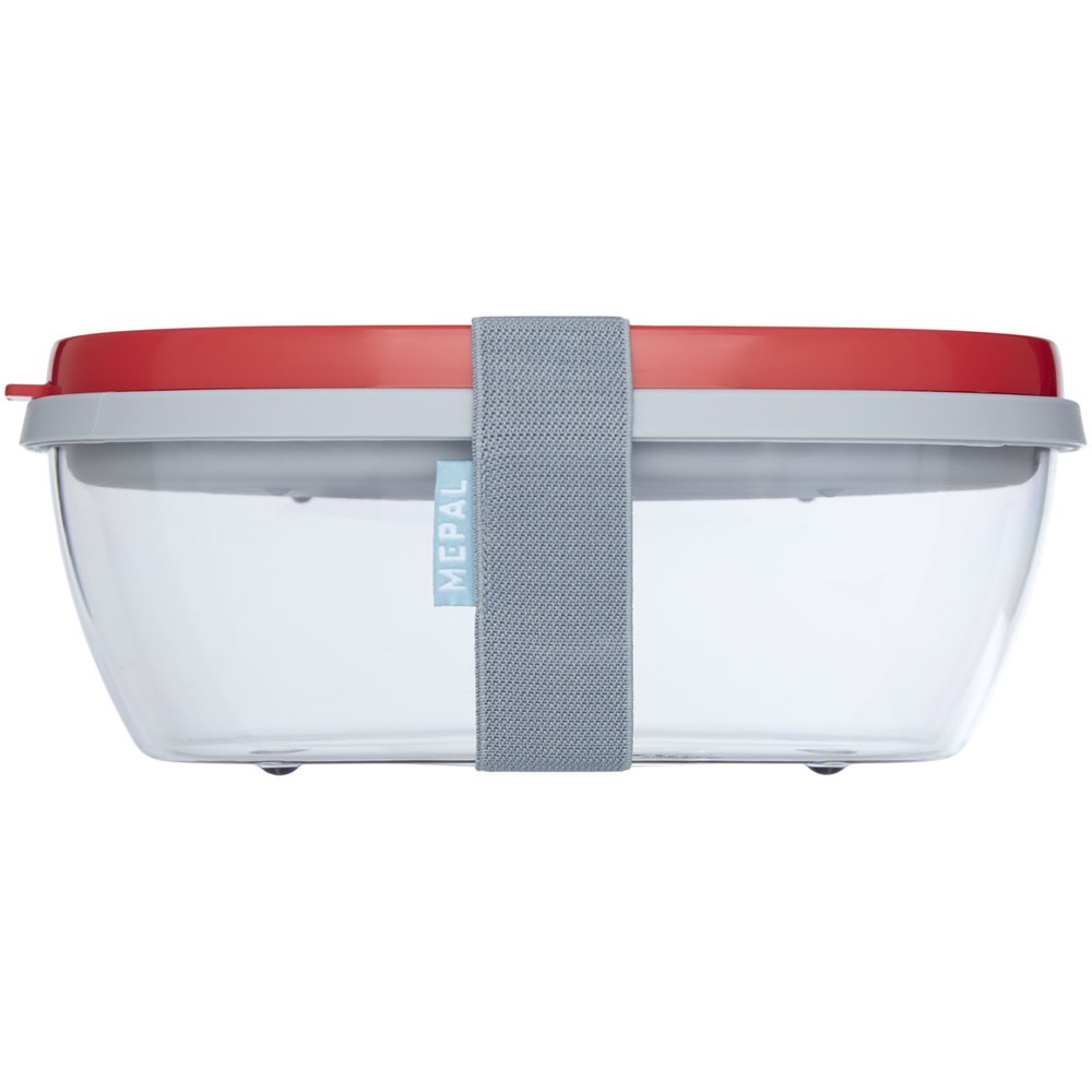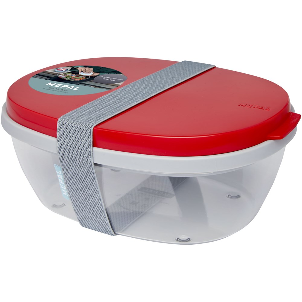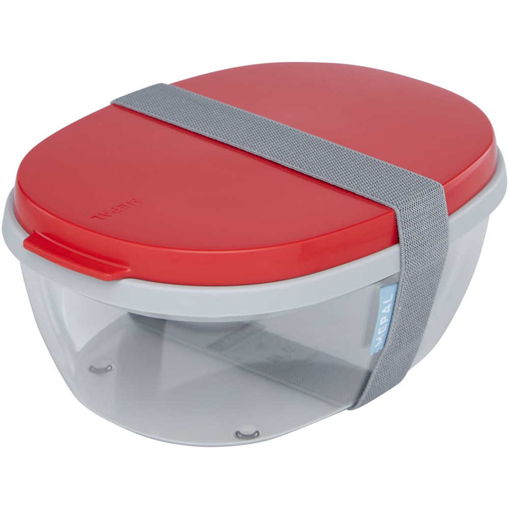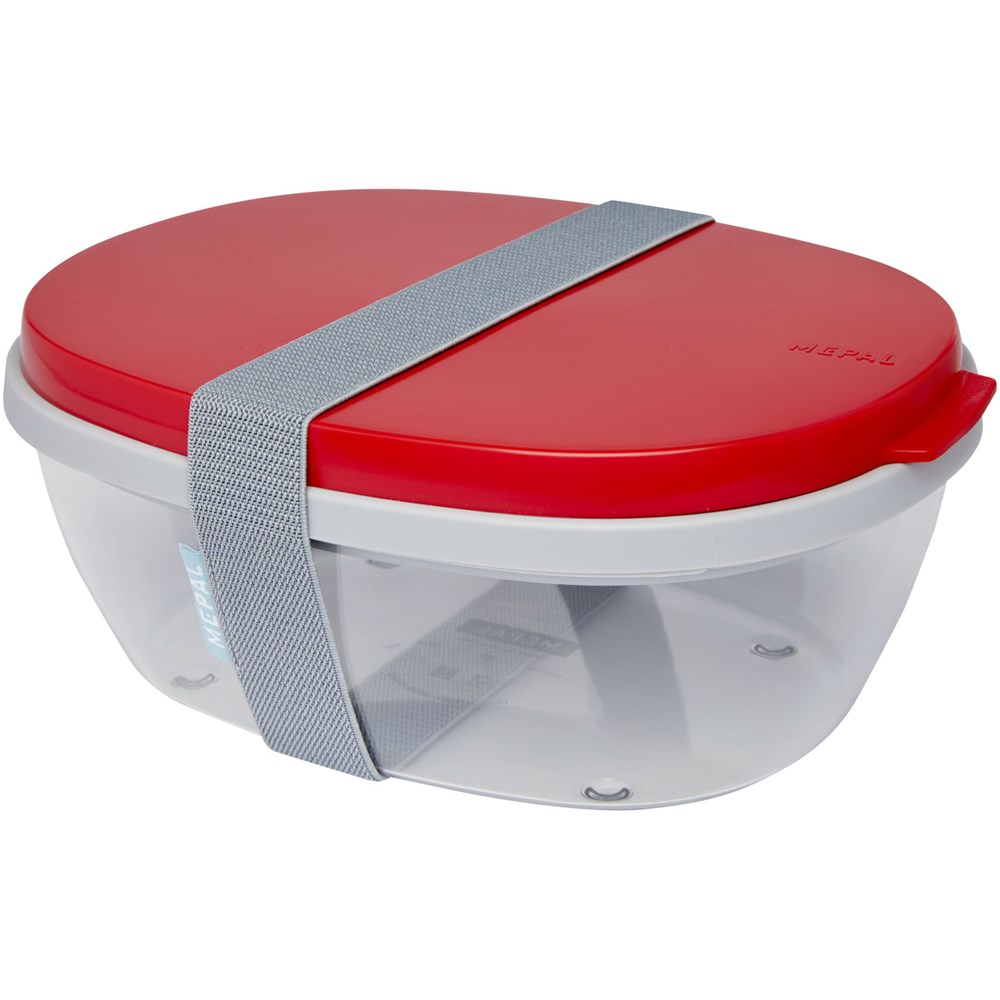 Saladebox met groot doorzichtig compartiment van 1300 ml dat groot genoeg is om de salade te mengen voor het eten. Het bovenste compartiment biedt ruimte voor brood of bestek. Inclusief een klein compartiment voor dressing of noten. Onbreekbaar en kan in de vaatwasser. Wordt geleverd met een elastische bandsluiting. BPA-vrij.