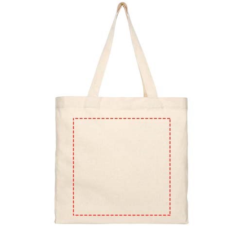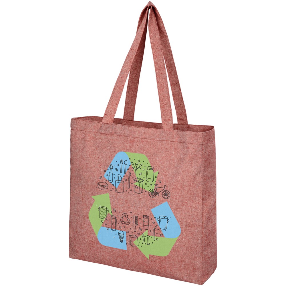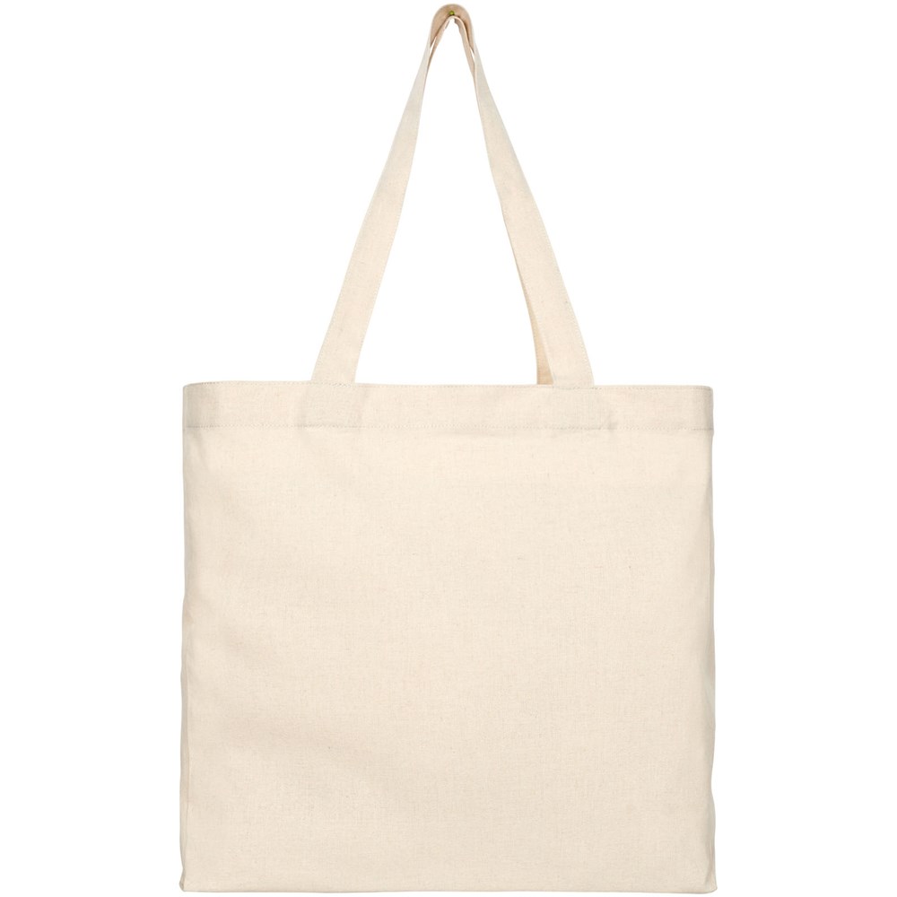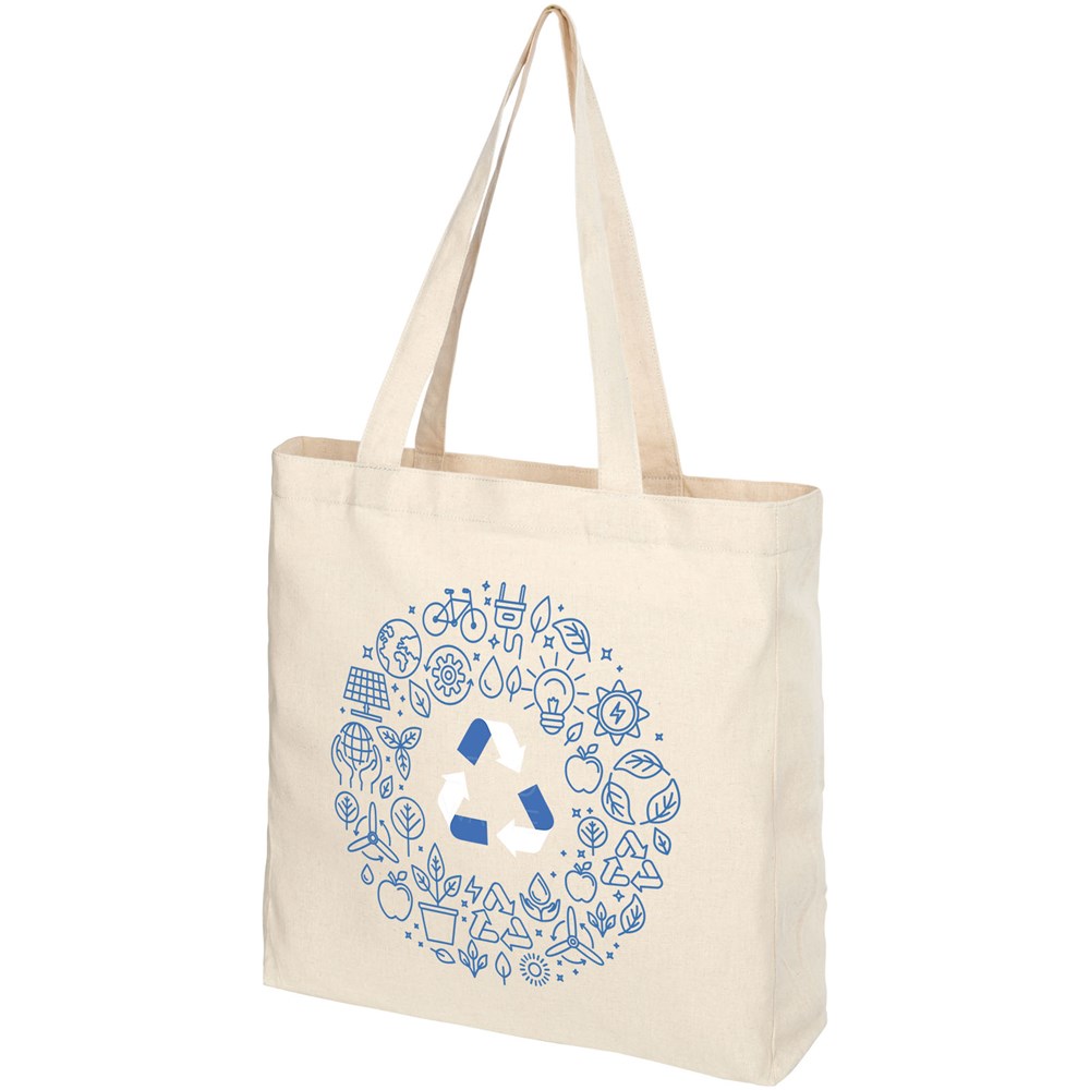 Draagtas gemaakt van 210 g/m² gerecycled katoen polyester mix. Gerecycled katoen wordt vervaardigd uit voor consumenten bestemd afval dat in textielfabrieken tijdens het snijproces wordt geproduceerd. Draagtas met inzetstuk en groot hoofdvak. Voorzien van twee handgrepen met een lengte van 31 cm. Geschikt voor een gewicht tot 10 kg. Er kunnen door de wijze van produceren kleine variaties voorkomen in de kleur van het eigenlijke product.
