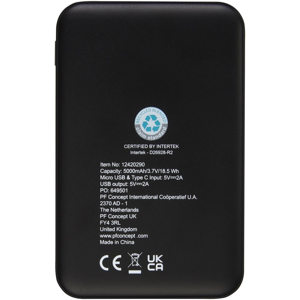 Powerbank gemaakt van RCS-gecertificeerd gerecycled ABS plastic. RCS (Recycled Claim Standard) is een norm om het gerecyclede gehalte van een product in de gehele leveringsketen te verifiëren. De powerbank bevat een duurzame 5000 mAh lithiumpolymeerbatterij van graad A. De stroomindicatoren geven het resterende energieniveau aan, zodat u altijd weet wanneer u moet opladen. Type-C-ingang 5 V/2 A, Micro-USB-ingang 5 V/2 A, USB-uitgang 5 V/2A. Geen accessoirekabel meegeleverd vanwege duurzaamheidsdoeleinden. Geleverd in een geschenkverpakking inclusief handleiding (beide gemaakt van duurzaam materiaal).