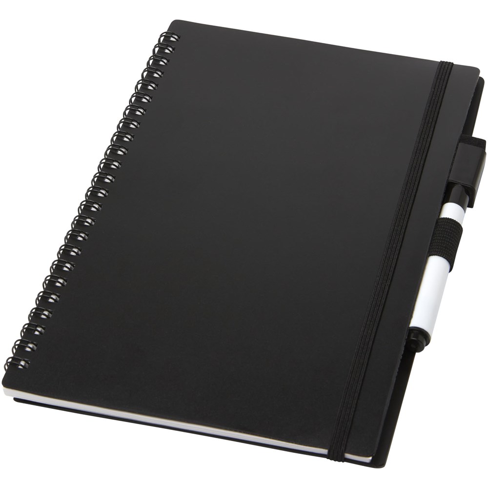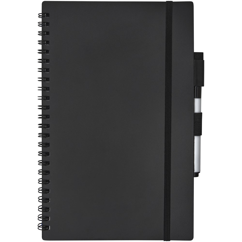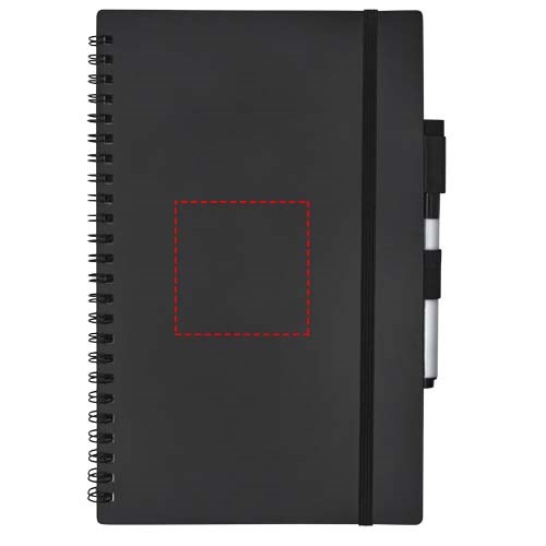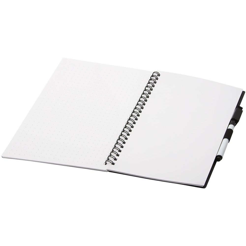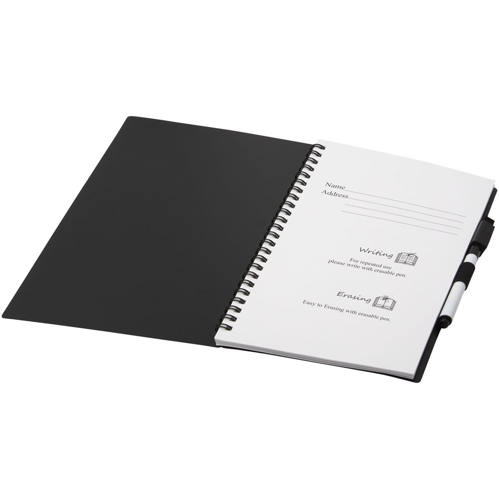 Duurzaam notitieboek gericht op het verminderen van papiergebruik om het milieu te sparen. Na een tijdje noteren, tekenen of brainstormen kunnen de pagina's worden schoongemaakt met de gum op de stift om de pagina's opnieuw te gebruiken. Het kan ook worden gereinigd met een gewone stoffen doek (niet meegeleverd). Bevat 20 vellen (40 pagina's) met een half gestippelde en half blanco opmaak en een zwarte stift.