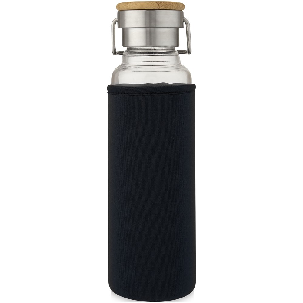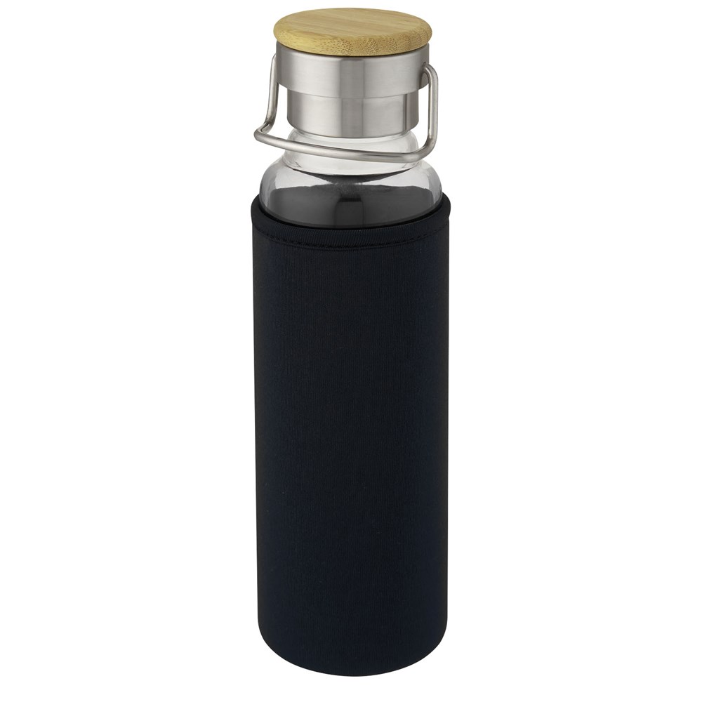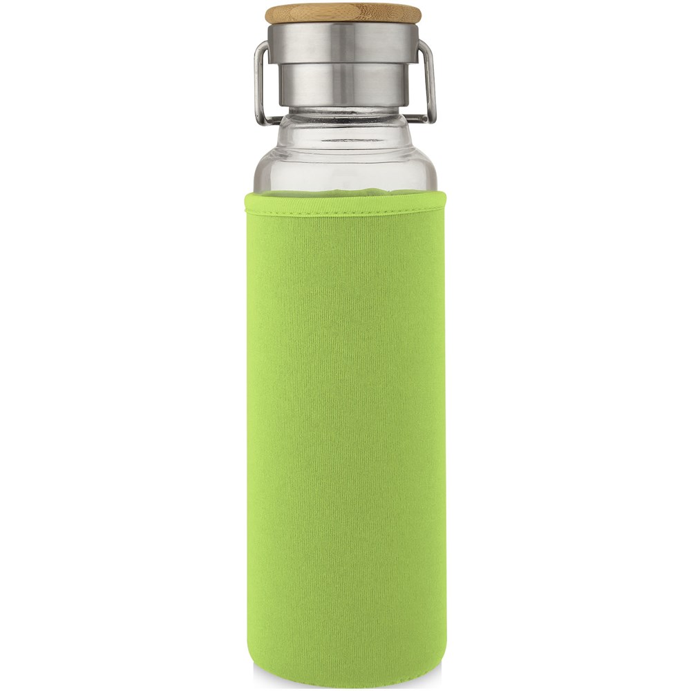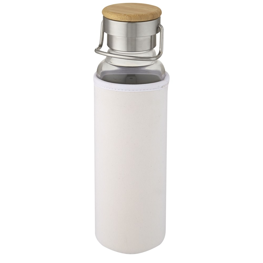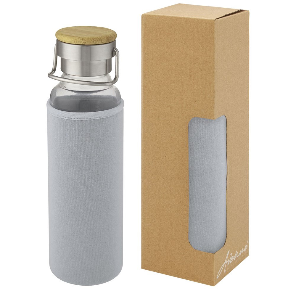 Enkelwandige fles van borosilicaatglas met beschermhoes van neopreen. Voorzien van een schroefdop met bamboetop, evenals een handvat voor gemakkelijk dragen. De fles is gemaakt van 100% duurzaam borosilicaatglas dat de versheid van de drank behoudt en ze bevat geen schadelijke chemicaliën. BPA-vrij, getest en goedgekeurd volgens de Duitse voedselveiligheidswetgeving (LFGB). Getest en goedgekeurd voor ftalaten volgens de REACH-regelgeving. De gebruikte bamboe is van duurzame, milieuvriendelijke, maatschappelijk verantwoorde bronnen. De inhoud is 660 ml. Door de neopreen hoes en het deksel te verwijderen is de fles vaatwasmachinebestendig. Geleverd in een gerecycled kartonnen geschenkverpakking.