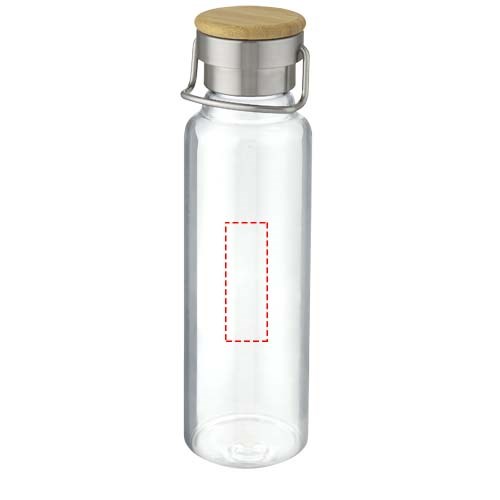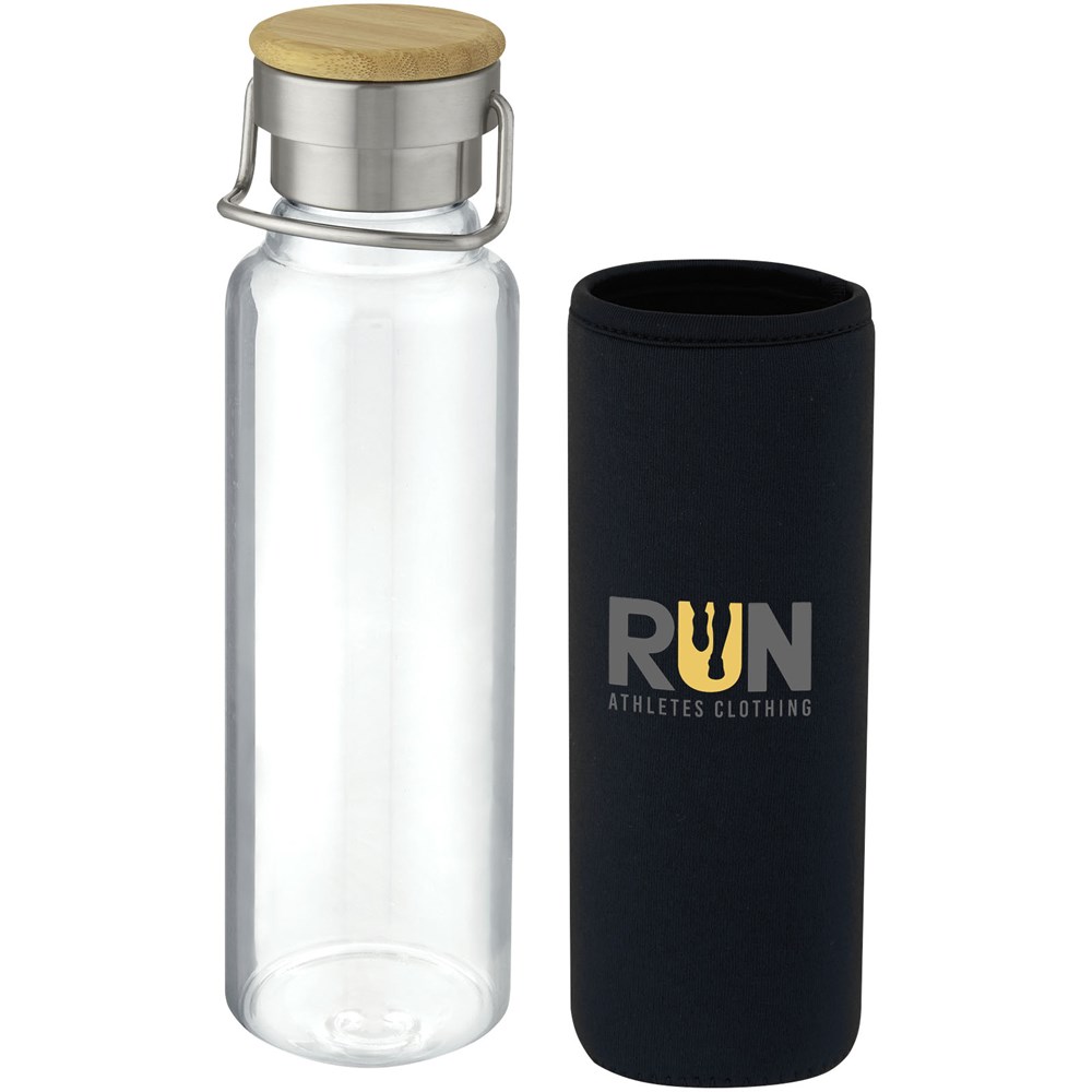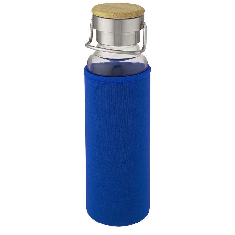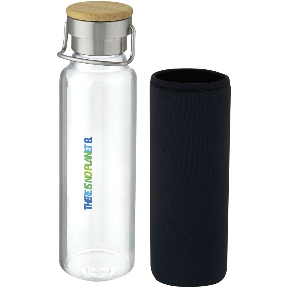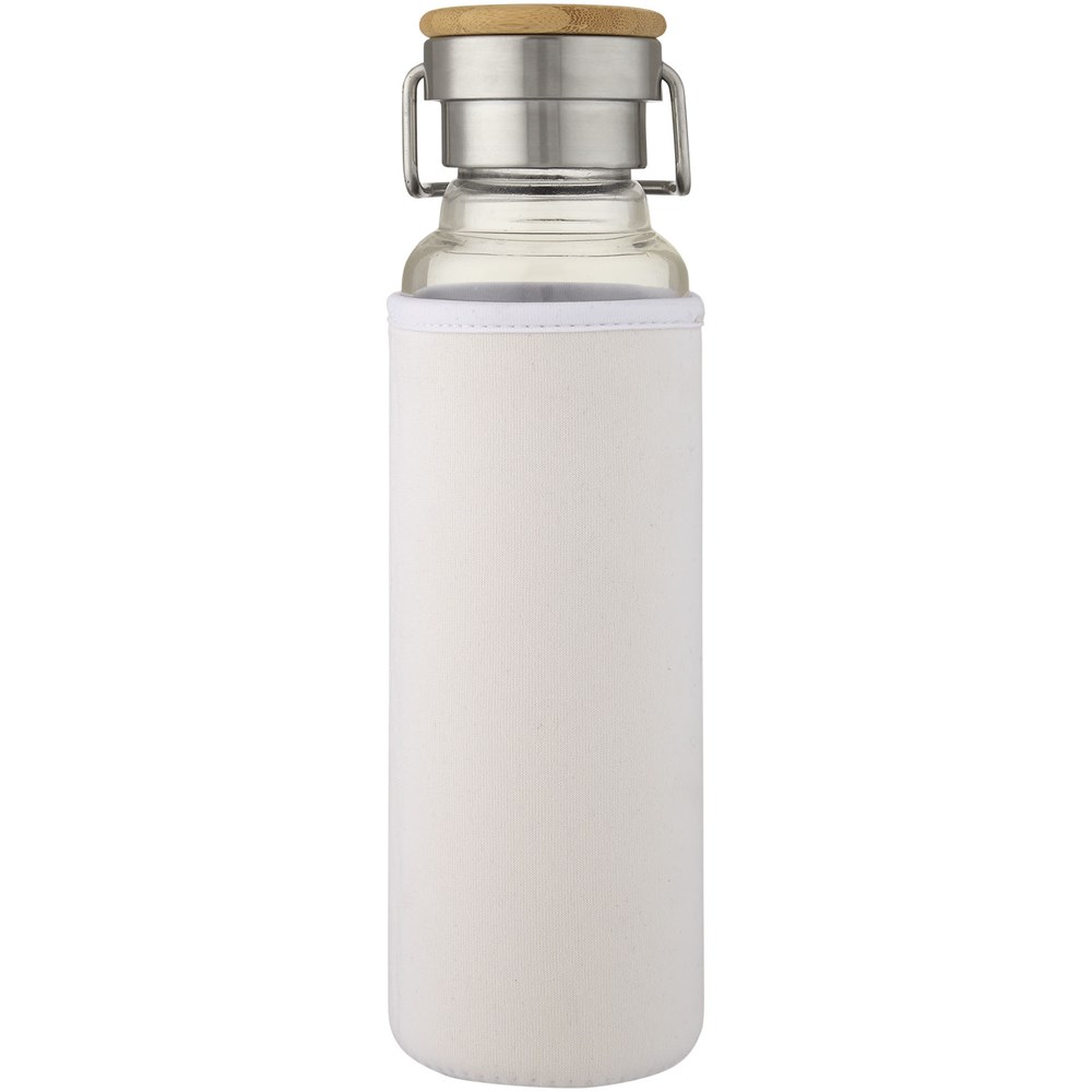 Enkelwandige fles van borosilicaatglas met beschermhoes van neopreen. Voorzien van een schroefdop met bamboetop, evenals een handvat voor gemakkelijk dragen. De fles is gemaakt van 100% duurzaam borosilicaatglas dat de versheid van de drank behoudt en ze bevat geen schadelijke chemicaliën. BPA-vrij, getest en goedgekeurd volgens de Duitse voedselveiligheidswetgeving (LFGB). Getest en goedgekeurd voor ftalaten volgens de REACH-regelgeving. De gebruikte bamboe is van duurzame, milieuvriendelijke, maatschappelijk verantwoorde bronnen. De inhoud is 660 ml. Door de neopreen hoes en het deksel te verwijderen is de fles vaatwasmachinebestendig. Geleverd in een gerecycled kartonnen geschenkverpakking.