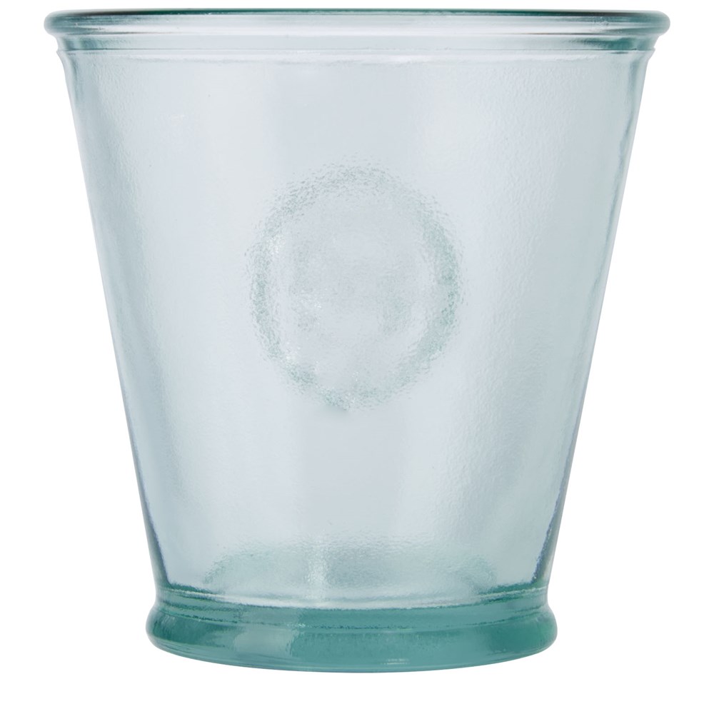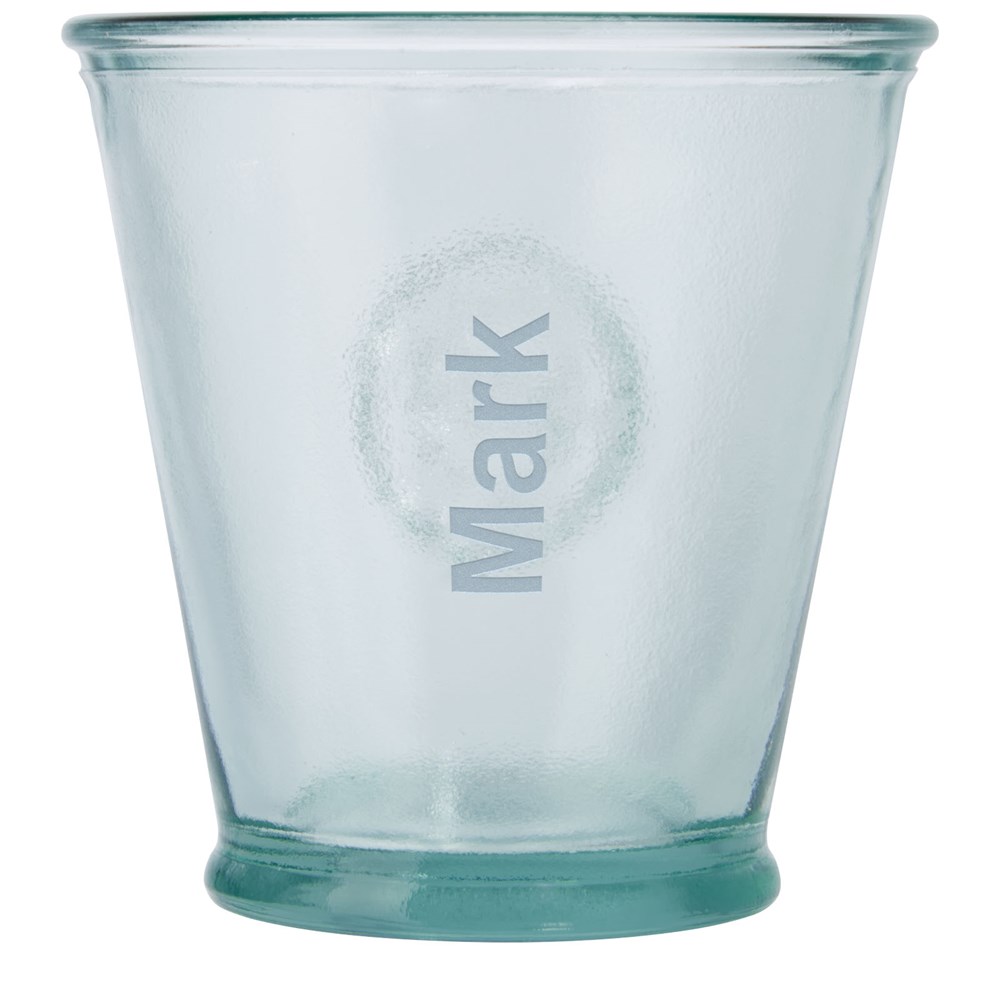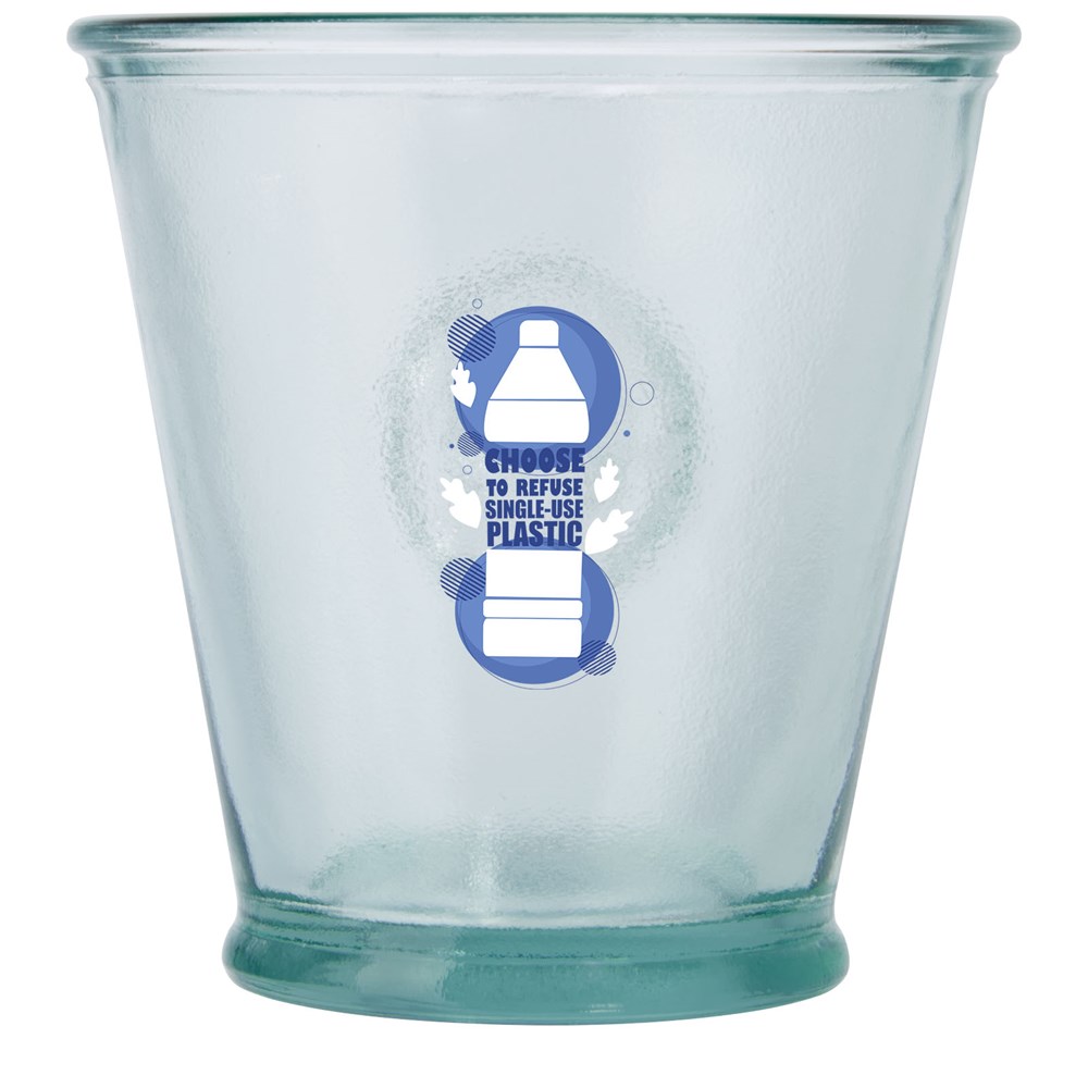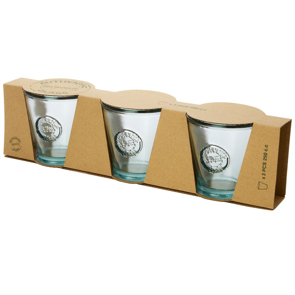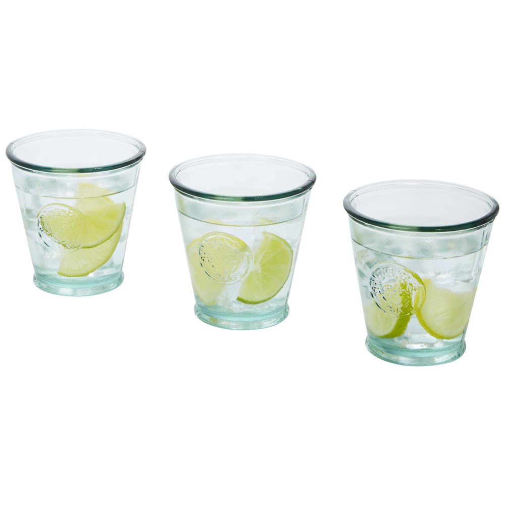 3-delige set van gerecycled glas met drie bekers van 250 ml. Gemaakt van 1 glazen fles. Gerecycled glas wordt geproduceerd met minder energie, grondstoffen en toevoegingen, dan wat nodig is voor het maken van traditioneel glas. Afmetingen beker: hoogte 9 cm, diameter 9 cm.