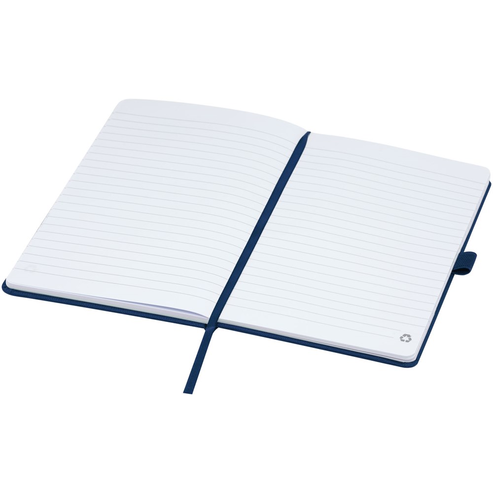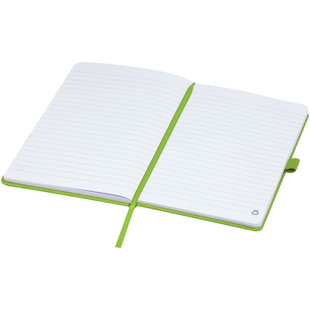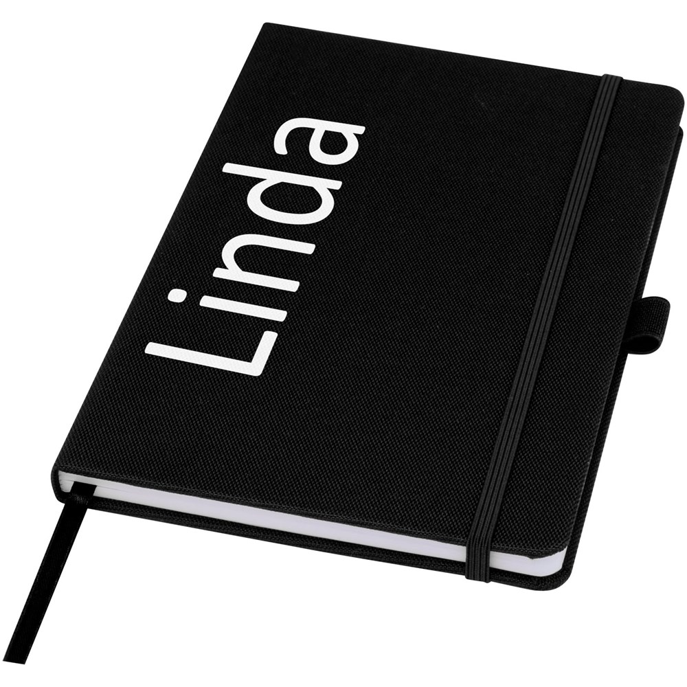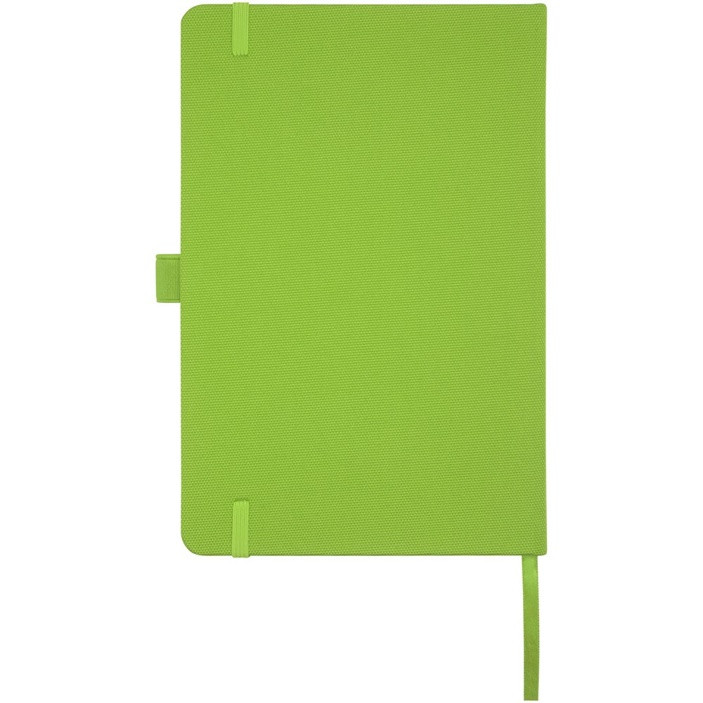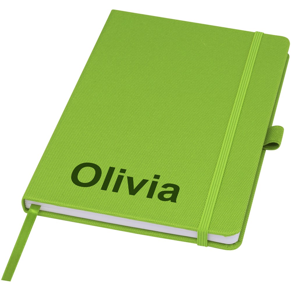 Notitieboek in A5-formaat met cover van RPET-stof. Bevat 80 vellen 70 g/m² gerecycled papier met gelijnde lay-out, een pennenlus en lint. Te combineren met de 107757 Honua RPET-balpen.