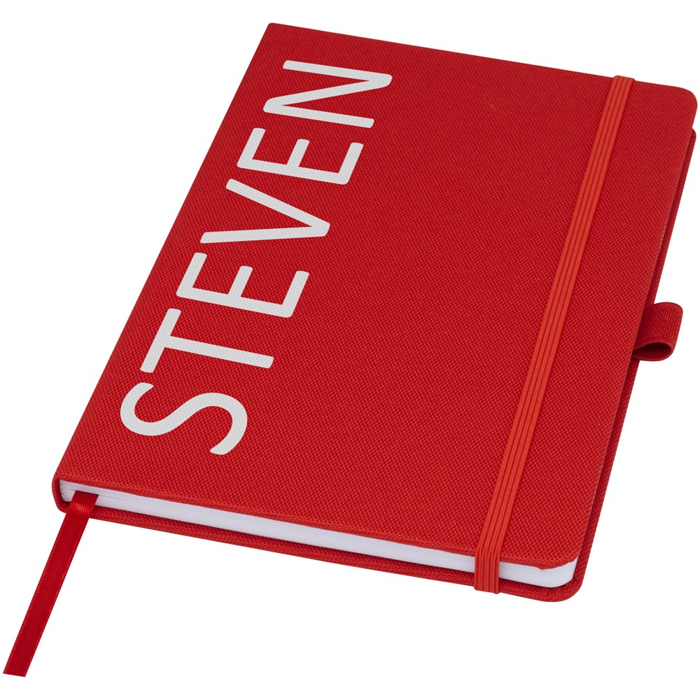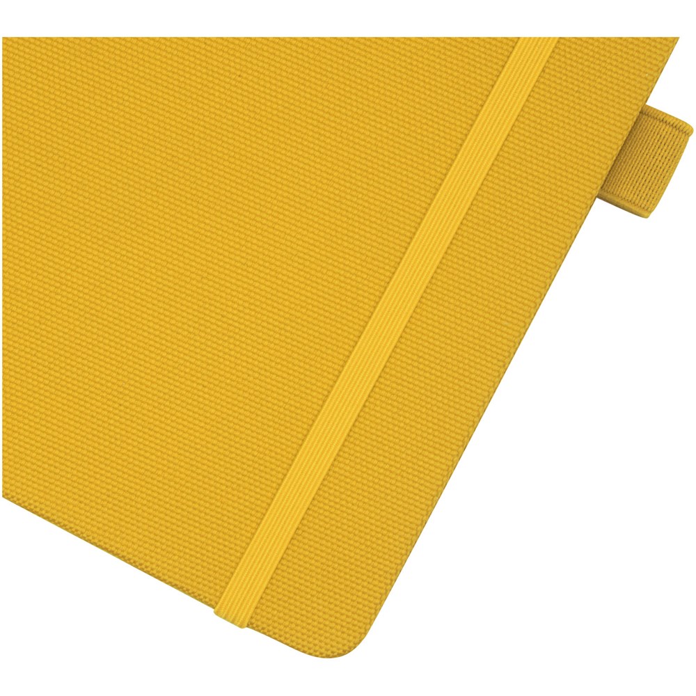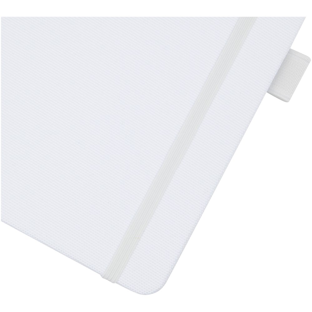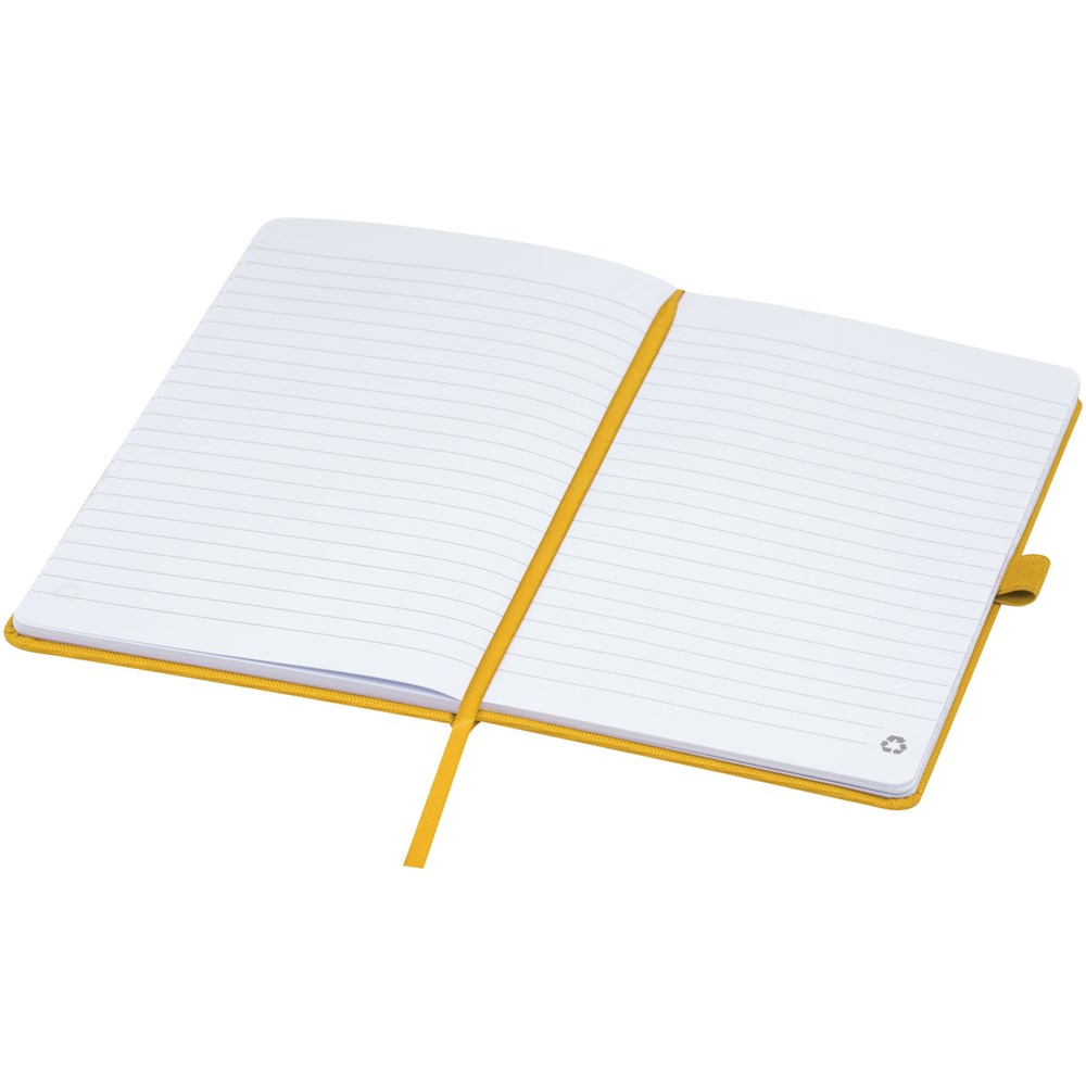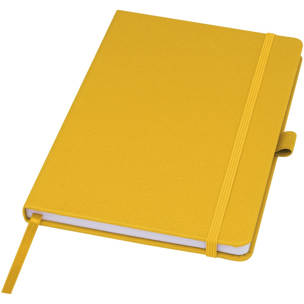 Notitieboek in A5-formaat met cover van RPET-stof. Bevat 80 vellen 70 g/m² gerecycled papier met gelijnde lay-out, een pennenlus en lint. Te combineren met de 107757 Honua RPET-balpen.