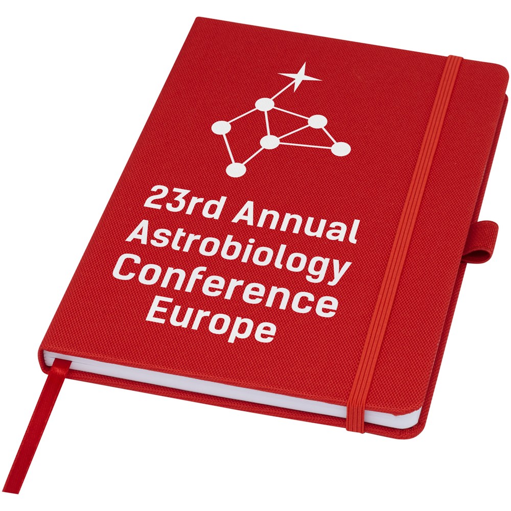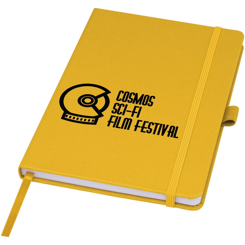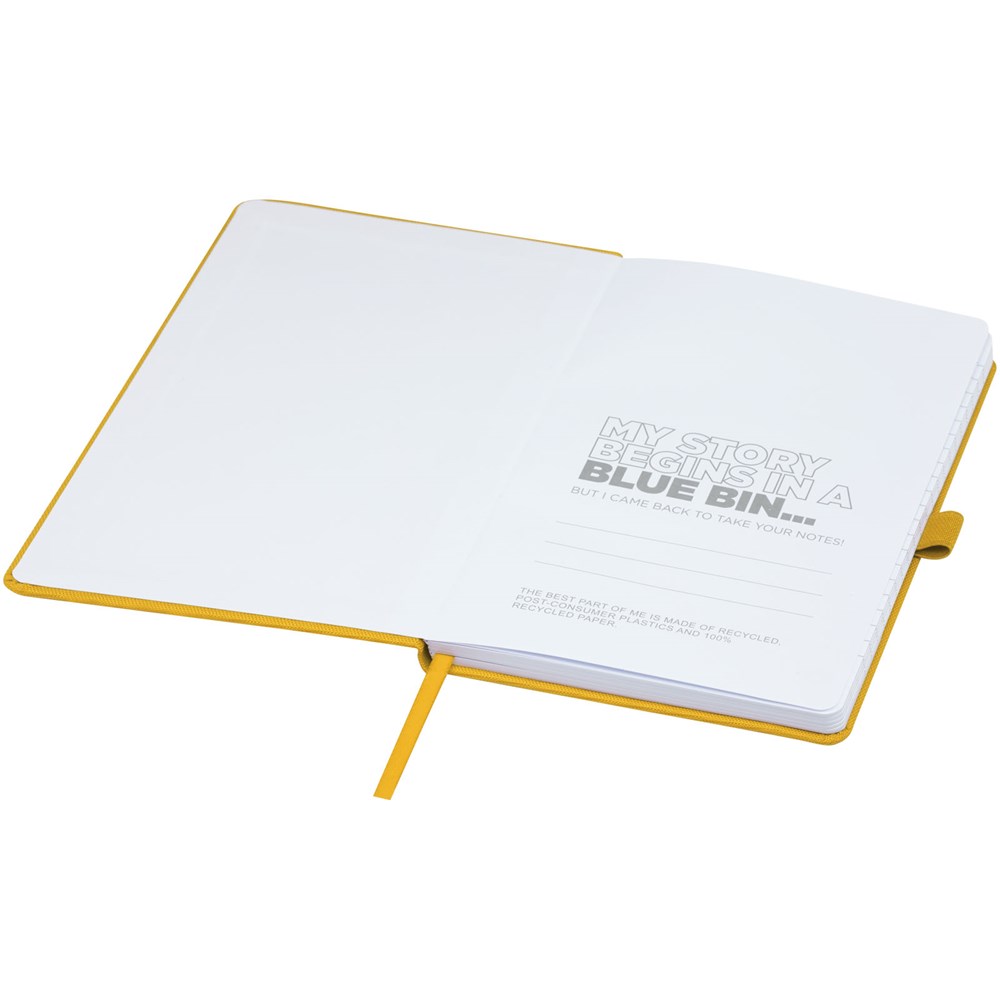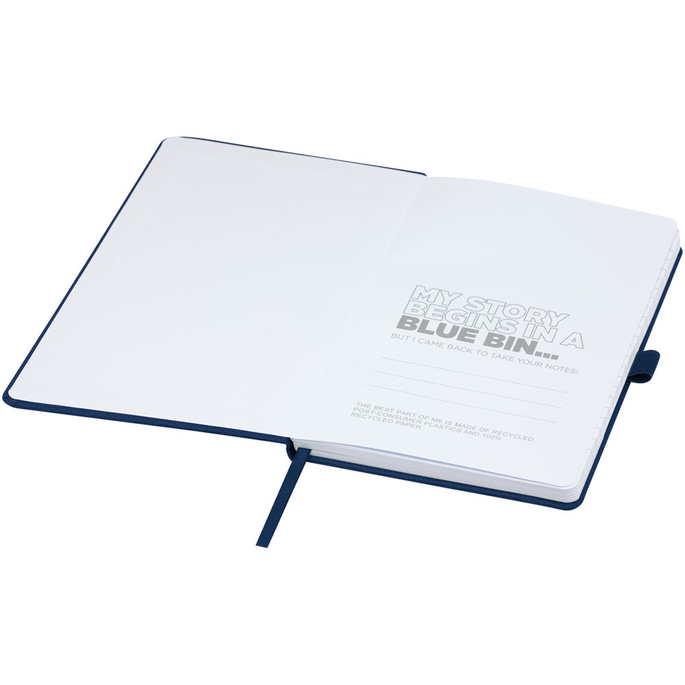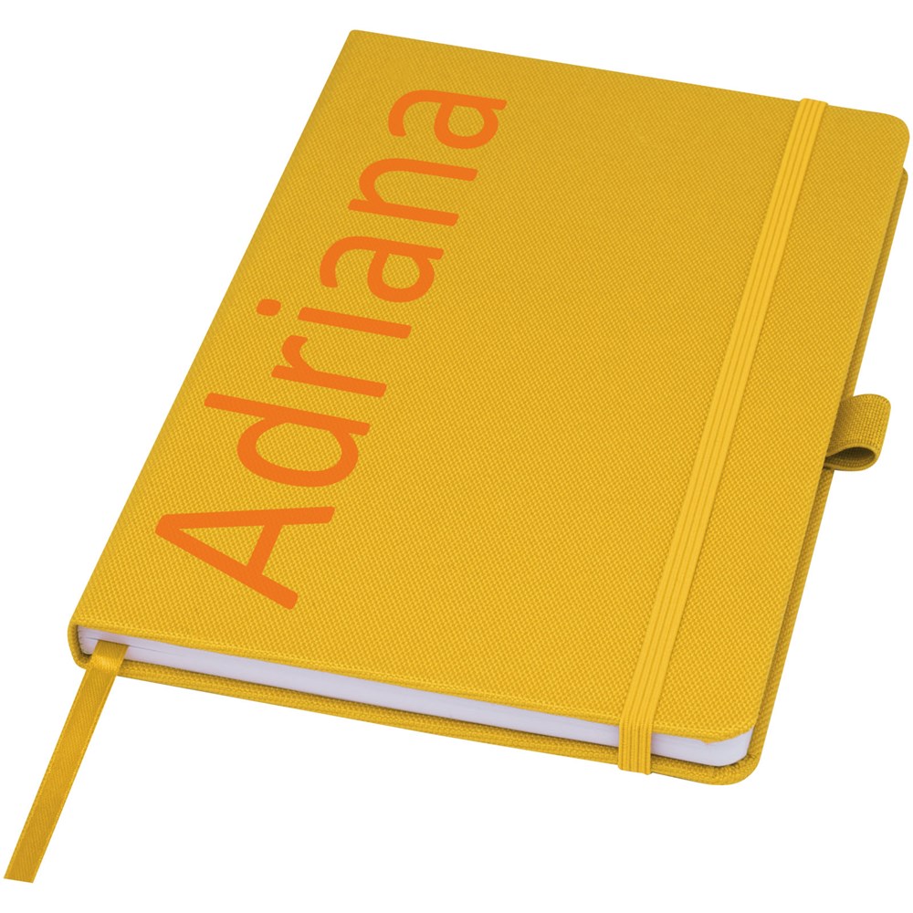 Notitieboek in A5-formaat met cover van RPET-stof. Bevat 80 vellen 70 g/m² gerecycled papier met gelijnde lay-out, een pennenlus en lint. Te combineren met de 107757 Honua RPET-balpen.