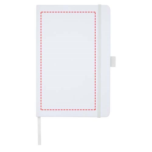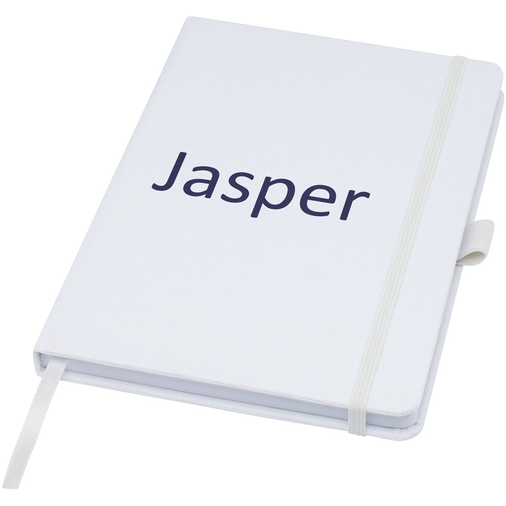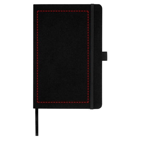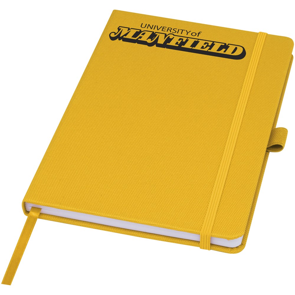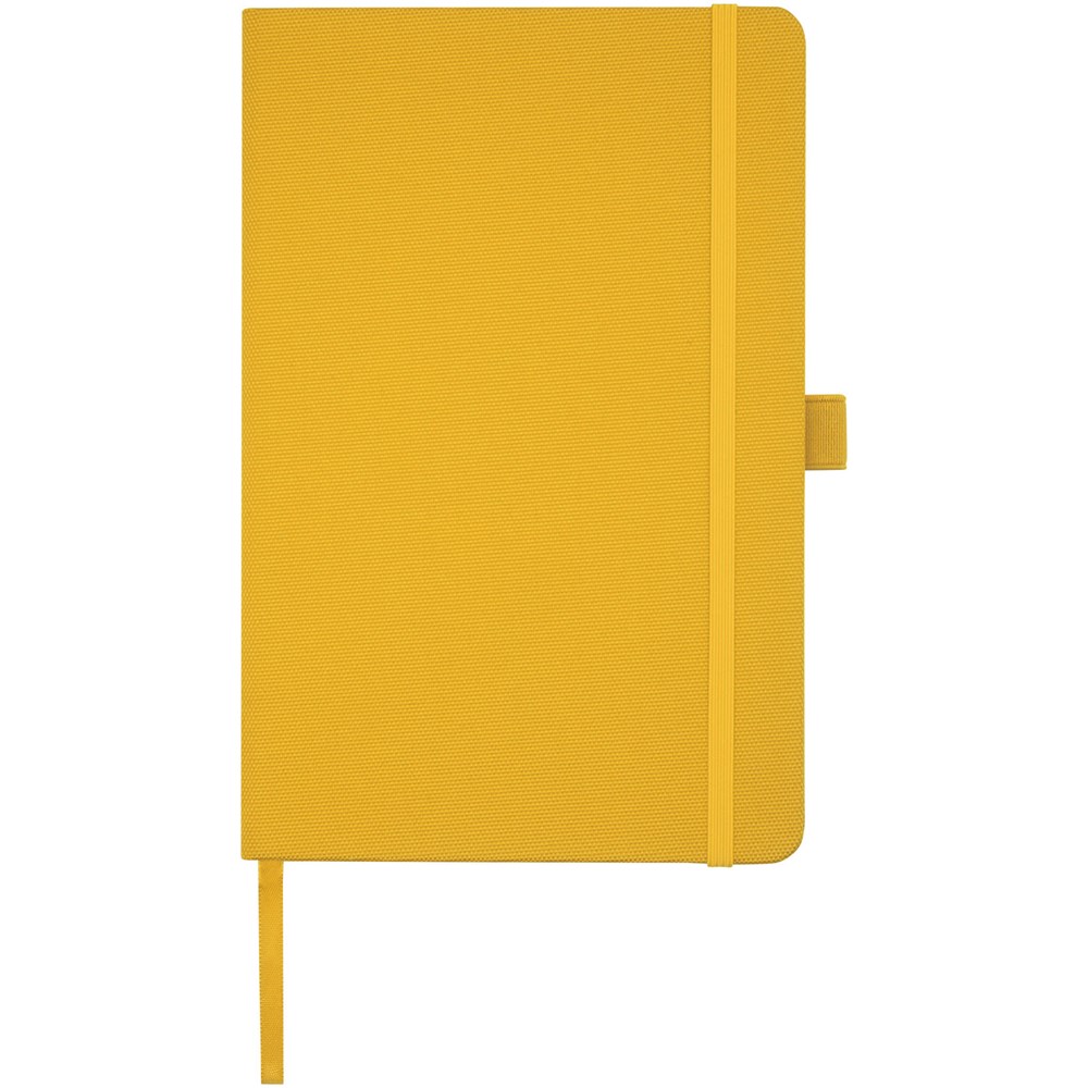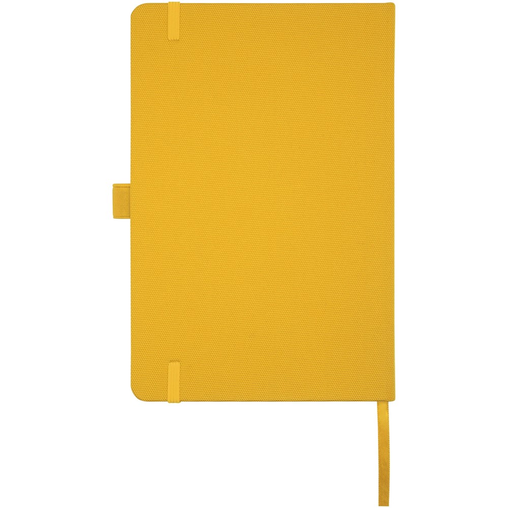 Notitieboek in A5-formaat met cover van RPET-stof. Bevat 80 vellen 70 g/m² gerecycled papier met gelijnde lay-out, een pennenlus en lint. Te combineren met de 107757 Honua RPET-balpen.