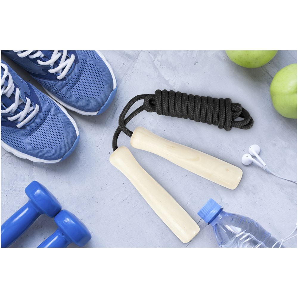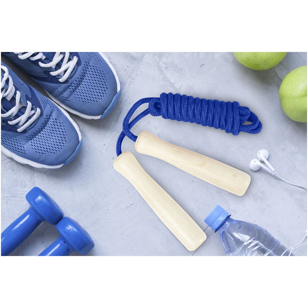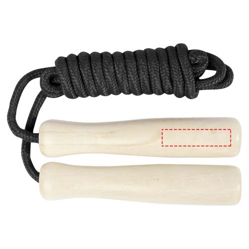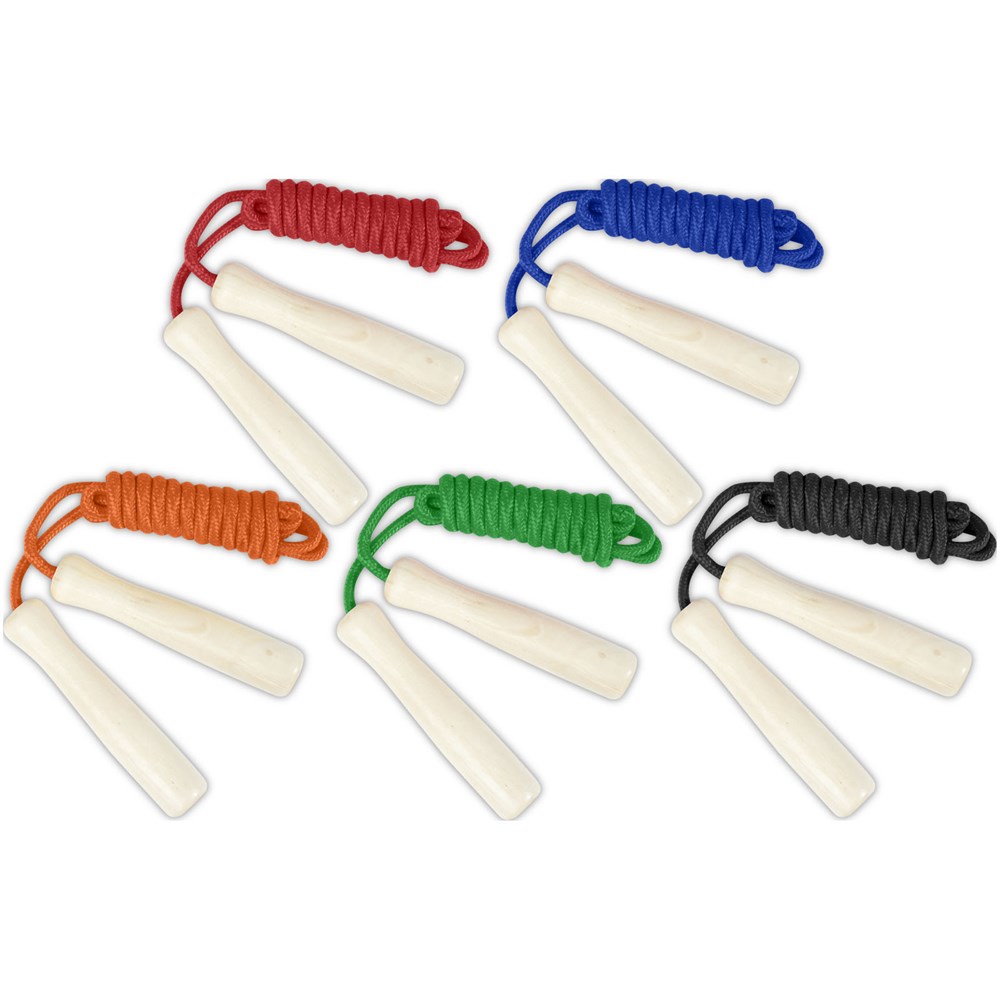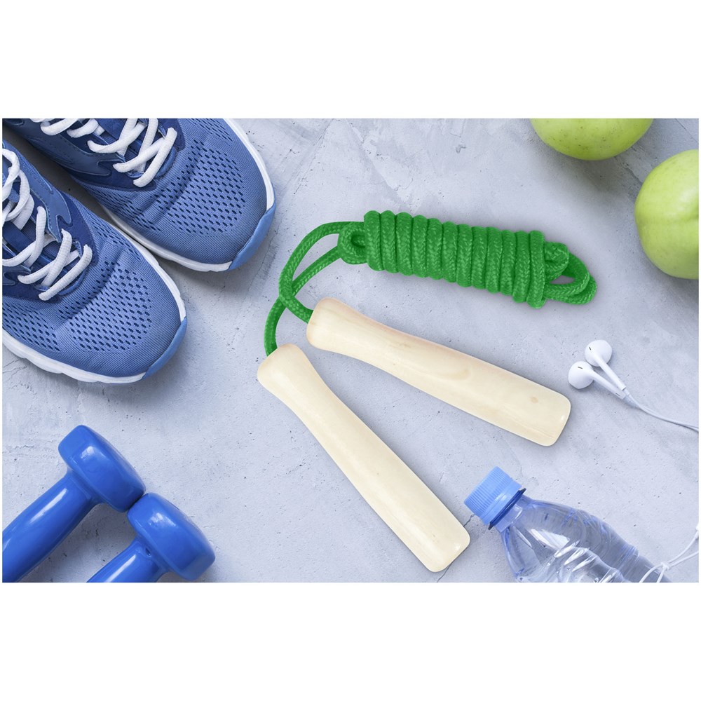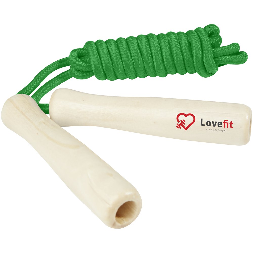 Combineer plezier en beweging met dit springtouw voor kinderen. Het polyester touw is verkrijgbaar in verschillende aantrekkelijke kinderkleuren en de handvatten zijn van hout. De lengte van het touw is 245 cm, waardoor kinderen tot 160 cm gemakkelijk kunnen springen. Lasergraveren wordt aanbevolen als een duurzame decoratieoptie.