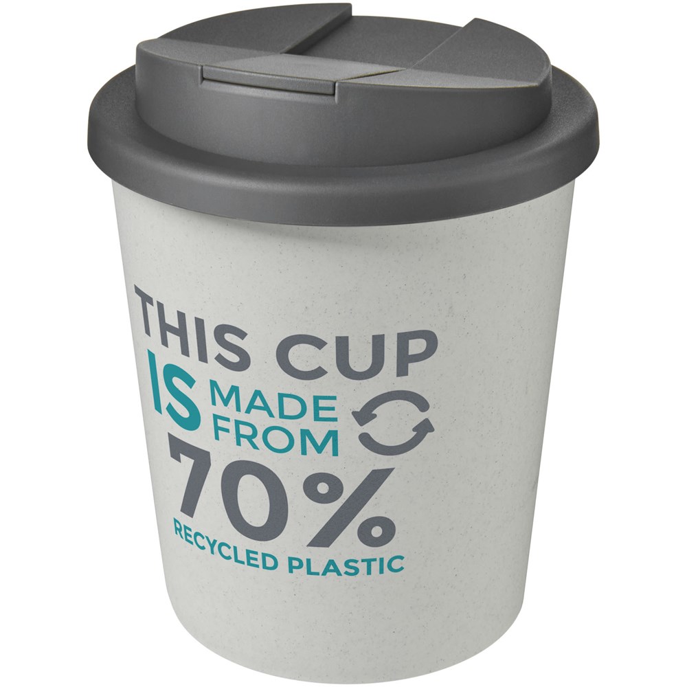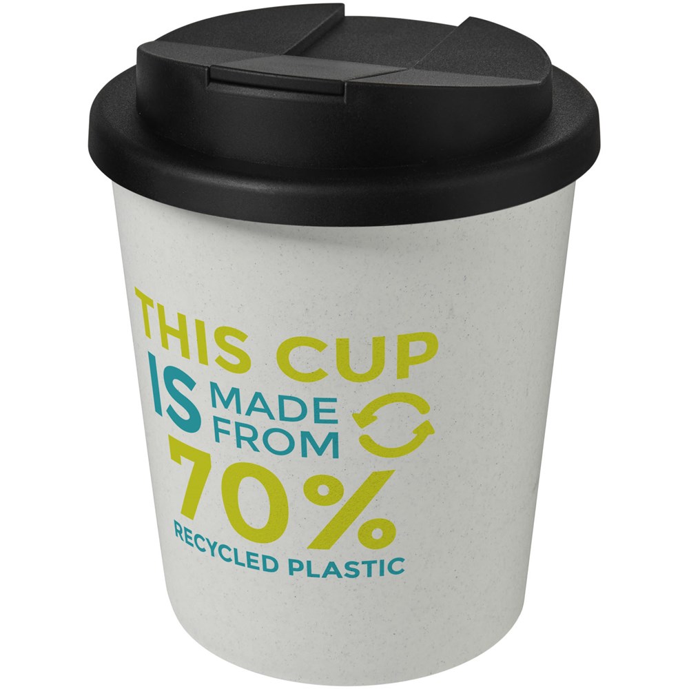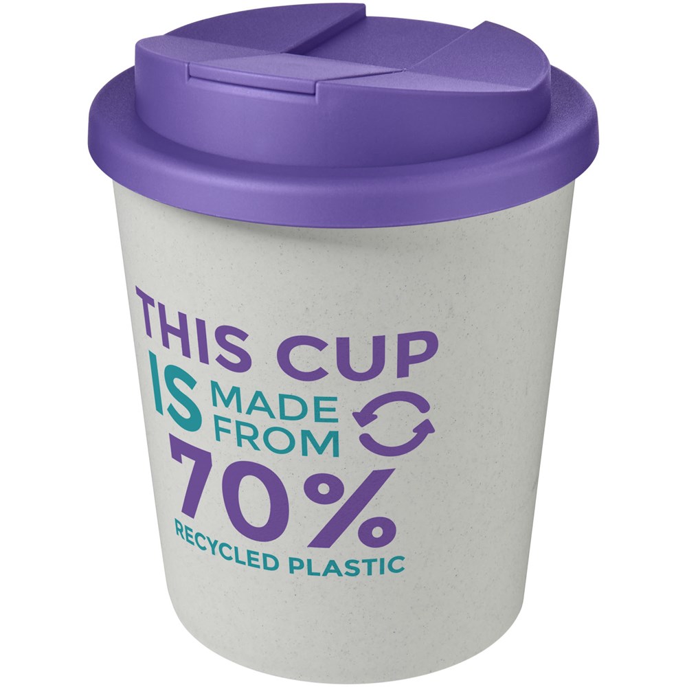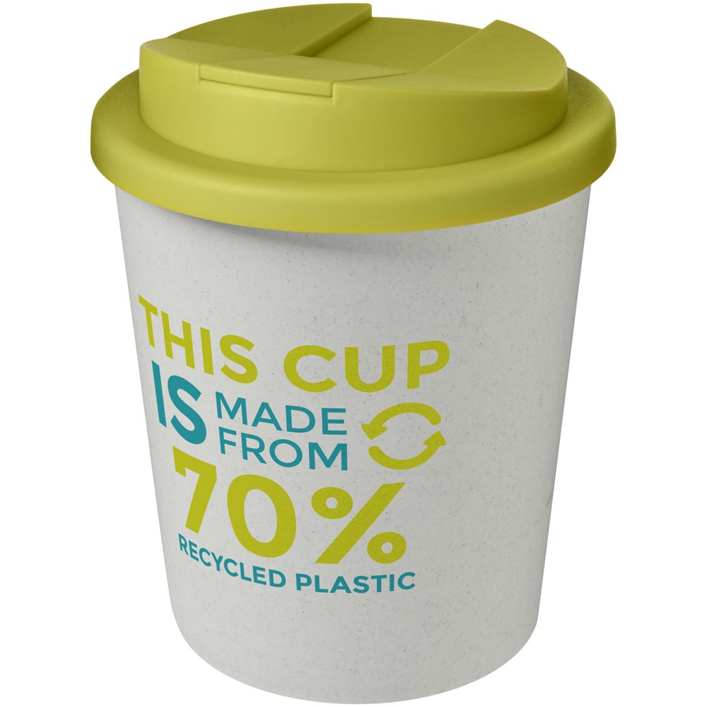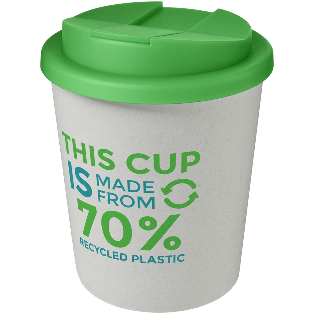 Dubbelwandig geïsoleerde beker met veilig knoeibestendig draaideksel. Het deksel klikt vast om knoeien beter te voorkomen, en is vervaardigd zonder siliconen voor een volledig recyclebare drinkbeker. De beker is gemaakt van 100% gerecycled PP kunststof en het deksel is gemaakt van voedselveilig PP kunststof. Inhoud 250 ml Verpakt in een thuis composteerbare polybag. Gemaakt in het Verenigd Koninkrijk.