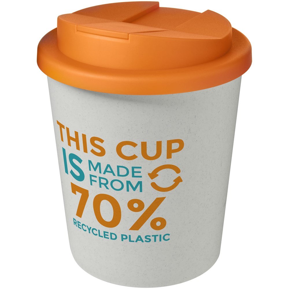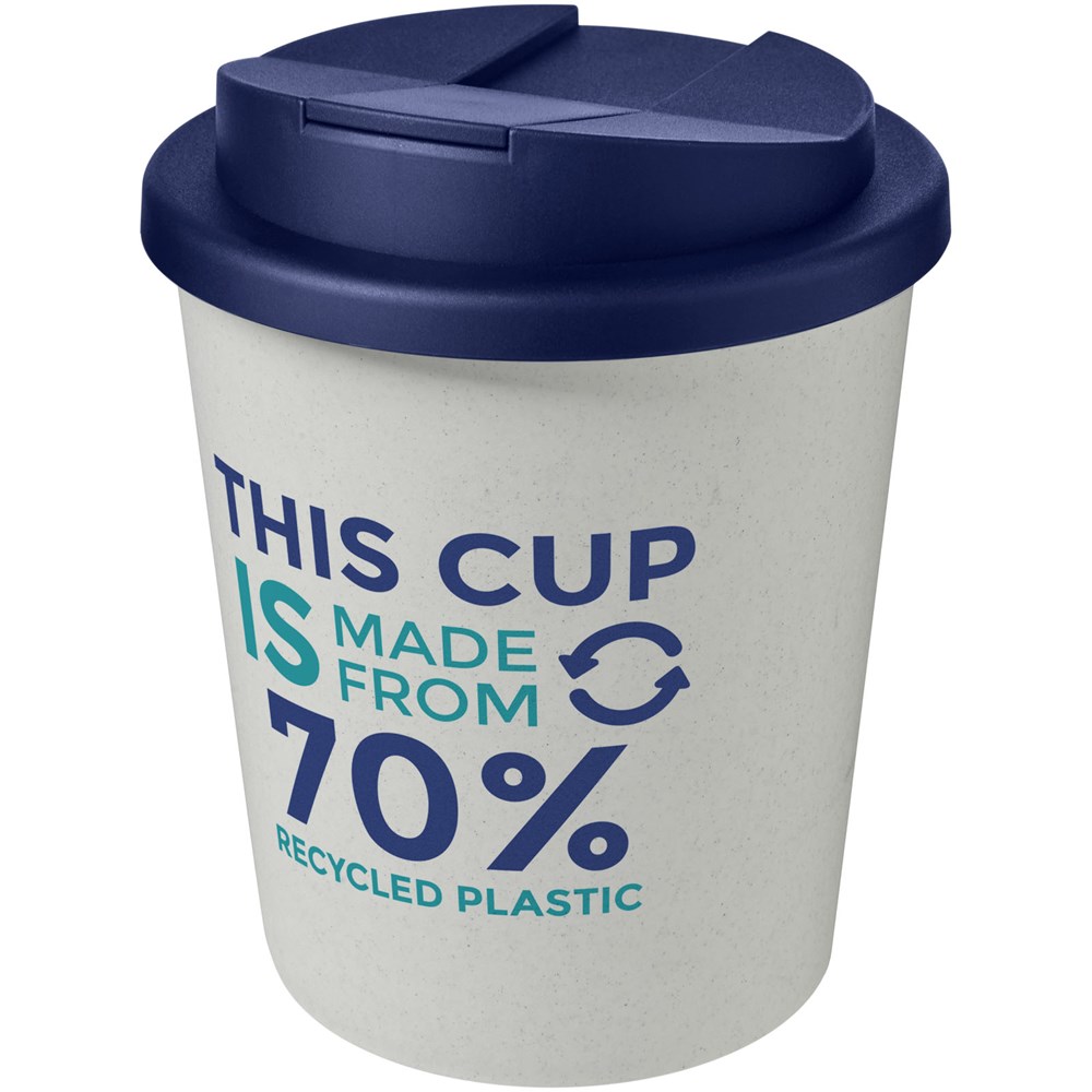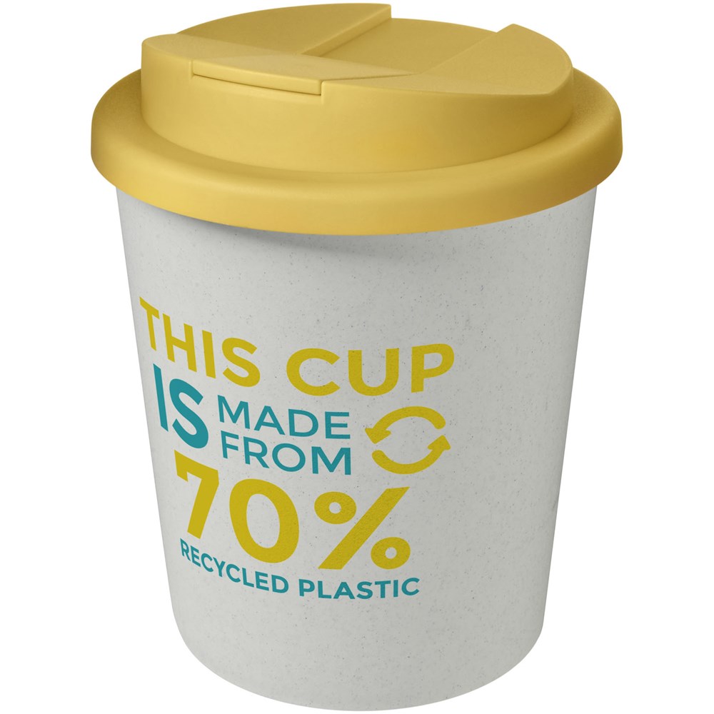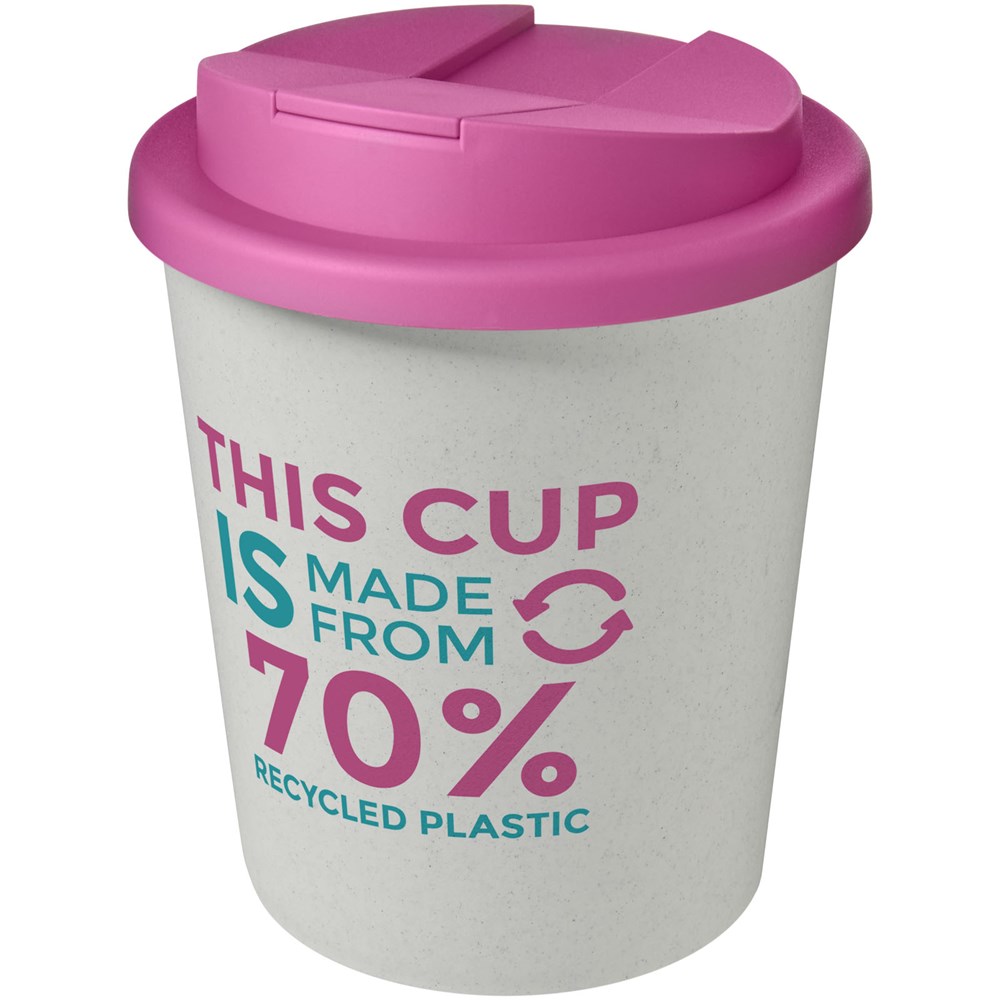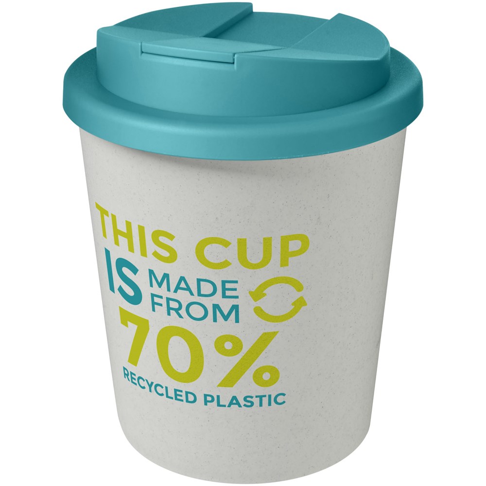 Dubbelwandig geïsoleerde beker met veilig knoeibestendig draaideksel. Het deksel klikt vast om knoeien beter te voorkomen, en is vervaardigd zonder siliconen voor een volledig recyclebare drinkbeker. De beker is gemaakt van 100% gerecycled PP kunststof en het deksel is gemaakt van voedselveilig PP kunststof. Inhoud 250 ml Verpakt in een thuis composteerbare polybag. Gemaakt in het Verenigd Koninkrijk.