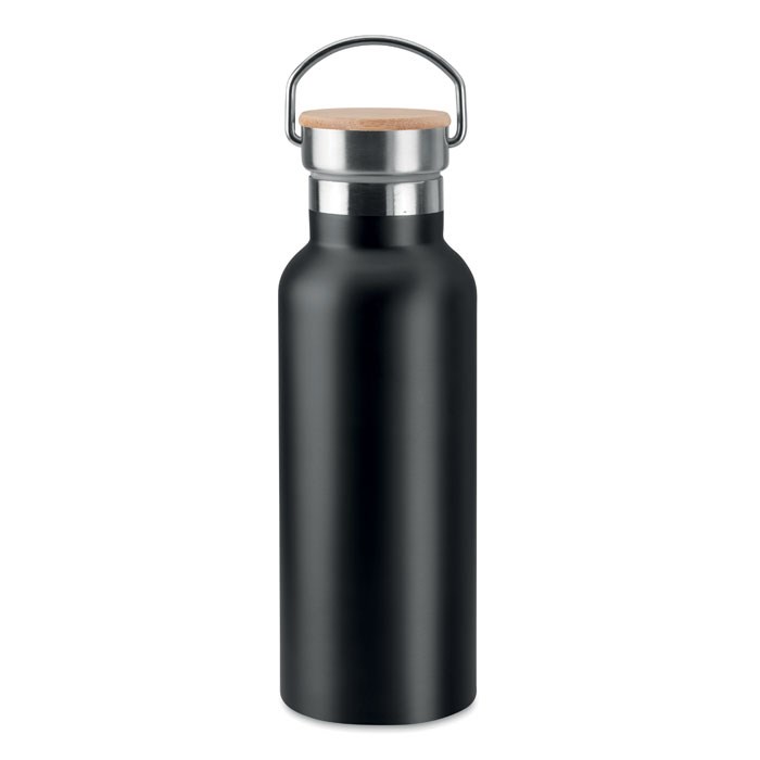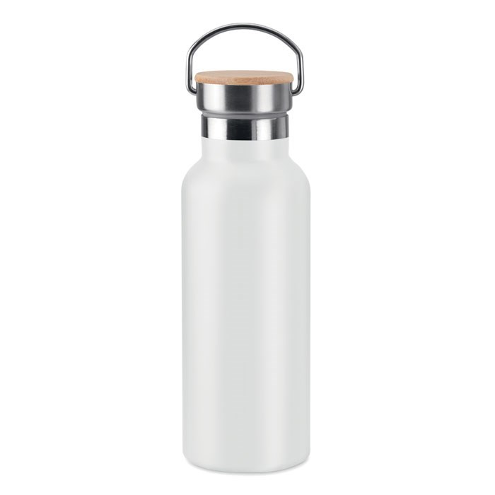 Dubbelwandige roestvrijstalen fles. Dop met bamboe afwerking. Inhoud: 500 ml. Sublimatie bedrukking alleen geschikt op het witte item. Lekvrij.