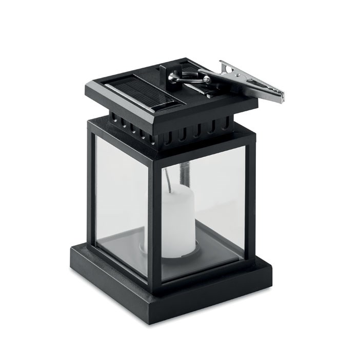 Solar buitenlantaarn met LED lampje in kaarsvorm. Met ring en ophangclip aan de bovenzijde. Ca. 5 werkuren. Inclusief batterij 300 mAh NI-MH. IP44.