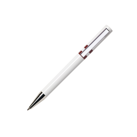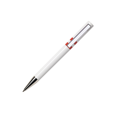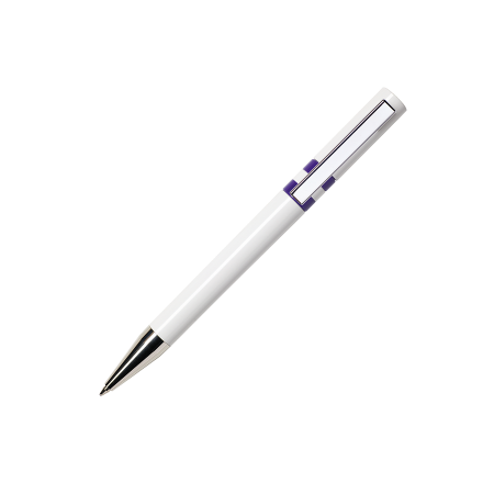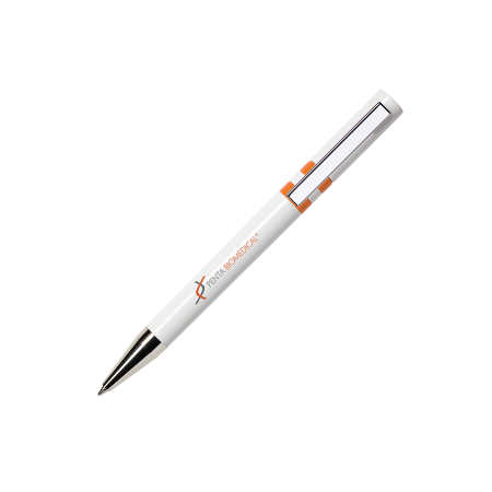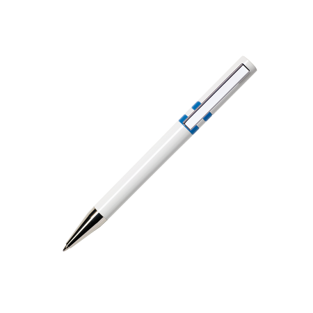 Maxema balpen ETHIC ET900 B, draaibalpen met glanzend witte houder en bovenstuk, glanzende gekleurde ringen en element in de top van het bovenstuk, verchroomde clip en puntstuk. Voorzien van Jumbo vulling met blauwe Dokumental inkt voor tot 2.500 meter schrijfplezier. De onderdelen van de pen zijn leverbaar in maar liefst 9 kleuren en zijn vanaf 2.000 stuks onderling qua kleur te combineren.