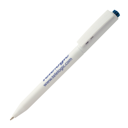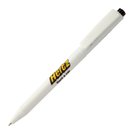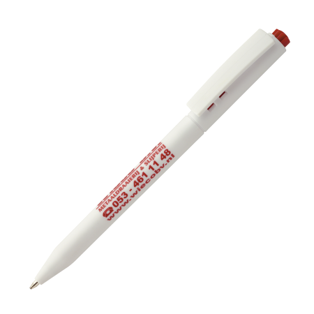 HALLIGEN kunststof balpen HC Peekay. Witte balpen met houder en clip uit 1 stuk, uniek clip-druk mechaniek, gekleurde drukkers en blauwschrijvende plastic X-20 vulling