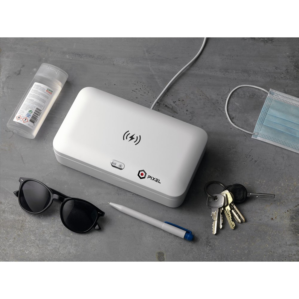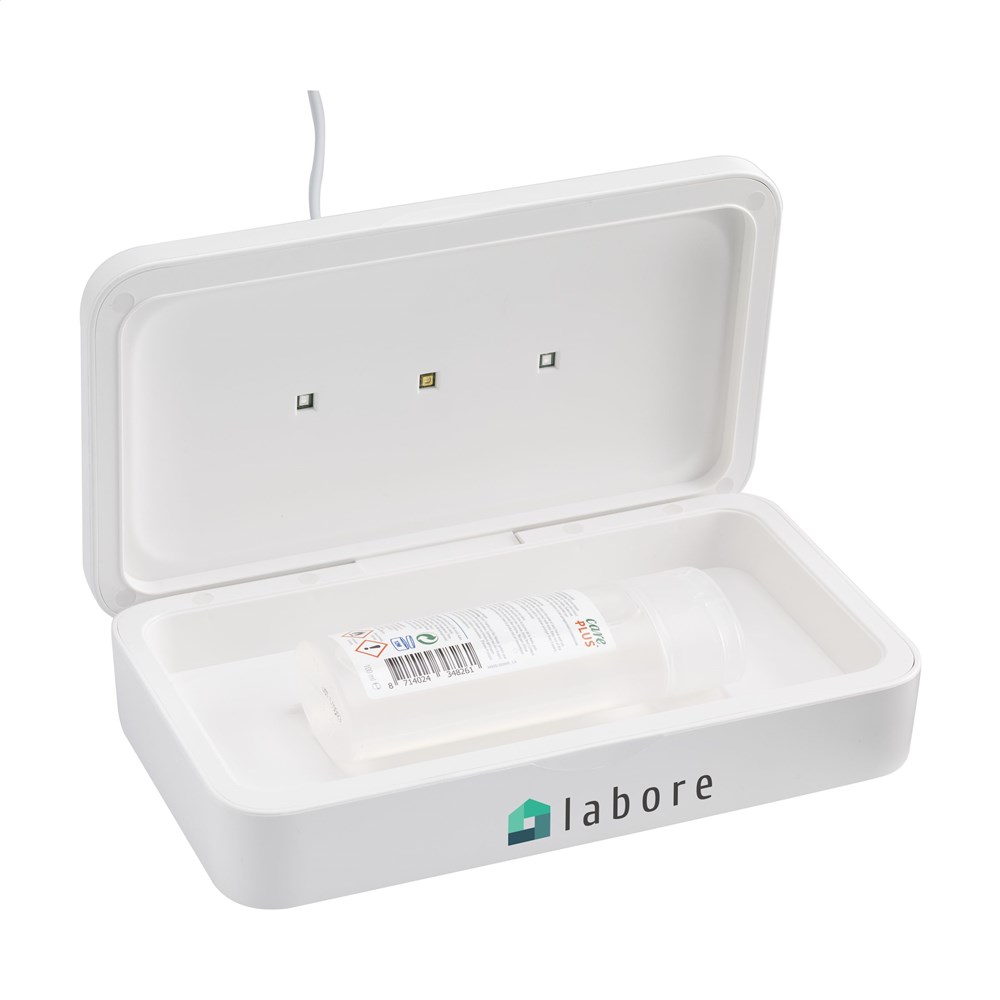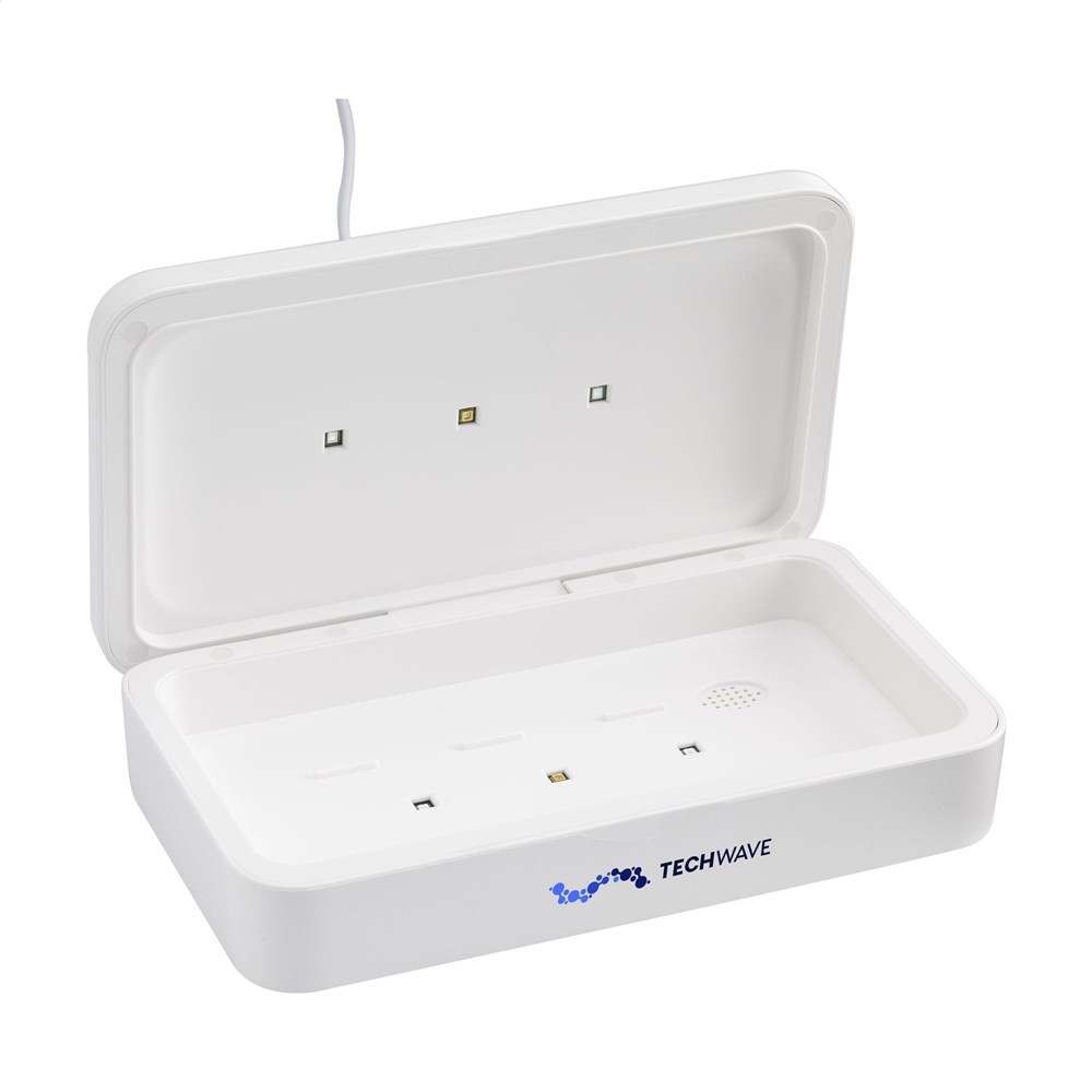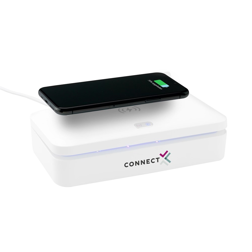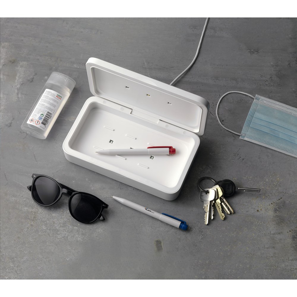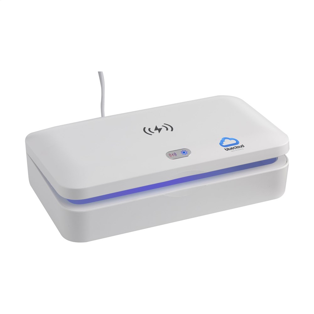 Multifunctionele UV-C-sterilisatiebox met draadloze 5W oplader. Door gebruik van UV-C LED-technologie elimineert de sterilisator binnen slechts 5 minuten (auto cyclus) 99,9% van de bacteriën van voorwerpen die in deze ABS box worden gelegd. Te gebruiken voor o.a. mobiele telefoons, sieraden, sleutels en mondkapjes. Met UV-C LED-lichtjes in de bodem én in het deksel, waardoor reiniging rondom mogelijk wordt en uiterst effectief is (de inhoud hoeft niet omgedraaid te worden). Met ingebouwde veiligheidsfunctie: De box gaat open, de lichten gaan automatisch uit. Hierdoor is blootstelling aan UV-licht uitgesloten. Bovenop de box zit een handige 5W draadloze oplader voor het opladen van mobiele apparaten. Voorzien van handige indicatielampjes. Input: DC 5V/2A. Output: DC 5V/1A (5W) Inclusief Type-C USB-kabel (50 cm) en gebruiksaanwijzing. Per stuk in doos.