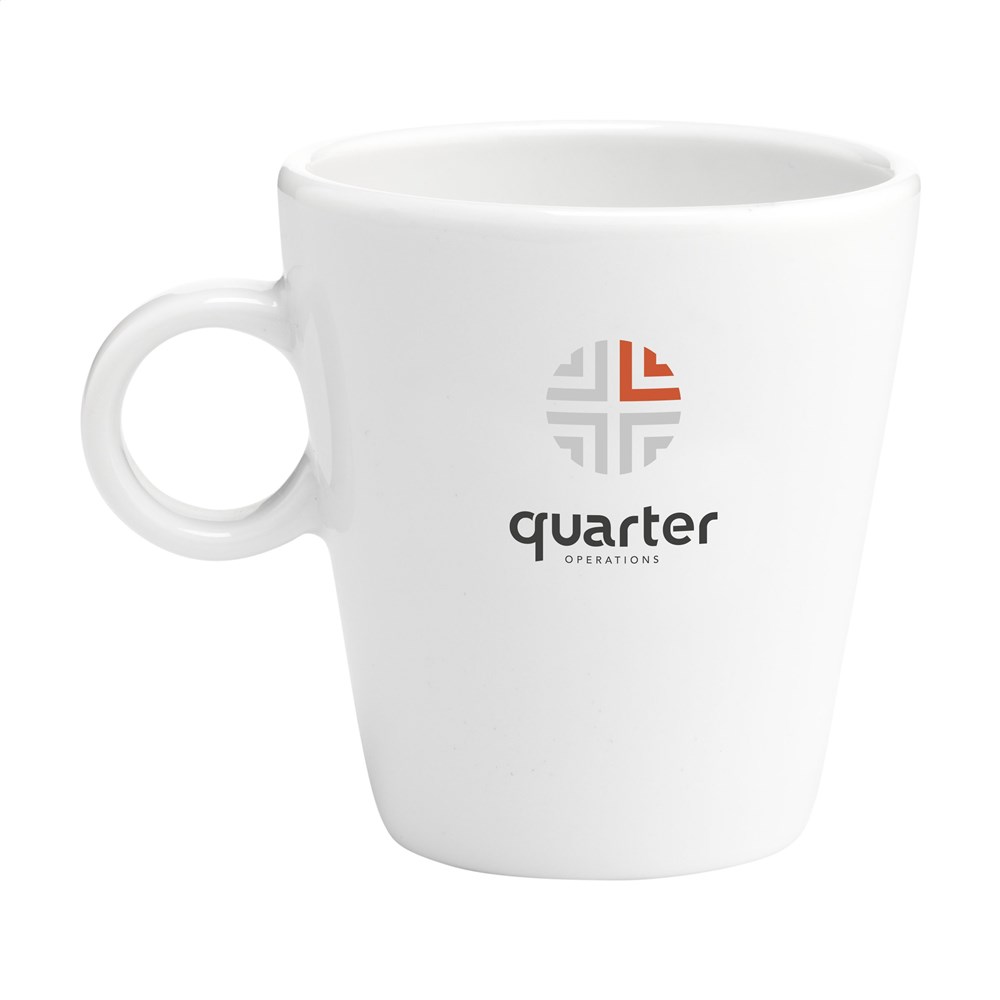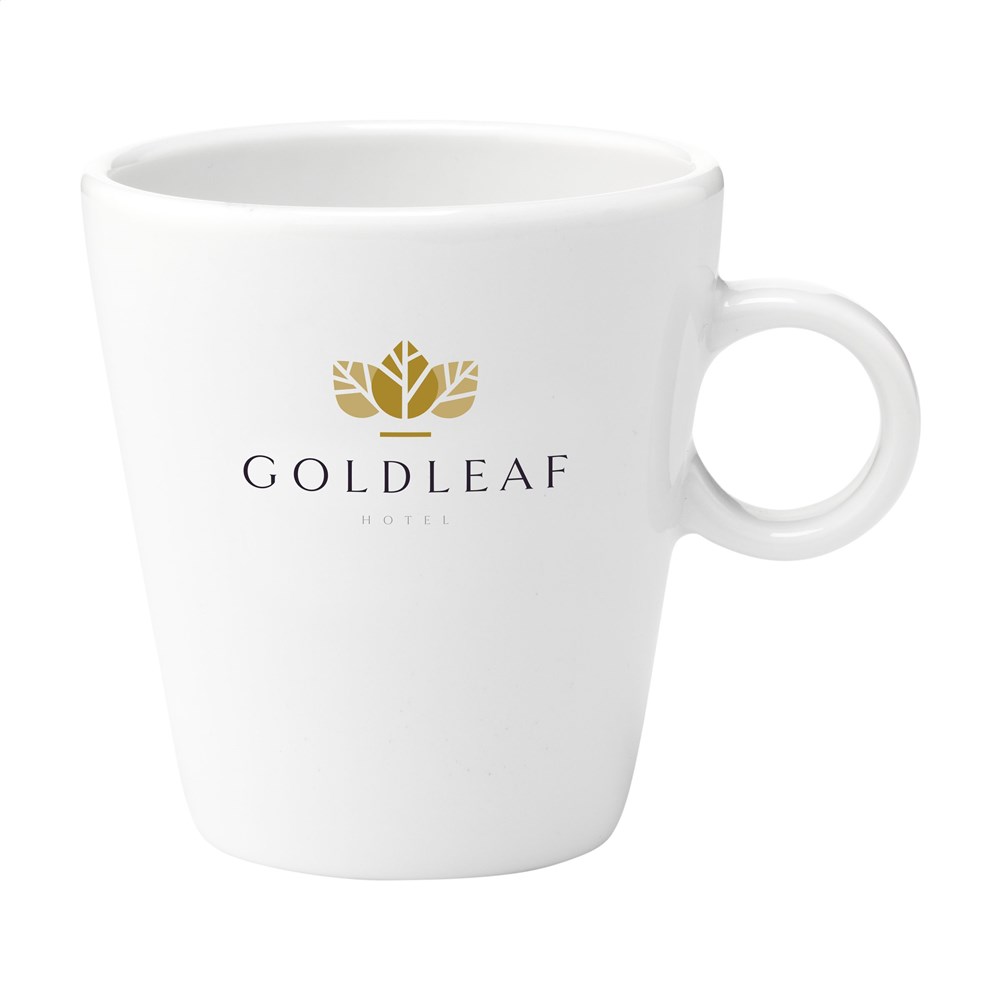 Mok van kwalitatief hoogwaardig porselein. Een mooi en trendy design met opvallend rond oor. Geschikt voor alle koffieapparaten. Vaatwasserbestendig. Inhoud 200 ml. Made in Europe. De opdruk is vaatwasmachine getest en gecertificeerd: EN 12875-2.