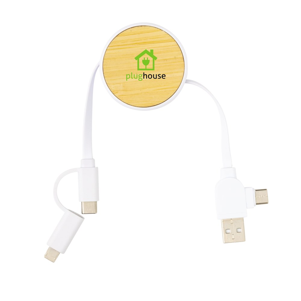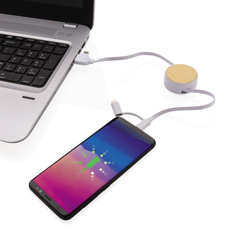 Compacte en gemakkelijk mee te nemen intrekbare multikabel met 5 verschillende connectoren: USB C in, USB A in, type C out, IOS out en micro USB out. Hierdoor kunt u de kabel ook gebruiken met type C-uitvoerapparaten die zijn opgenomen in de nieuwere generatie telefoons en macbook-computers. De kabel heeft ook een USB A-uitgangs ingang, zodat hij elk apparaat vanaf elke uitgangsbron kan opladen. Behuizing gemaakt van bamboe en ABS-kabels gemaakt van PVC-vrij TPE-materiaal. Max kabellengte: 100 cm