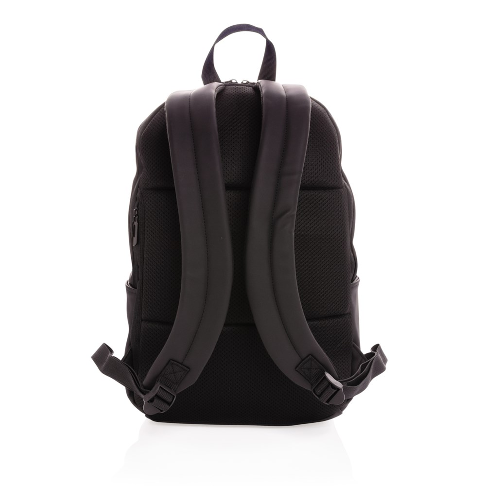 Deze minimalistische, moderne rugzak van glad PU is volledig gevoerd en voorzien van een 15,6 inch laptop vak, een ruim hoofdvak en 2 binnenvakken en 2 pennenlussen. Met mesh gevoerde achterkant en verstelbare bandjes. Buitenkant 100% PU. Binnenkant 100% 210D polyester. PVC-vrij.