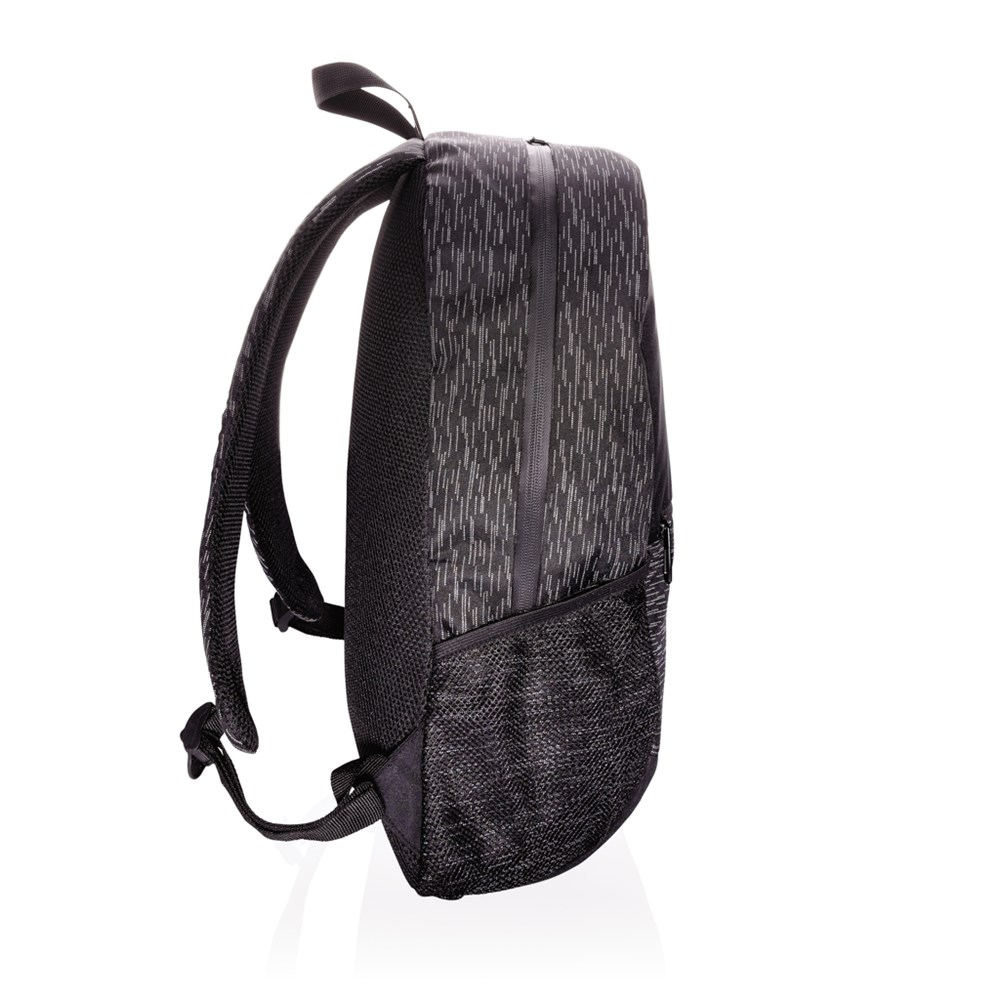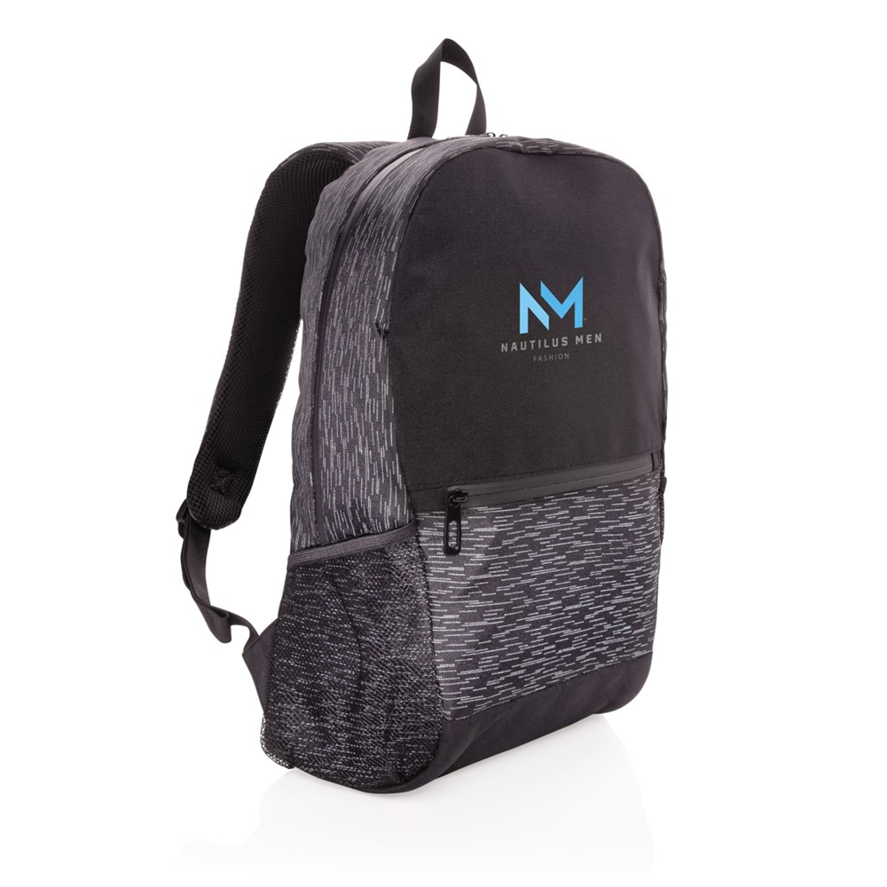 Verhoog je zichtbaarheid in stijl met deze rugzak gemaakt van 100% gerecyclede materialen en AWARE™ tracer. Met AWARE™ worden het gebruik van echte gerecyclede stoffen en claims over watervermindering gegarandeerd door gebruik te maken van de unieke fysieke tracer en blockchain-technologie van AWARE™. Bespaar water en gebruik echte gerecyclede stoffen. De rugzak heeft een moderne allover reflecterende print, een hoofdvak met 15,6 inch laptopvak, een voorvak met ritssluiting en 2 mesh vakken. Verstelbare banden. PVC-vrij. Deze tas heeft 8 liter water bespaard en is gemaakt van 16 plastic flessen.