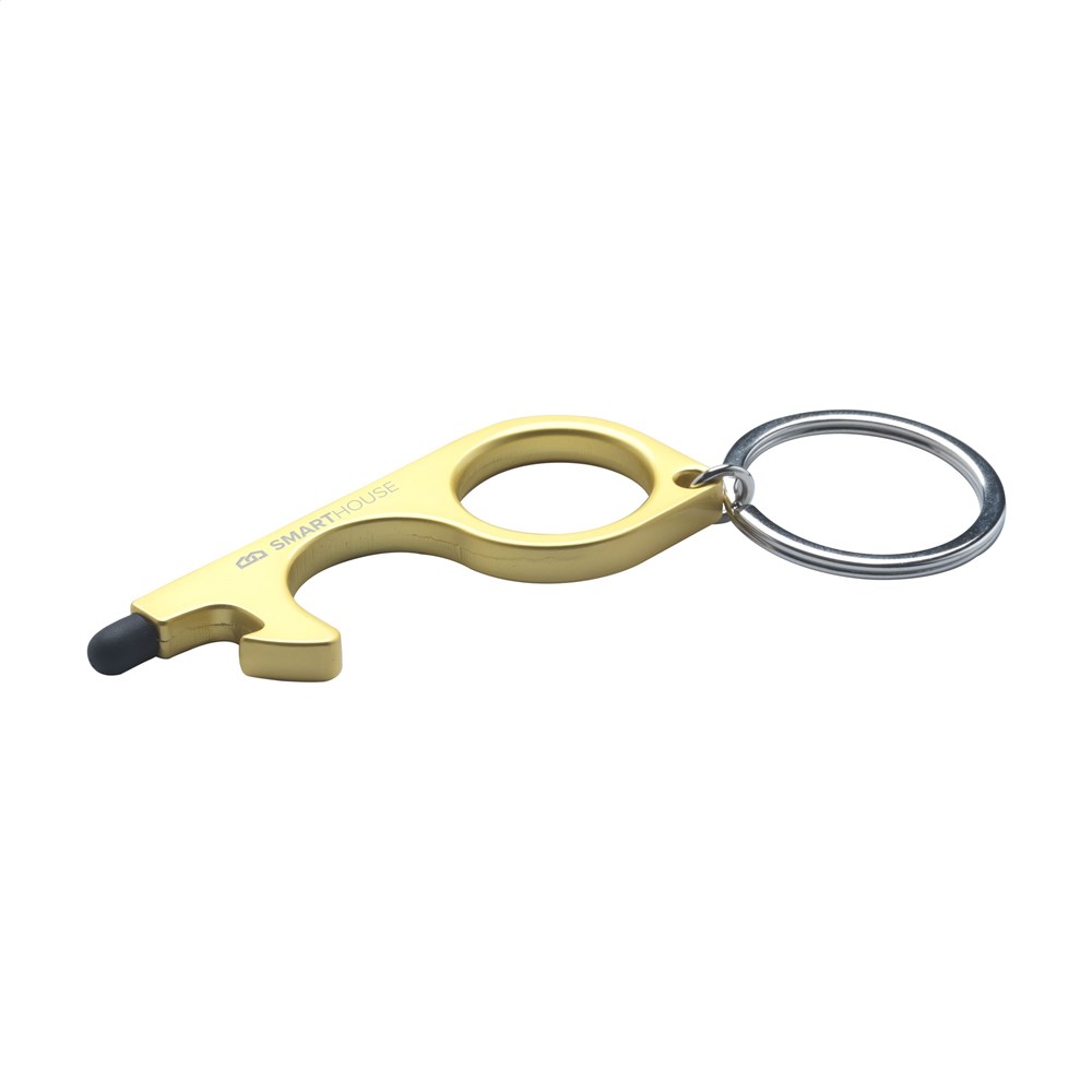 Metalen sleutelhanger met contactloze tool, voorzien van een rubberen touch pointer en een handige flesopener. Aan sleutelring. Door de pointer te gebruiken voorkom je direct contact met oppervlakken van o.a. kassa's, geldautomaten, liftknoppen en digitale displays. Met deze tool open je deuren zonder ze aan te hoeven raken. Bevestig de tool aan je sleutelbos, zodat je zeker weet dat je er in openbare ruimten altijd gebruik van kunt maken.