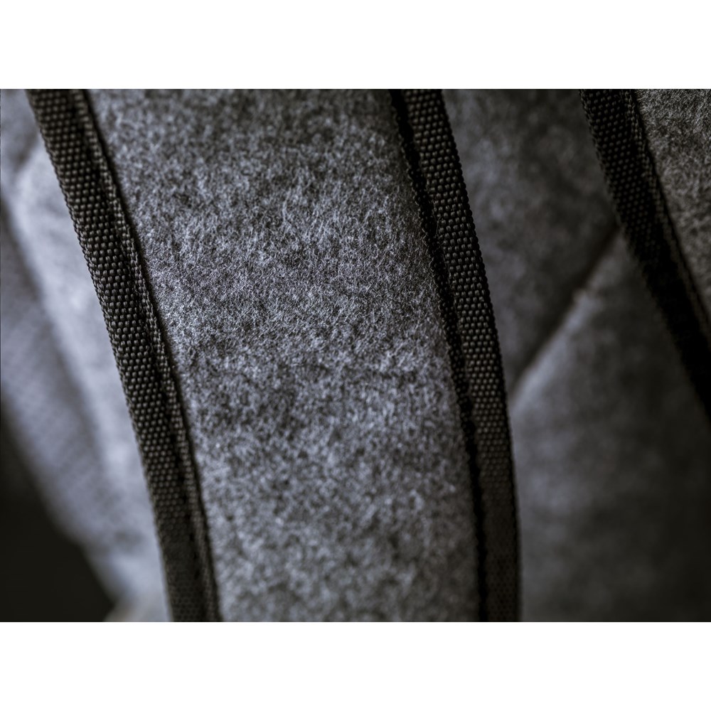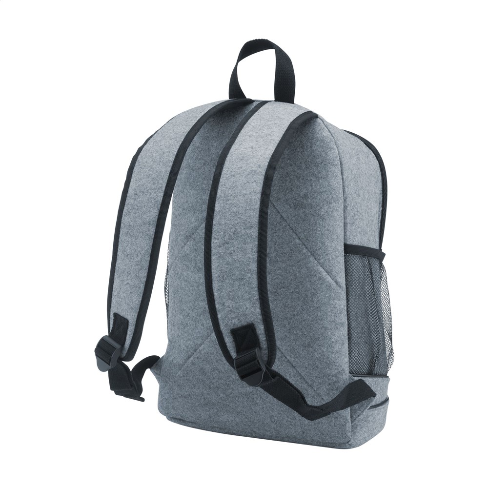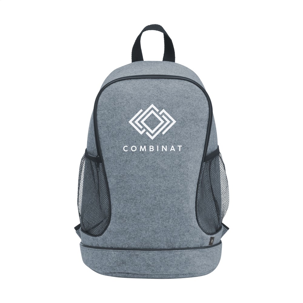 Stoere, praktische rugzak van stevig RPET vilt (gemaakt van gerecyclede PET-flessen). Met royaal hoofdvak, praktische mesh zijvakken, verstelbare en gewatteerde schouderriemen. De tas heeft een gewatteerde rugzijde voor meer draagcomfort en een handige draaglus. Inhoud ca. 22 liter.