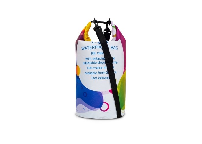 Waterafstotende tas met optionele en verstelbare schouderband. Bescherm bezittingen tegen zand en water op het strand of bij het zwembad. Deze tas wordt naar wens gemaakt en kan all-over bedrukt worden. Korte levertijden. Waterafstotend IPX5, bestand tegen lage druk waterstromen uit alle richtingen. Houd de tas niet onder water.