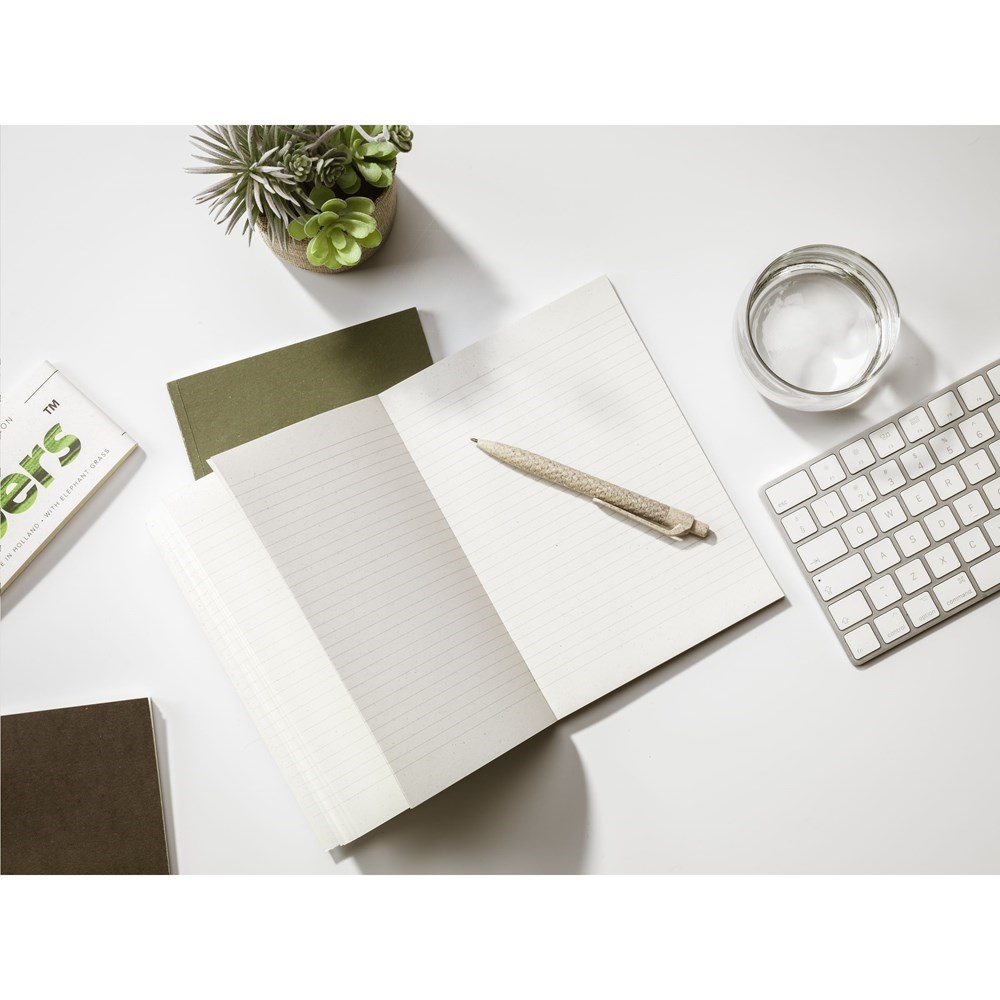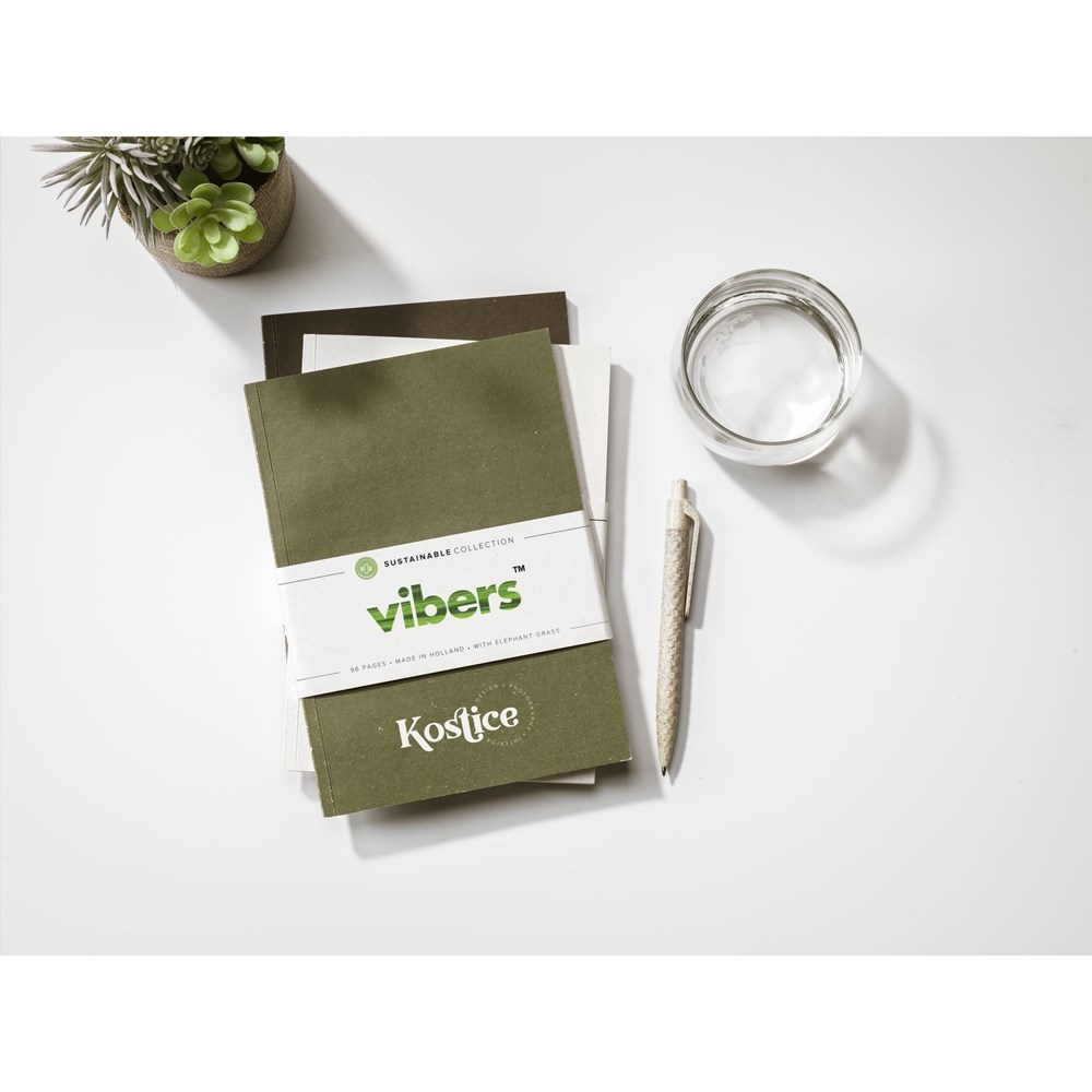 WoW! ECO notitieboek van Vibers™ in A5-formaat met 64 vel gelinieerd, FSC gecertificeerd, crèmekleurig papier (90 gr/m²). Dit notitieboek is gemaakt van olifantsgras. Een bijzondere plant die groeit op schrale Nederlandse grond van braakliggende terreinen. Olifantsgras neemt 4 keer zoveel CO² op als een bos met bomen en groeit zonder het gebruik van bestrijdingsmiddelen en irrigatie. Een verantwoorde keuze voor het noteren van goede ideeën en aantekeningen. Made in Holland.