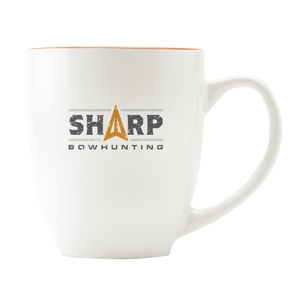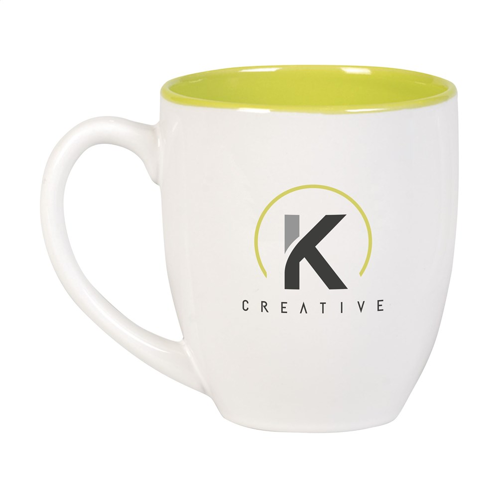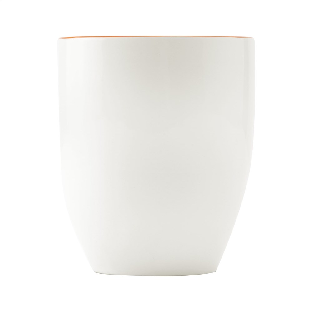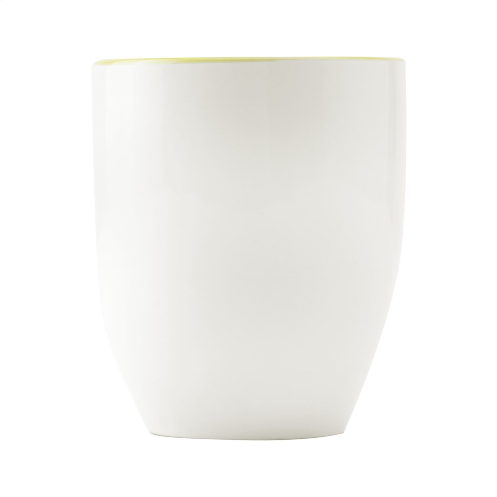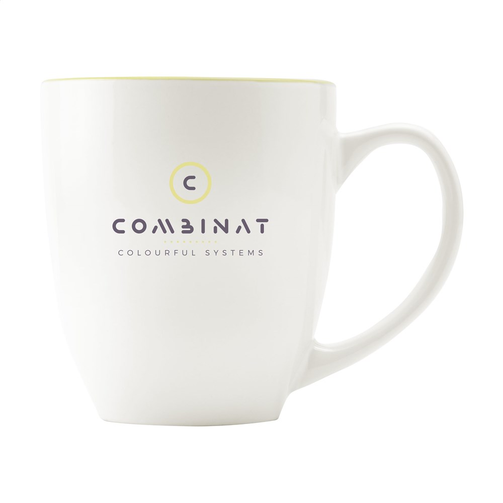 Extra grote mok van hoogwaardig keramiek. In geheel wit óf met een opvallend gekleurde binnenzijde. Inhoud 450 ml. Vaatwasserbestendig. De opdruk is vaatwasmachine getest en gecertificeerd: EN 12875-2.