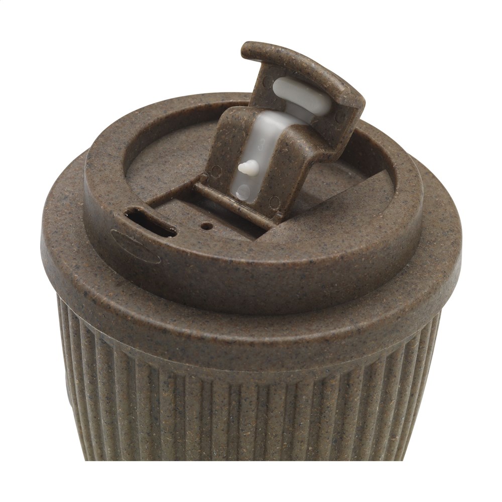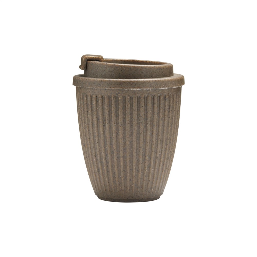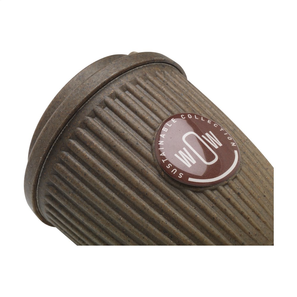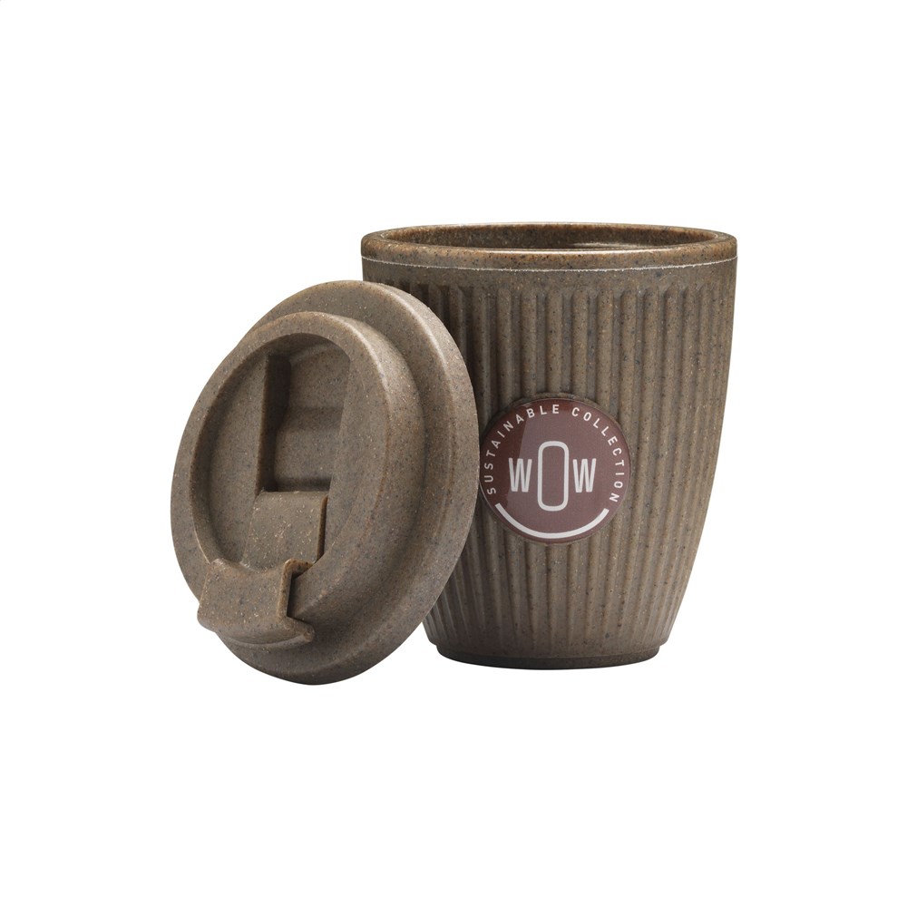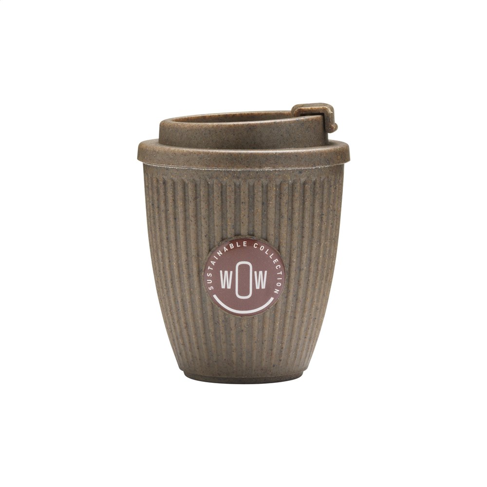 WoW! Deze beker is gemaakt van een mix van gerecyclede koffiedrap en suikerriet! Het deksel, ook gemaakt van koffiedik en suikerriet, kan worden gesloten en is 100% lekvrij. Ideaal voor onderweg. Deze beker heeft een speciale ruimte voor een doming sticker waarmee je de beker naar wens kunt personaliseren. Het is een win-win voor duurzaamheid: aan de ene kant is de beker gemaakt van 100% afval; aan de andere kant is het herbruikbaar, waardoor het gebruik van wegwerpkoffiebekers wordt verminderd. Inhoud 250 ml. Per stuk in kraft doos.