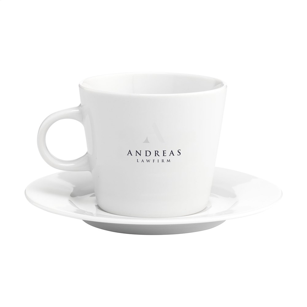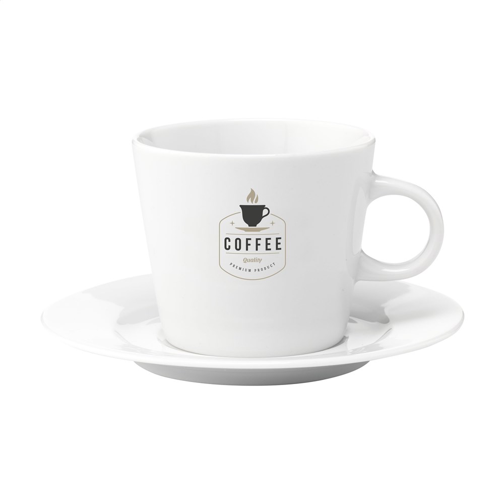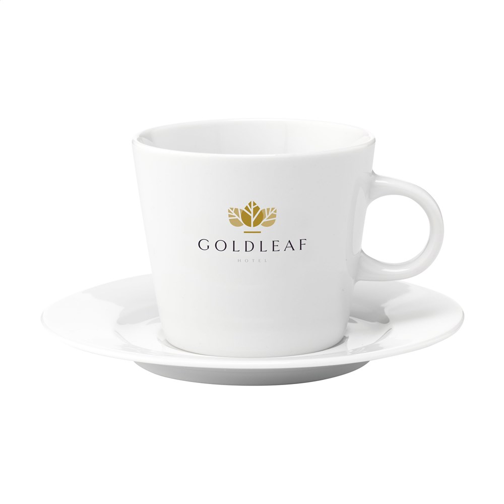 Kop en schotel van kwalitatief hoogwaardig porselein. Een mooi en trendy design met opvallend rond oor. Vaatwasserbestendig. Inhoud 200 ml. Made in Europe. De opdruk is vaatwasmachine getest en gecertificeerd: EN 12875-2.
