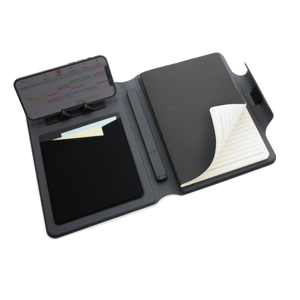 Laad uw mobiele apparaat draadloos op volle snelheid op met dit A5 PU-materiaal notebook met geïntegreerde magnetische 10W draadloze oplader en 8.000 mAh powerbank. Klik uw telefoon (iPhone 12 of hoger) op de draadloze oplader en de telefoon zal perfect uitgelijnd zijn met de magneten binnenin. De 10W draadloze oplader is compatibel met alle QI-apparaten (Iphone 8 en hoger en Android-apparaten) Type-C-input 9V / 2A ; Draadloze output 9V / 1.1A; Type-C-input 9V/2A. Het notitieboek bevat 64 vellen / 128 pagina's 80 g / m2 gelinieerd papier. Met telefoon- / tabletvak en pennenlus. 19 stuks hoge kwaliteit N52H hittebestendige magneten geïntegreerd. Geregistreerd ontwerp.