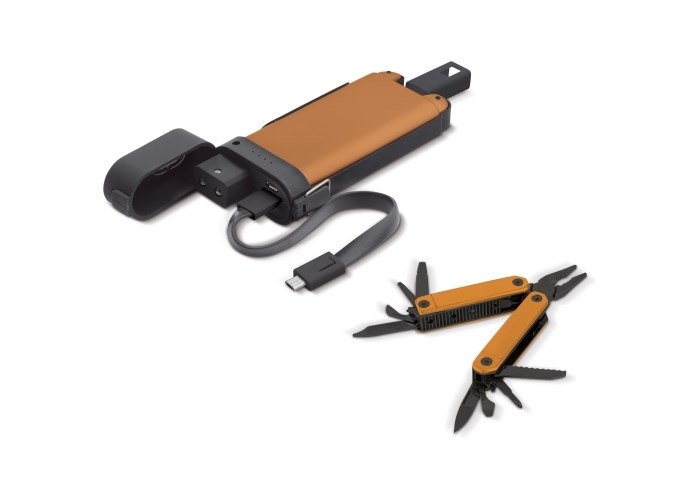 Adventure set met powerbank en zaklamp plus een robuuste multi-tool. De powerbank heeft een capaciteit van 5000mAh. Verpakt in mooie geschenkverpakking.