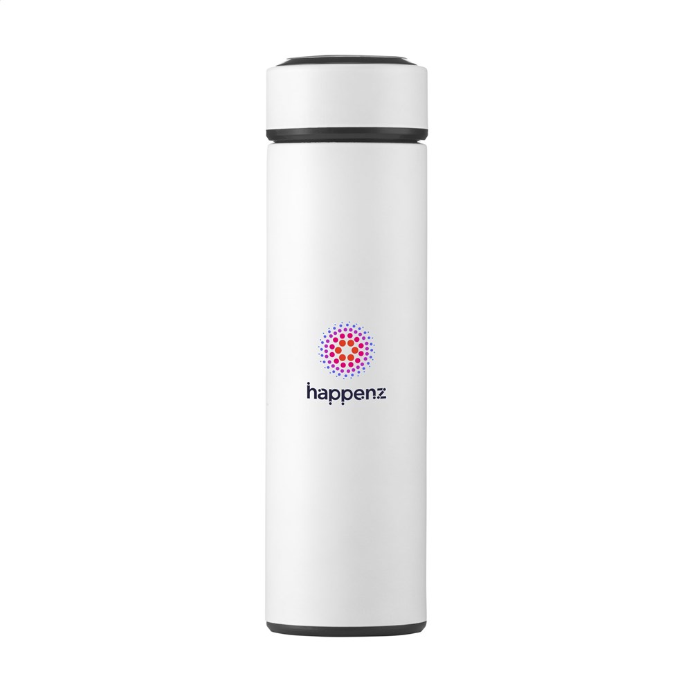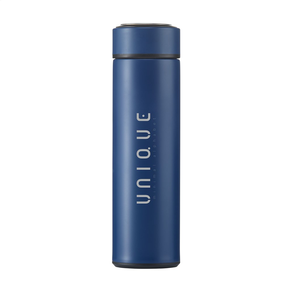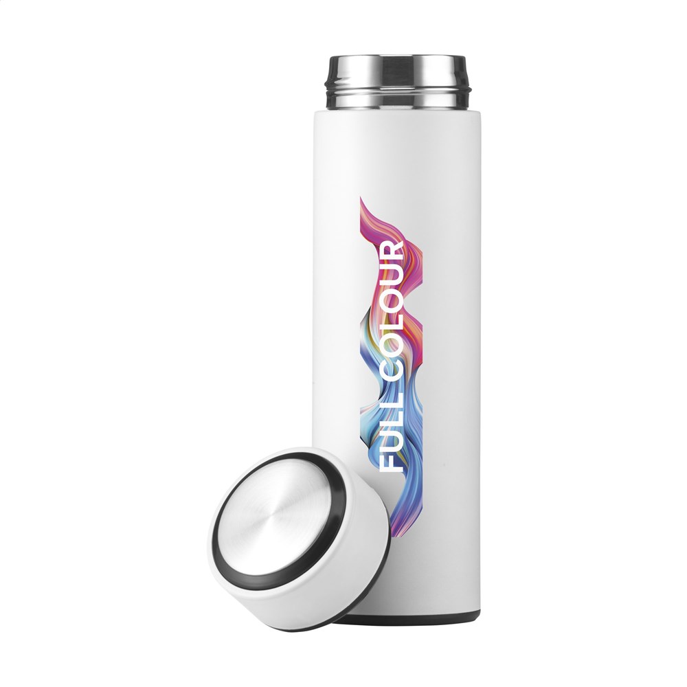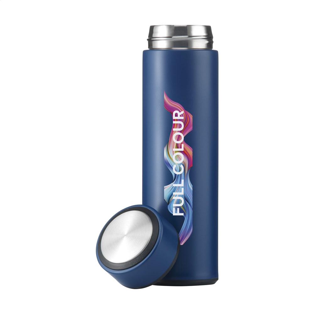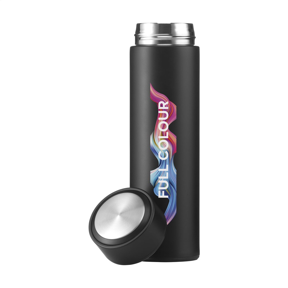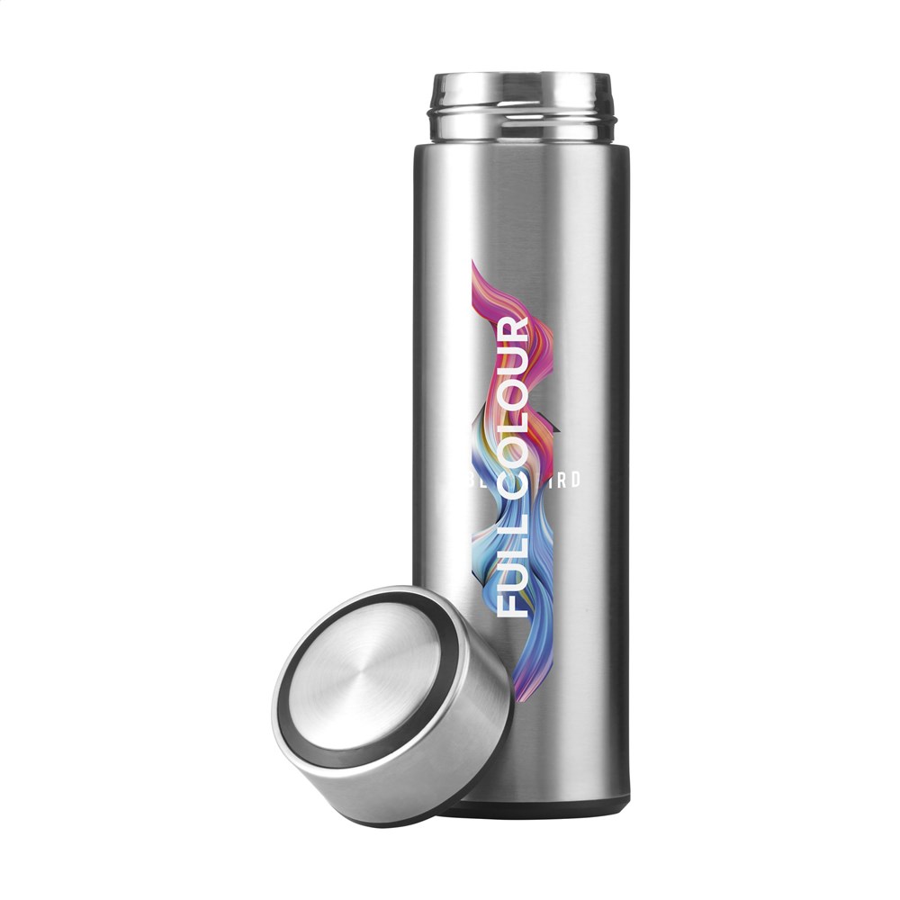 Slanke, stijlvolle dubbelwandige vacuümgeisoleerde RVS waterfles/thermosfles met geborstelde RVS schroefdop. Geschikt voor het op temperatuur houden van koude of warme dranken. Lekvrij. Inhoud 450 ml. Per stuk in doos.