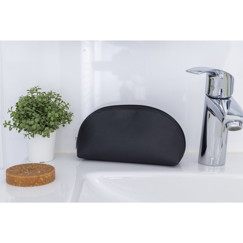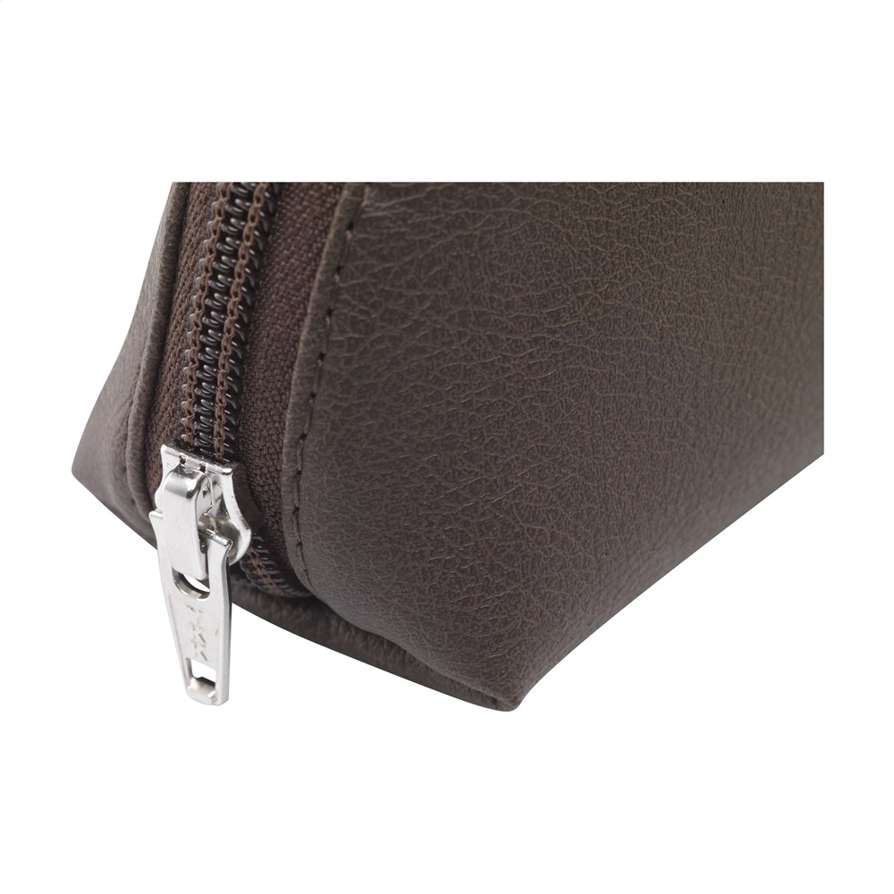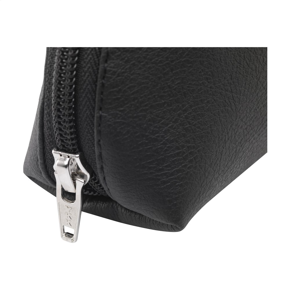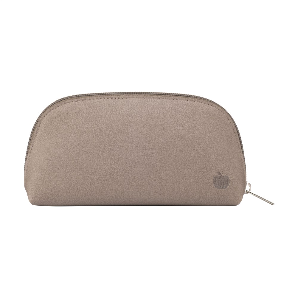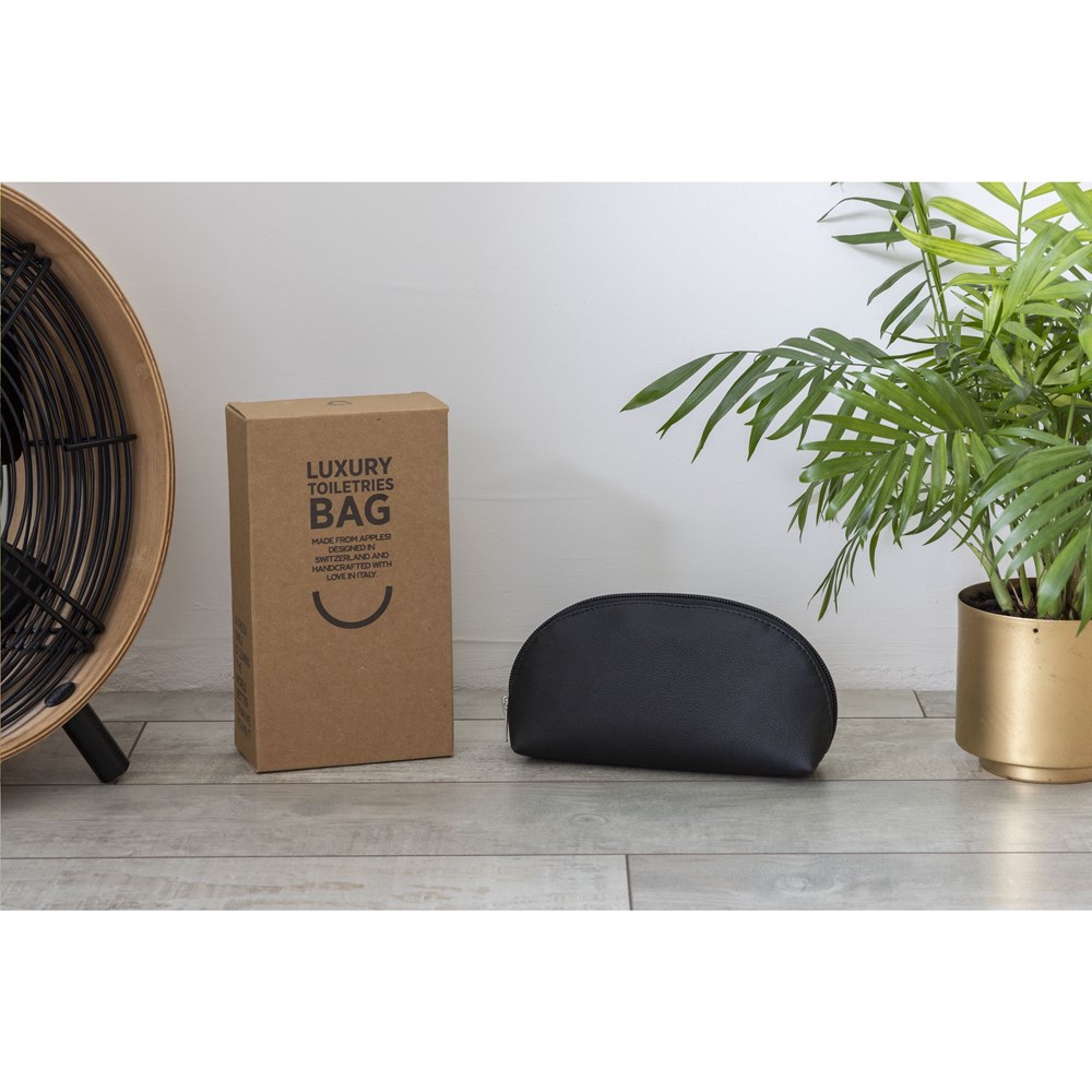 WoW! Een toillettas die er uitziet als leer, maar gemaakt is van appels. Deze innovatieve technologie is zowel duurzaam als vegan. Hoe dit werkt? Als er van appels bijvoorbeeld appelsap gemaakt wordt, blijft er veel pulp achter. Dit pulp is de basis voor het maken van dit ‘leer’. De textuur en de kleuren worden aan het meel toegevoegd en het materiaal dat daaruit ontstaat is geschikt om mee te naaien. Zwitsers design, geproduceerd in Italië. Dit product is ook geschikt als pennenetui. Optioneel: Per stuk in kraft doos.