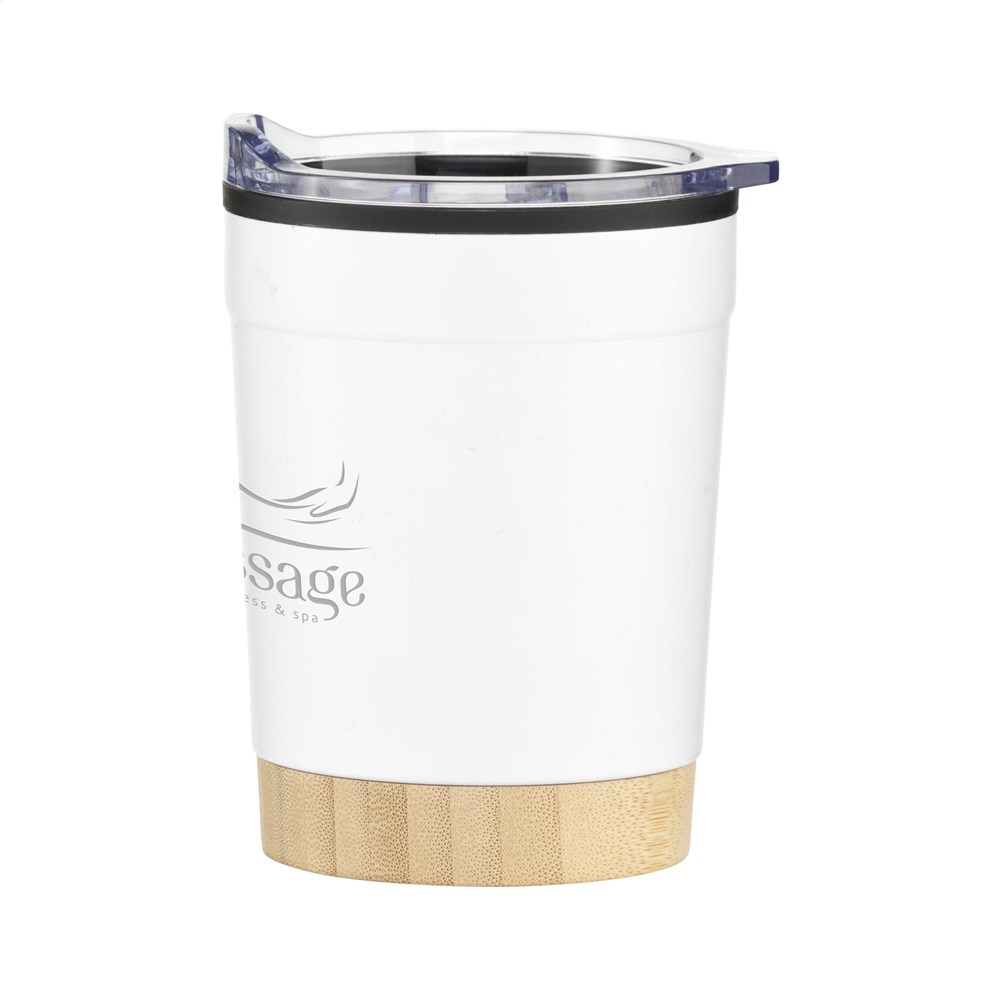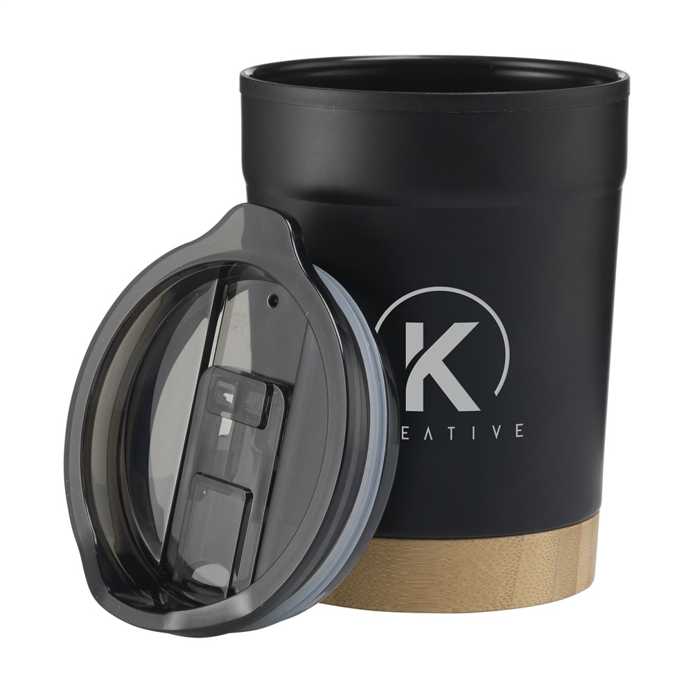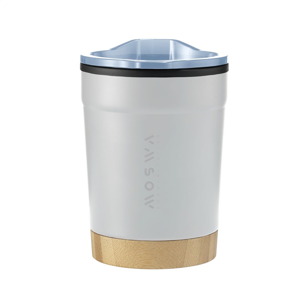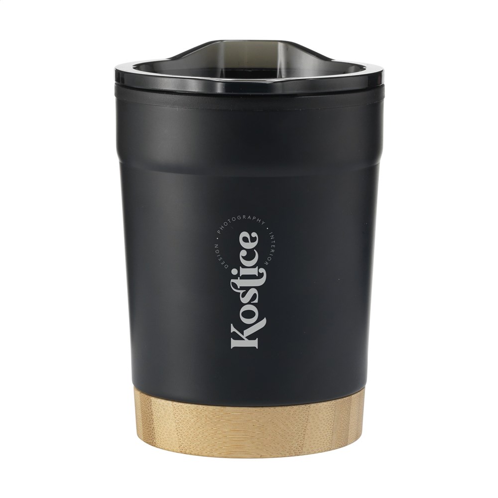 Dubbelwandige thermosbeker met RVS buitenwand en PP binnenwand. De beker heeft een zwart transparante push-on deksel met afsluitbare drinkopening. Een opvallend mooi detail is de bamboe onderzijde met een dikte van 1,5 cm. Inhoud 350 ml. Per stuk in doos.